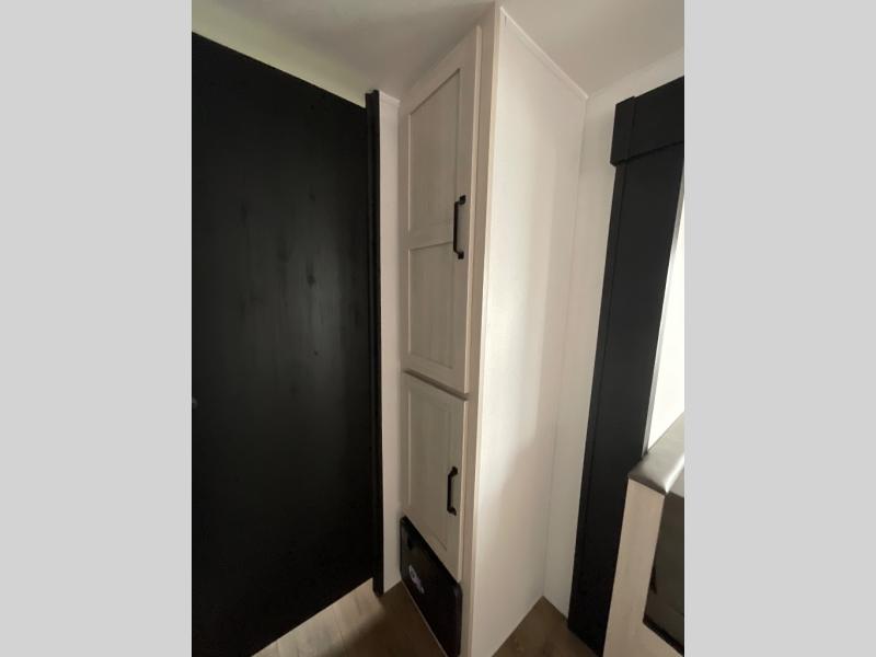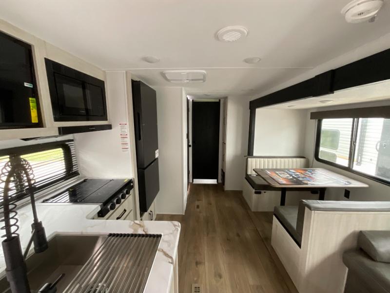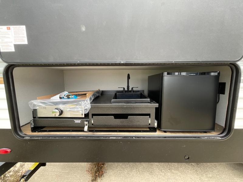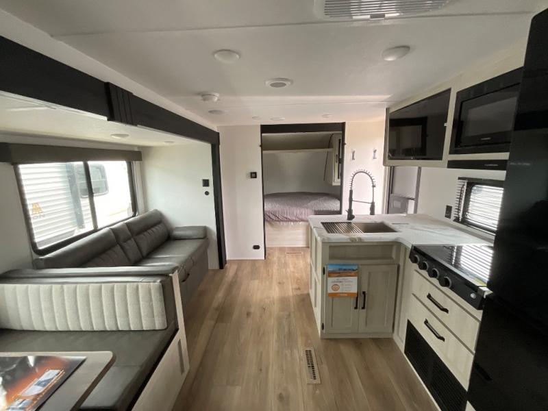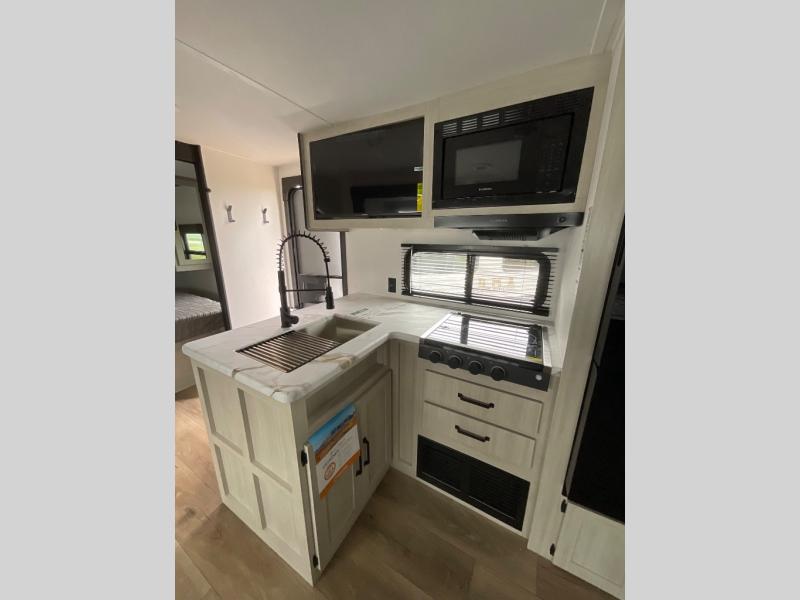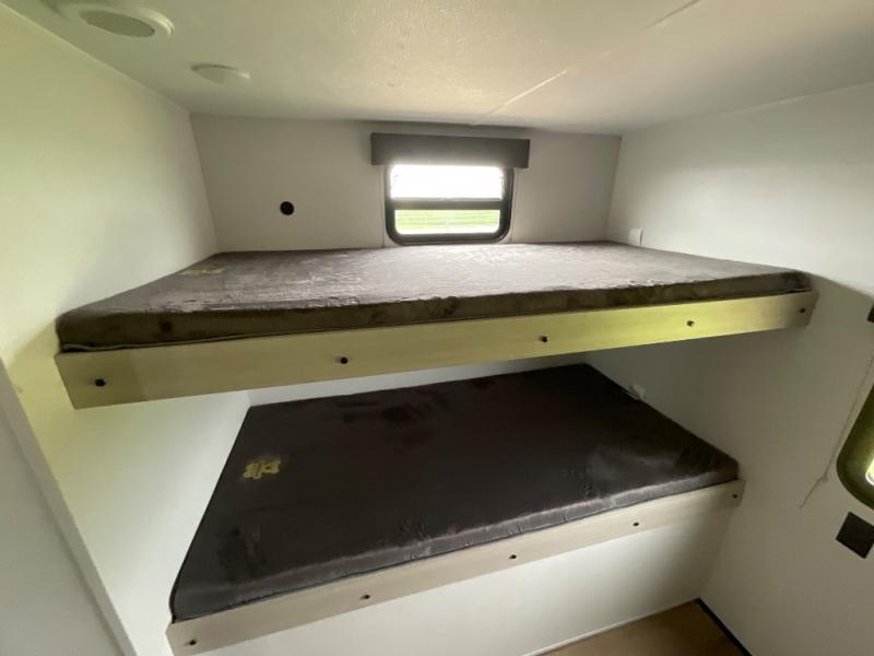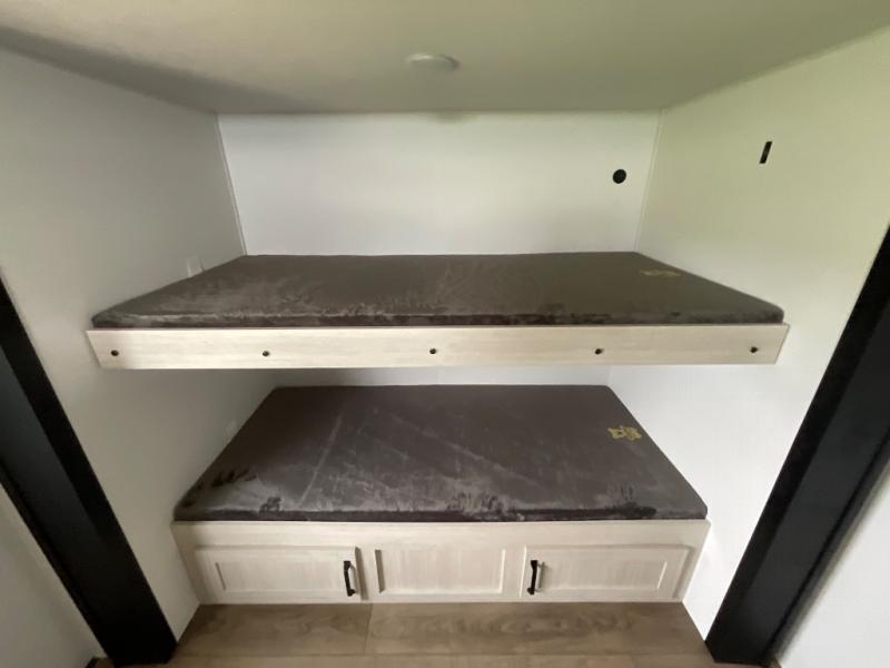 If you're looking for more space, this double axle, double slide out unit is perfect for your group of eight. Within the large slide in the living room, you'll find the booth dinette and sofa, which sit across from the optional TV if you want to enjoy movie nights. The full kitchen includes a stainless microwave and three burner cooktop to make meals, plus a pantry and 12V refrigerator for food storage. And an optional outside kitchen with a griddle can be added if you enjoy cooking outdoors! Your guests or littles are sure to enjoy the rear private bunkhouse that features a set of 38" x 76" bunks across from the third bunk and jiffy sofa within a slide out!