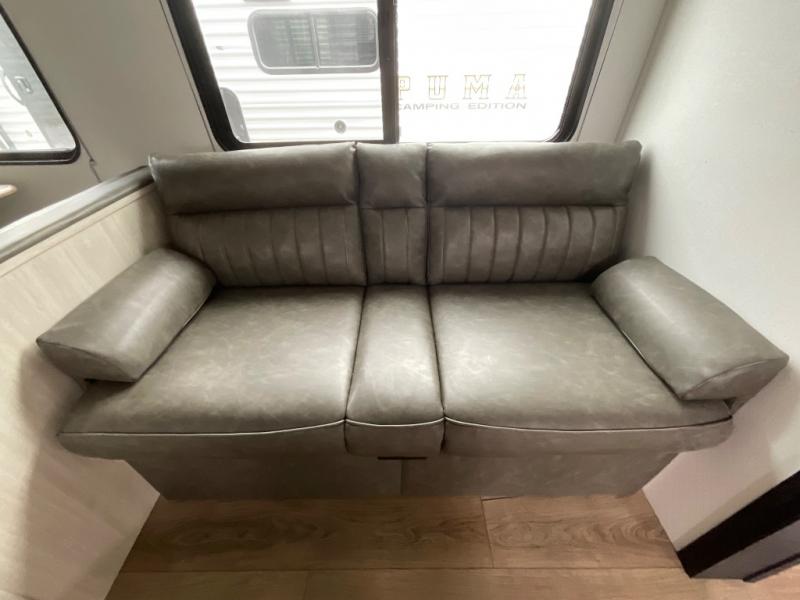 The Puma Camping Edition by Palomino offer an affordable travel trailer for rookie campers or seasoned RVers! They are built with 5/8" tongue and groove plywood flooring and a front diamond plate for added protection. There are also exterior clamp style door latches, back up camera prep, and 20 lb. LP bottles. Head inside to find Thermofoil countertops with a smooth drop edge, bedroom USB ports and outlets, and a GE appliance and kitchen package.