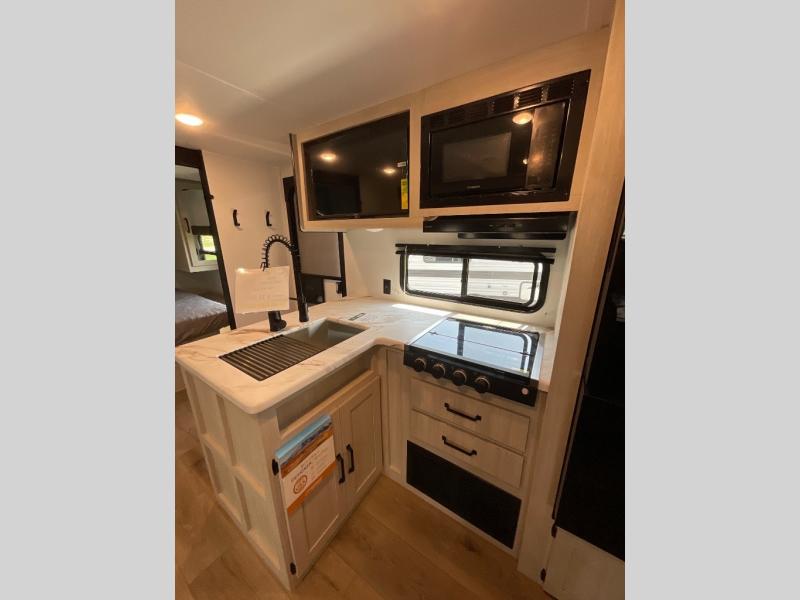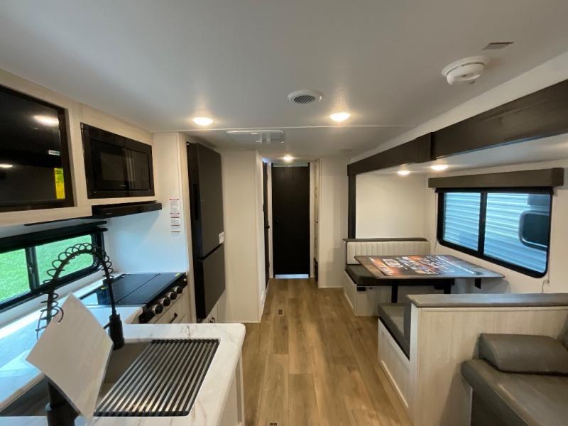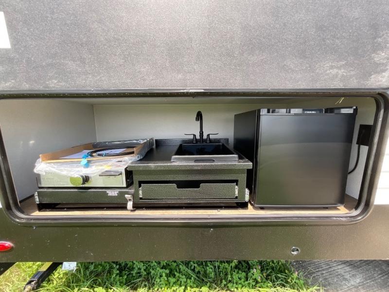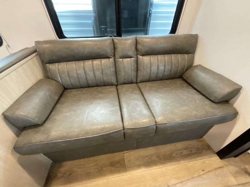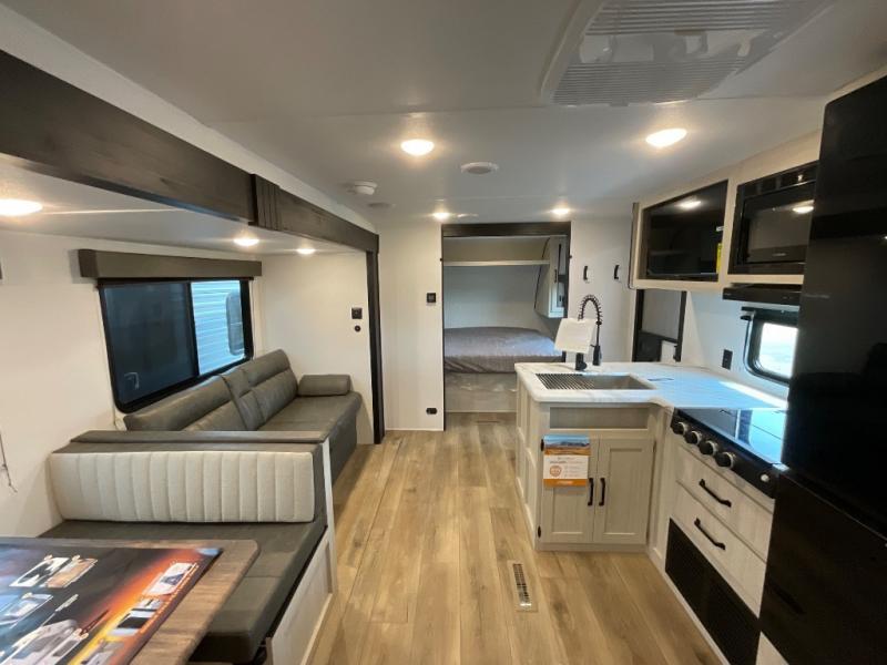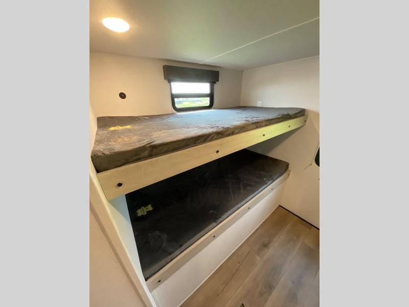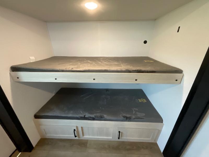 If you're looking for more space, this double axle, double slide out unit is perfect for your group of eight. Within the large slide in the living room, you'll find the booth dinette and sofa, which sit across from the optional TV if you want to enjoy movie nights. The full kitchen includes a stainless microwave and three burner cooktop to make meals, plus a pantry and 12V refrigerator for food storage. And an optional outside kitchen with a griddle can be added if you enjoy cooking outdoors! Your guests or littles are sure to enjoy the rear private bunkhouse that features a set of 38" x 76" bunks across from the third bunk and jiffy sofa within a slide out!