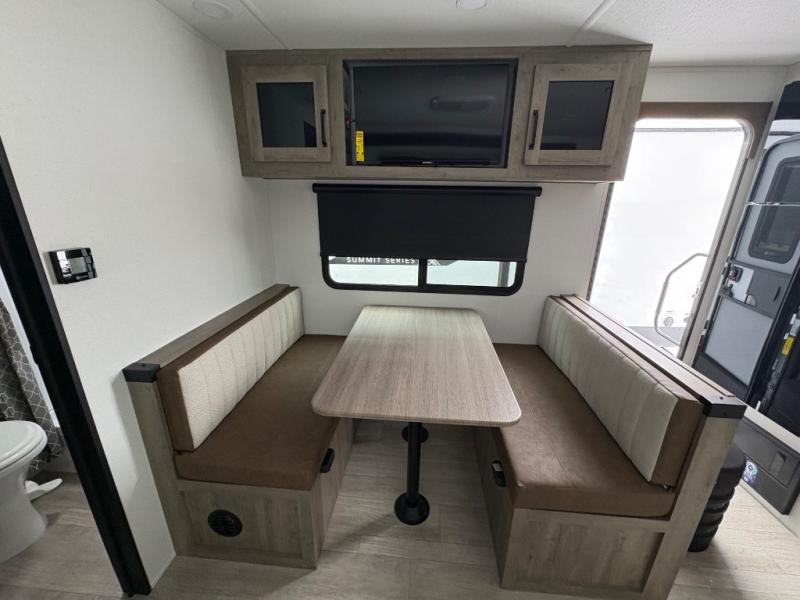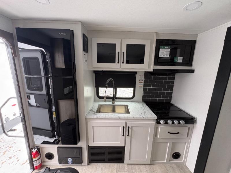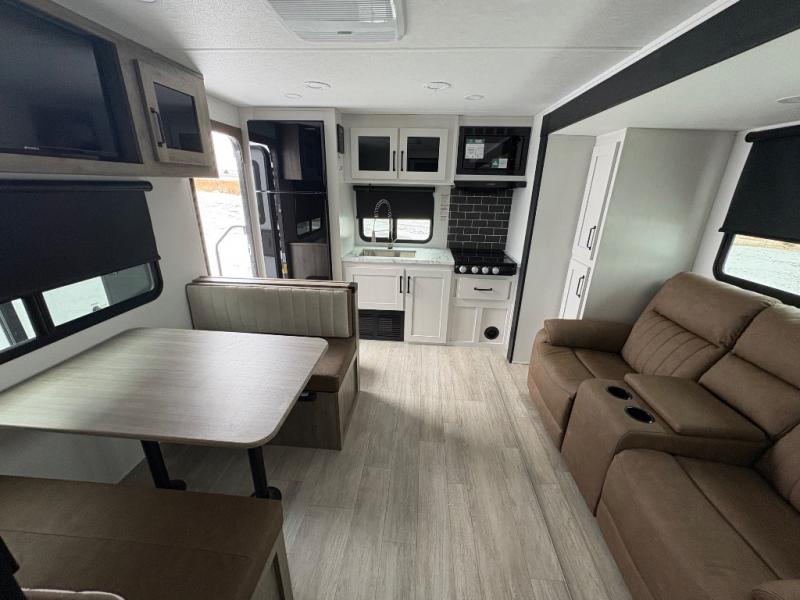 Enjoy time at the campground in this rear kitchen travel trailer. You'll find a cooktop and microwave here, along with a pantry and 11-cu. ft. electric refrigerator to keep your food fresh. There is a booth dinette to dine at plus a sofa sleeper slide out for more seating and sleeping space for guests. The walk-thru bath leads to the front master bedroom where you'll enjoy a 60" x 74" RV queen bed and dual bedside wardrobes to keep your things tidy. Outside, more storage space is found in the pass-thru, and there is a 17' power awning with LED lights where you can visit with friends!