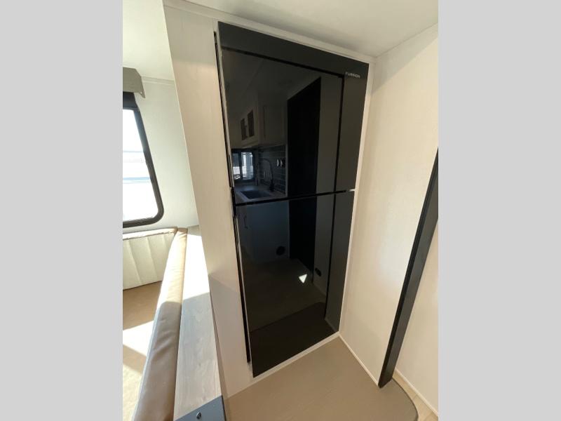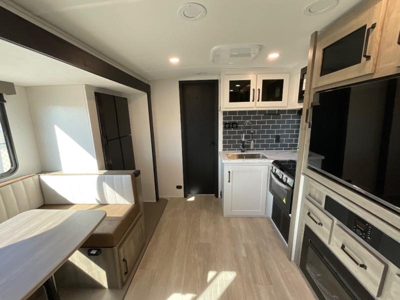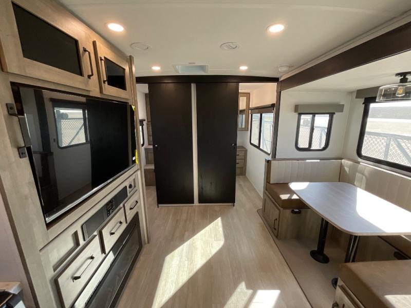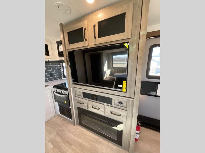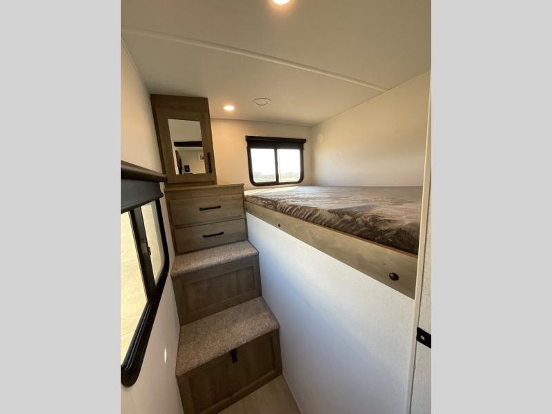 Camping with friends and family just got easier in this spacious travel trailer for six! You'll have your own master bedroom up front with a queen bed, dual wardrobes, and your own private entrance into the walk-thru bath. The unique private bunkhouse in the back features privacy doors and a bunk on each side, along with a nightstand and wardrobe, giving your guests or older children their own space! In the morning, everyone can meet in the combined kitchen and living area as the chef of your group makes breakfast, and there is a U-shaped dinette slide where you can dine together. This unit also includes an entertainment center with a TV, fireplace, plus a hidden pantry behind the TV for snacks, board games, movies and more!