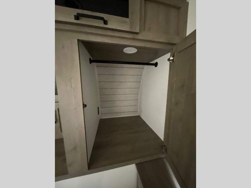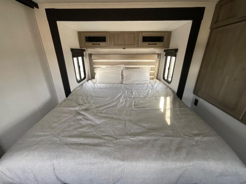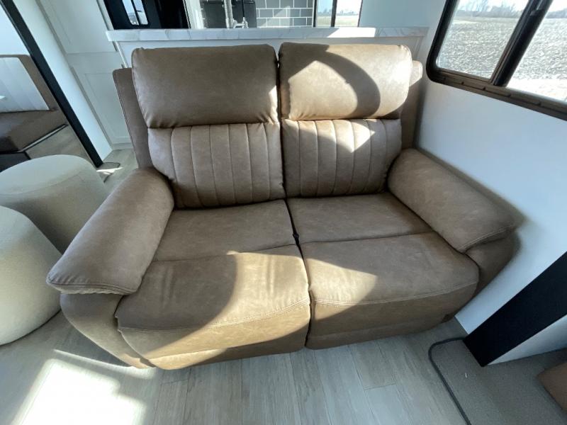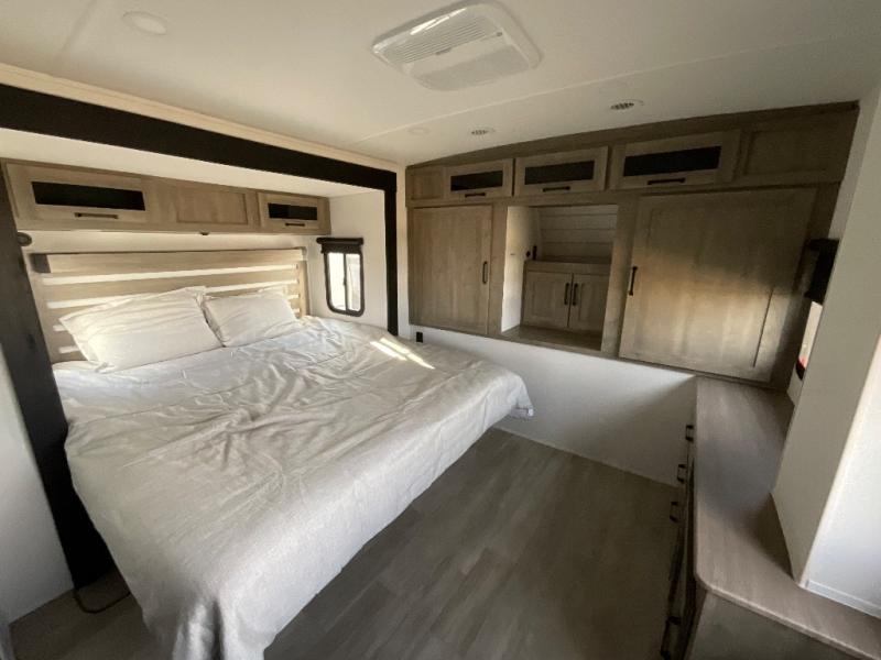 One look at this spacious travel trailer and you'll be sold! The rear kitchen features a U-shaped counter, an 11-cu. ft. refrigerator, plus a pantry for dry goods and snacks. There is a 1/2 dinette with bench seating, plus a tri-fold sofa and two theater seats. Everyone can take turns cleaning up in the full bath that includes a shower with a seat, then head outdoors to relax under the patio awnings with LED lights. When it's time for bed, you will enjoy the king bed slide out in the front bedroom. You'll also find a dresser and a closet here, plus a wardrobe with washer and dryer prep if you choose to add those appliances!