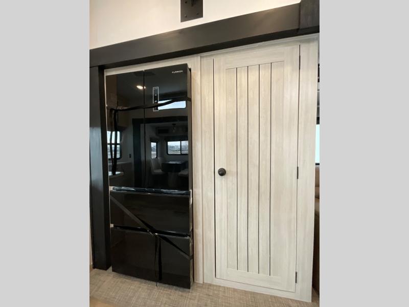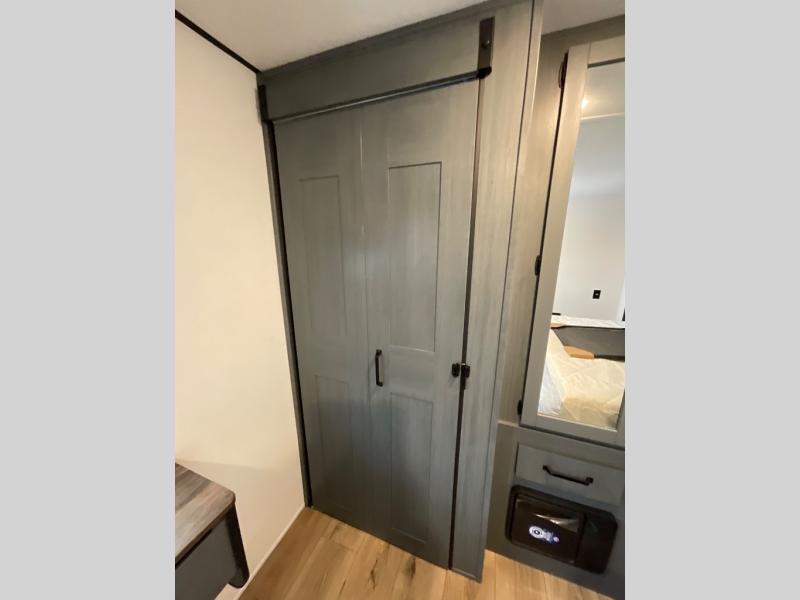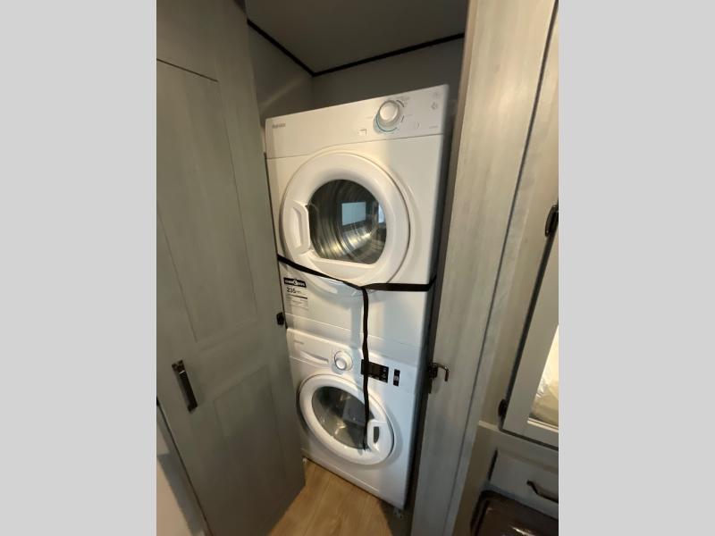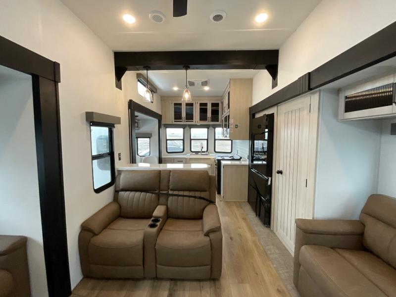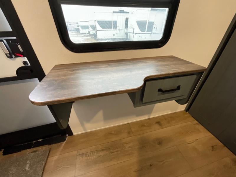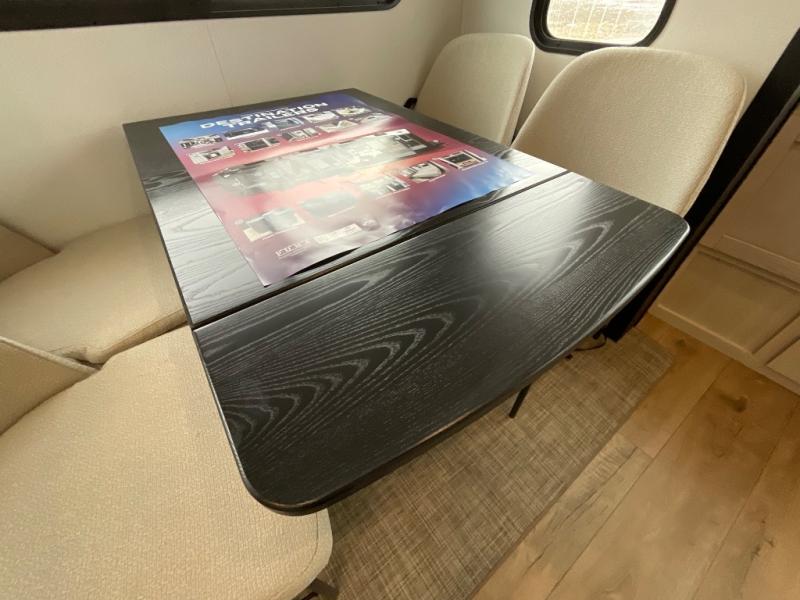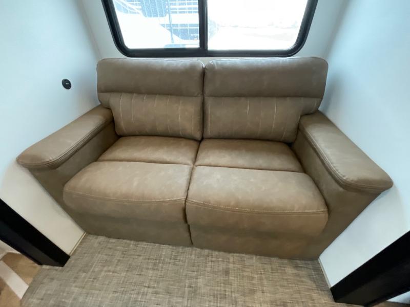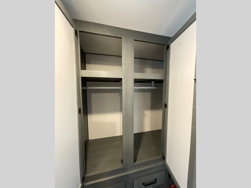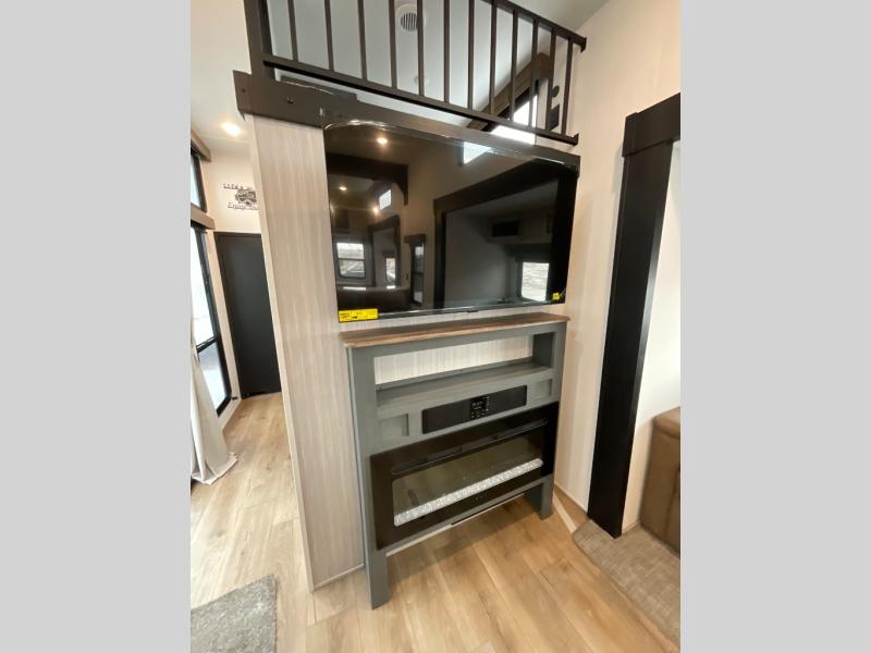 This is the perfect destination trailer for a larger group since it can sleep up to nine campers each night. The little ones will love the double loft areas with three bunk mats and storage space for their things, while you take the rear private bedroom. There is a king bed slide out here, along with a wardrobe/closet for your clothes, plus a second closet with washer and dryer prep. Everyone can meet in the middle living room to relax on the dual opposing sofas or theater seating across from the fireplace and entertainment center. Head to the front of the unit where you'll find the kitchen that includes ample counter space to prep meals, a residential style refrigerator and pantry for food storage, and a free-standing table to dine at. There is also a breakfast nook that overlooks the living area so you can visit with the cook and watch a movie at the same time!