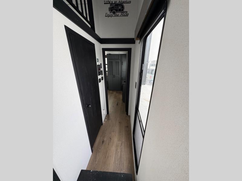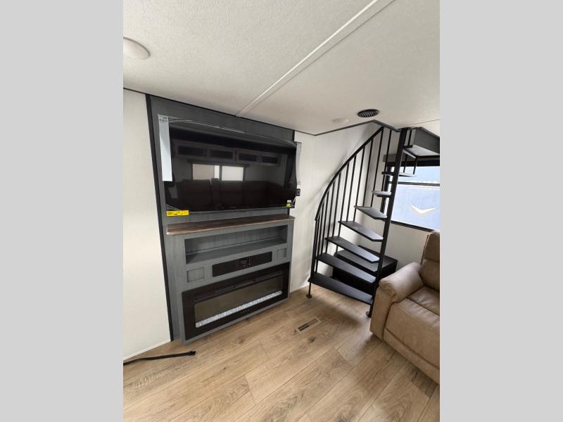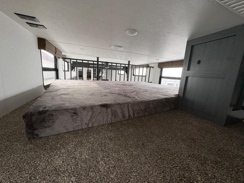You won't believe the amount of comfort found in this destination trailer! There are two separate loft areas; one up front with a ladder, two bunk mats, a nightstand, cabinet, and bookshelf storage, and one in the back with steps, two bunk mats and a cabinet for storage! On the main level, you'll find your own space in the front private bedroom, complete with a king bed slide, a countertop, dresser, and even washer and dryer prep. And the full bath is right next to the bedroom for easy nighttime use. Head to the full kitchen to make meals on the four-burner stove, store food in the pantry and residential-style refrigerator and dine at the large kitchen island with four chairs. The rear living area will be a favorite hangout spot with its L-shaped sofa with recliners and an ottoman, along with an entertainment center with a smart TV and fireplace!