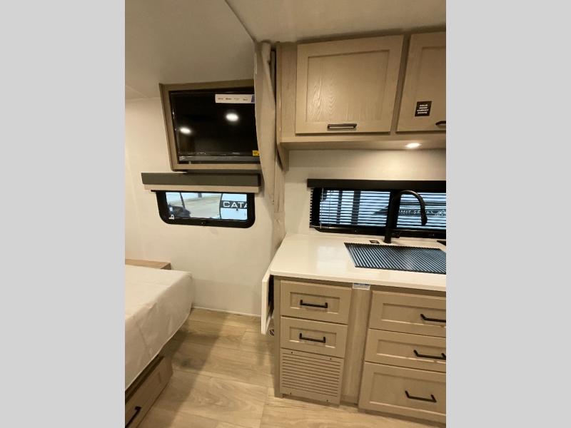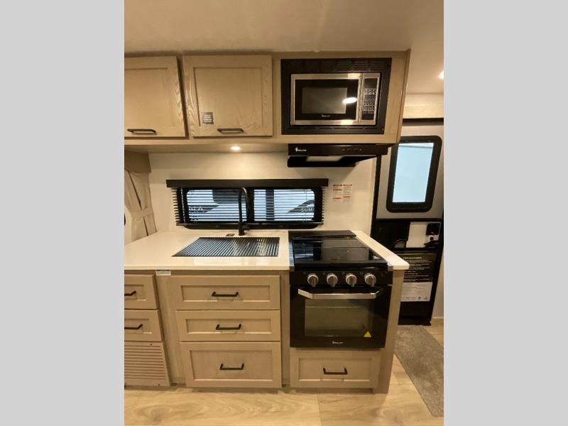 Wherever you decide to camp, you will love every minute in this cute couple's trailer. The sofa slide with a table will provide a place to relax, eat, and even sleep an extra guest if you have one, and the front RV queen bed includes a privacy curtain to enjoy your own space. There are dual bedroom wardrobes to keep your clothes tidy, and you'll find two pass-through storage compartments for your larger gear. An outside griddle with an LP hookup will allow you to make breakfast outdoors, and there is a three burner cooktop indoors if the weather isn't cooperating. Since there is a full bath on board you won't have to use the camp's facilities, and you can make it a movie night with the 32" TV in the main living area!