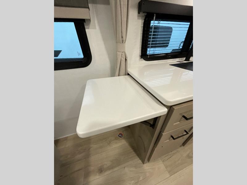 Wherever you decide to camp, you will love every minute in this cute couple's trailer. The sofa slide with a table will provide a place to relax, eat, and even sleep an extra guest if you have one, and the front RV queen bed includes a privacy curtain to enjoy your own space. There are dual bedroom wardrobes to keep your clothes tidy, and you'll find two pass-through storage compartments for your larger gear. An outside griddle with an LP hookup will allow you to make breakfast outdoors, and there is a three burner cooktop indoors if the weather isn't cooperating. Since there is a full bath on board you won't have to use the camp's facilities, and you can make it a movie night with the 32" TV in the main living area!