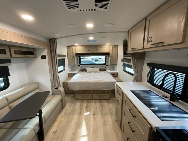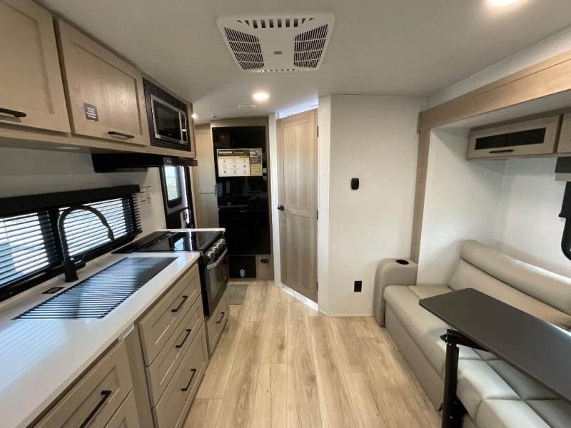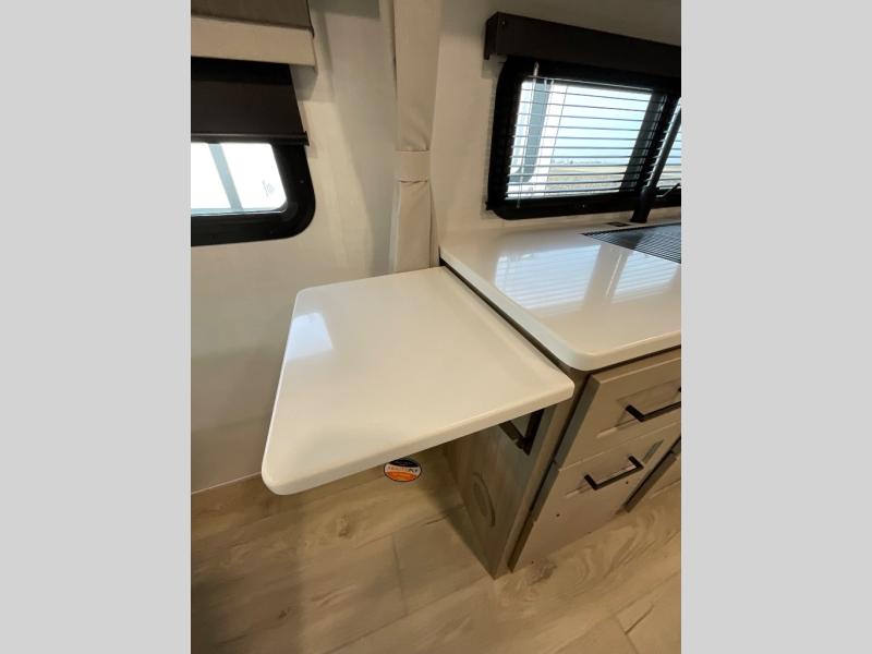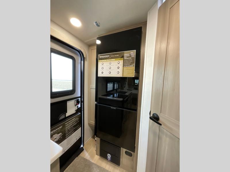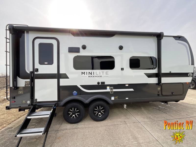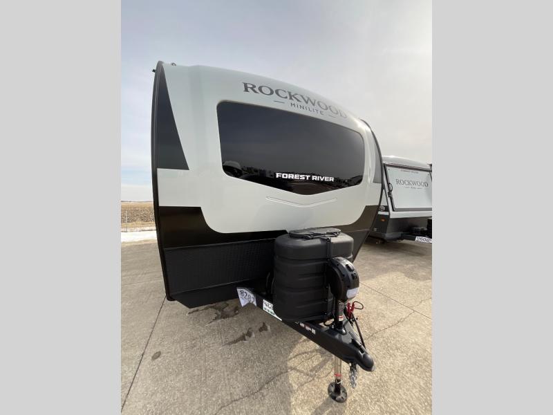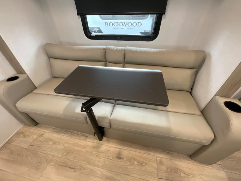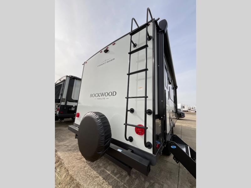 Each Rockwood Mini Lite travel trailer by Forest River is constructed with a fully laminated one-piece walkable roof, sleek frameless windows, and a six-sided full aluminum frame for strength and durability. The 12V thermostatically controlled heated tanks, plus radiant foil in the underbelly will allow you to camp well into the colder months, and the 200W roof solar panel will be perfect for a little off-gridding. Each model includes solid surface kitchen countertops, hidden hinge cabinet doors, roller shades, plus many more interior features. Having an AIR 360+ omnidirectional antenna with WiFi prep on board gives you the option to get some work done if it's needed, and the power tongue jack provides hassle-free set up, so you can enjoy more time relaxing!