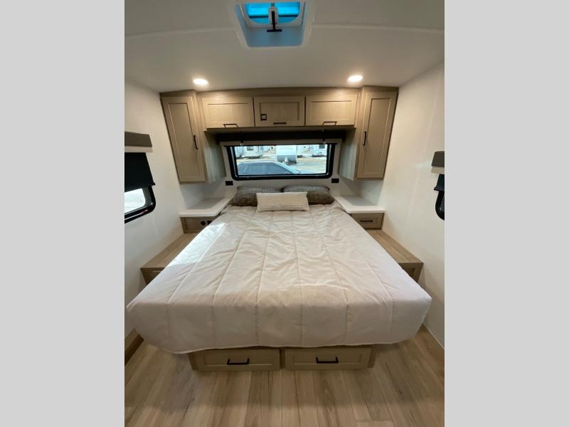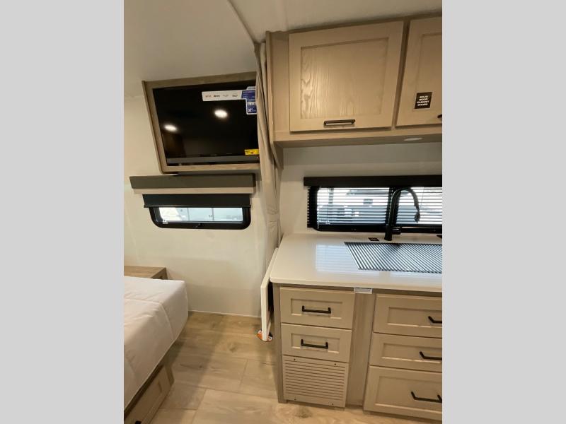 Wherever you decide to camp, you will love every minute in this cute couple's trailer. The sofa slide with a table will provide a place to relax, eat, and even sleep an extra guest if you have one, and the front RV queen bed includes a privacy curtain to enjoy your own space. There are dual bedroom wardrobes to keep your clothes tidy, and you'll find two pass-through storage compartments for your larger gear. Since there is a full bath on board you won't have to use the camp's facilities, and you can make it a movie night with the TV in the main living area!