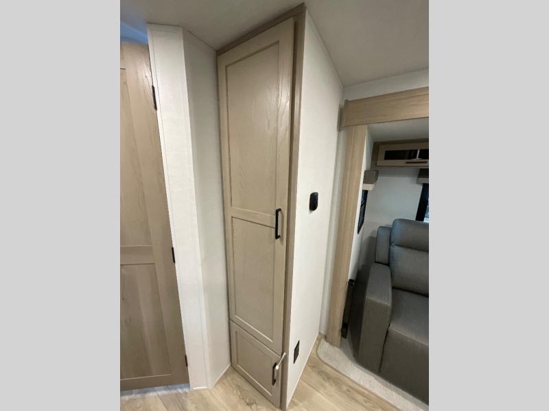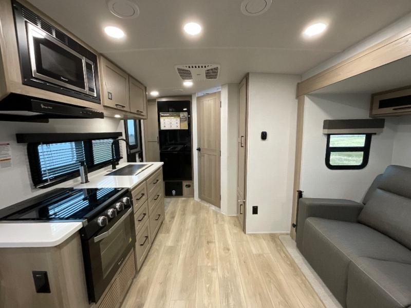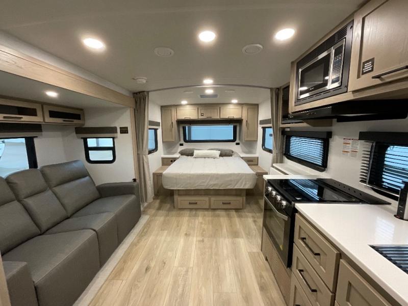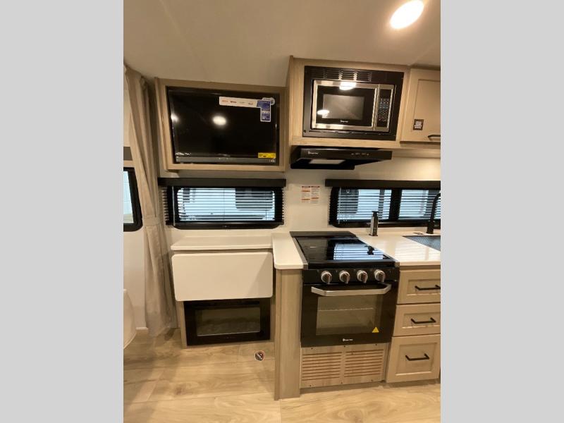 Enjoy the camping season with your spouse, friend, or significant other in this cozy travel trailer for two. Each morning, you can have your coffee on the 67" theater seats with a table within the slide out, then head outdoors to make pancakes on the outdoor griddle with an LP hookup. The interior kitchen includes a three burner cooktop, a microwave oven, plus a 12 volt refrigerator for perishables. An entertainment center with a fireplace will make your space feel more like home, and what's better than sleeping on your own queen bed with dual bedroom wardrobes for your clothes!?