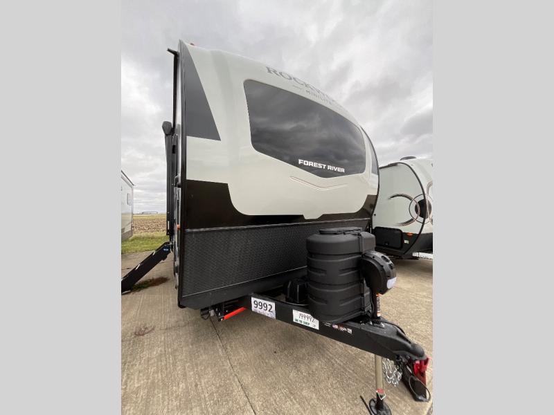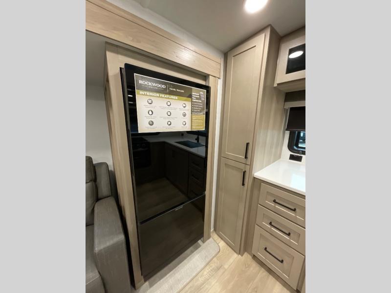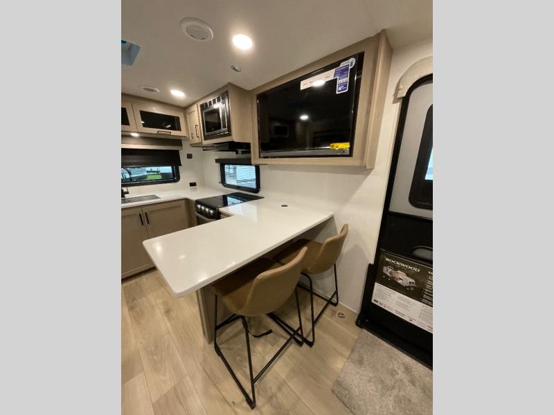 Each Rockwood Mini Lite travel trailer by Forest River is constructed with a fully laminated one-piece walkable roof, sleek frameless windows, and a six-sided full aluminum frame for strength and durability. The 12V thermostatically controlled heated tanks, plus radiant foil in the underbelly will allow you to camp well into the colder months, and the 200W roof solar panel will be perfect for a little off-gridding. Each model includes solid surface kitchen countertops, hidden hinge cabinet doors, roller shades, plus many more interior features. Having an AIR 360+ omnidirectional antenna with WiFi prep on board gives you the option to get some work done if it's needed, and the power tongue jack provides hassle-free set up, so you can enjoy more time relaxing!