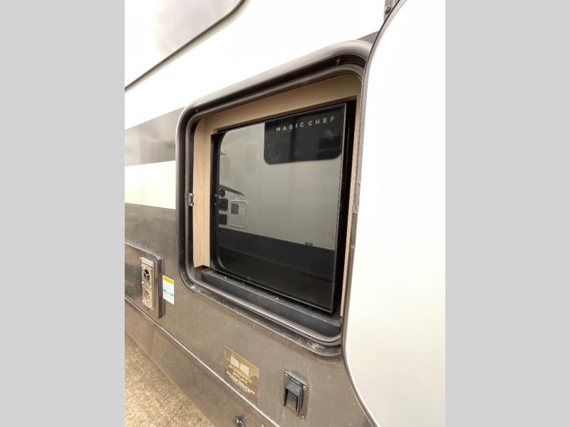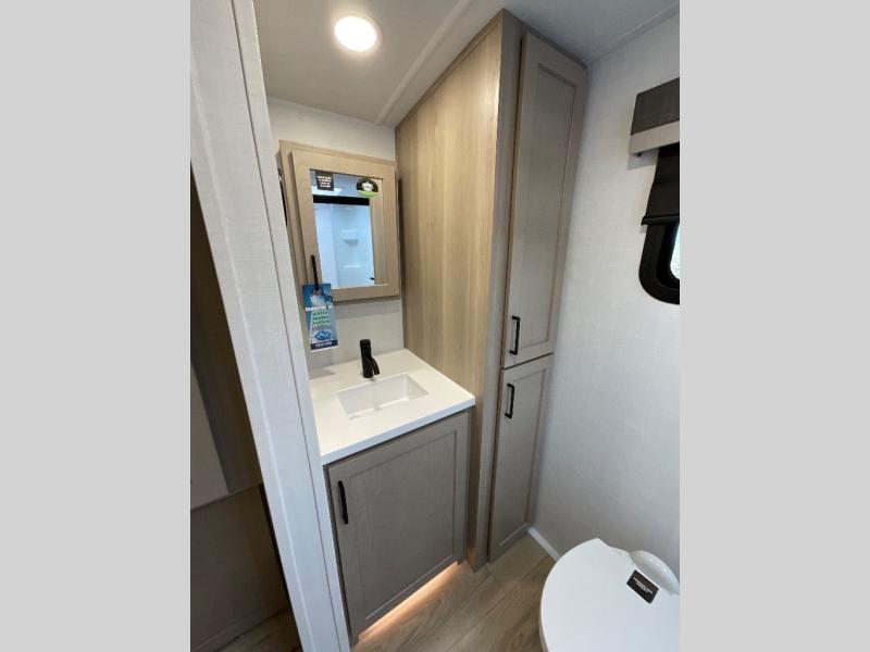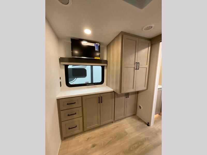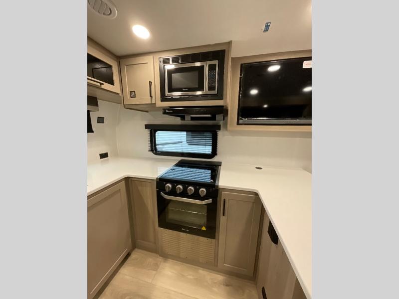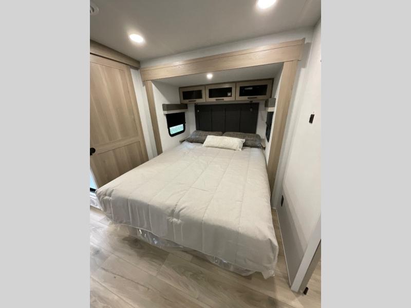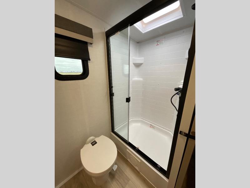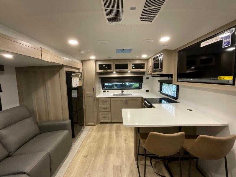 This travel trailer is the best option for you and your partner! The lavish full rear bathroom features a spacious layout and a convenient linen closet, perfect for relaxation and refreshment. The elegant bedroom boasts a plush queen bed, ample wardrobe space, and stylish dresser, creating a serene retreat. The spacious living room and kitchen combined area is the heart of the trailer, featuring plush theater seating for cozy movie nights, a generous closet for storing essentials, and a 12V Smart TV for entertainment on the go. Plus, the expansive countertop with chairs provides a perfect spot for gourmet meals or socializing, while the premium three-burner cooktop, well-stocked kitchen pantry, and high-performance microwave make meal prep and cooking a true delight.