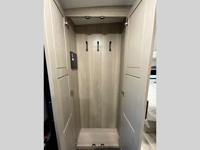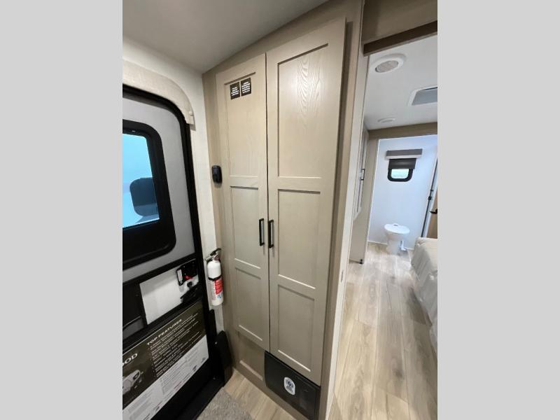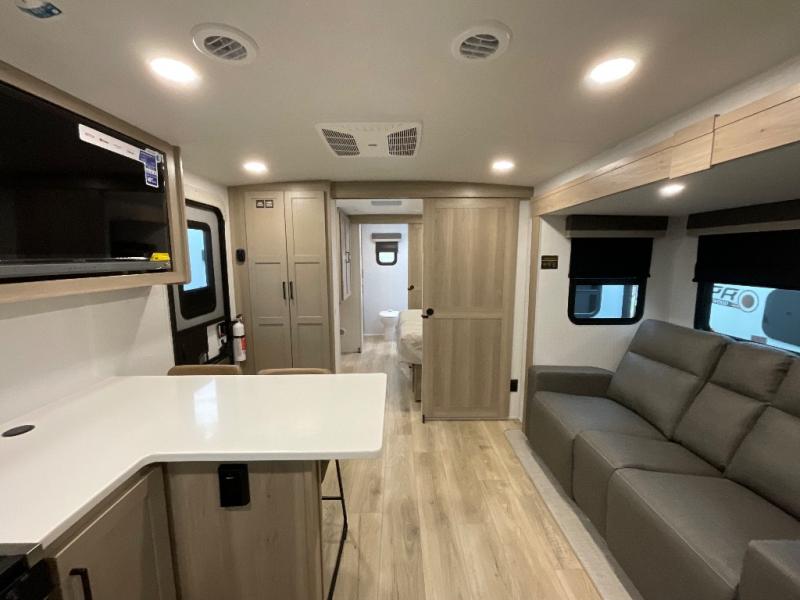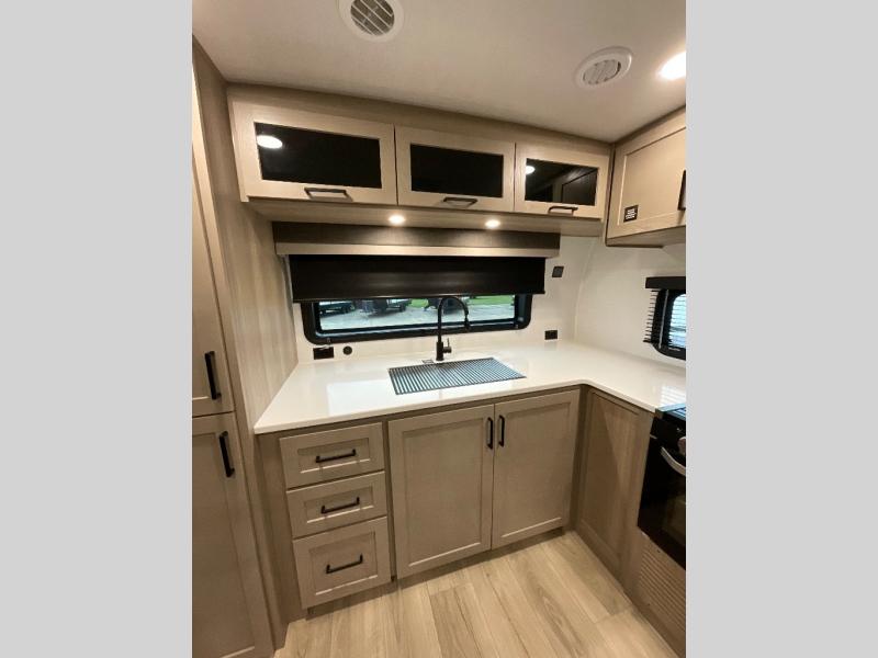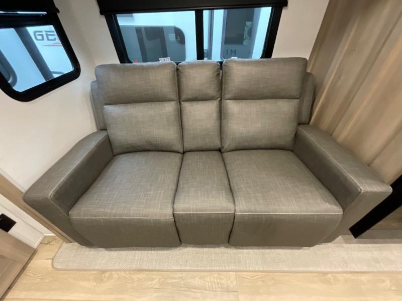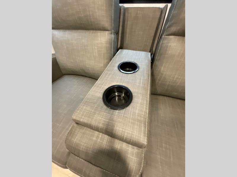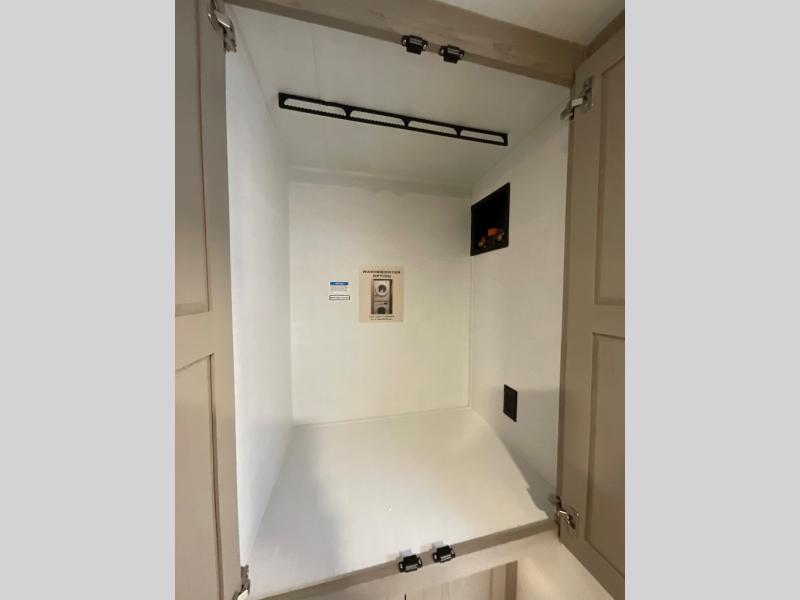 This travel trailer is the best option for you and your partner! The lavish full rear bathroom features a spacious layout and a convenient linen closet, perfect for relaxation and refreshment. The elegant bedroom boasts a plush queen bed, ample wardrobe space, and stylish dresser, creating a serene retreat. The spacious living room and kitchen combined area is the heart of the trailer, featuring plush theater seating for cozy movie nights, a generous closet for storing essentials, and a 12V Smart TV for entertainment on the go. Plus, the expansive countertop with chairs provides a perfect spot for gourmet meals or socializing, while the premium three-burner cooktop, well-stocked kitchen pantry, and high-performance microwave make meal prep and cooking a true delight.