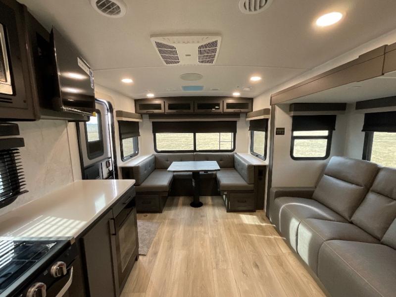 This double slide out travel trailer is perfect for weekend trips or extended stays! Your crew can play a game around the U-shaped dinette, relax on the theater seat across from the TV, or visit outdoors under the 21' awning. The fully-equipped kitchen allows you to make meals each day, and the walk-thru bath is easily accessible for everyone to use. This model also includes a front master bedroom with a queen bed, a wardrobe slide out, and one of the dual entry doors for convenience!