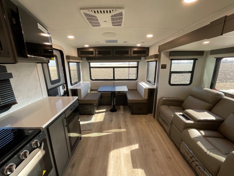 This double slide out travel trailer is perfect for weekend trips or extended stays! Your crew can play a game around the U-shaped dinette, relax on the theater seat across from the TV, or visit outdoors under the 21' awning. The fully-equipped kitchen allows you to make meals each day, and the walk-thru bath is easily accessible for everyone to use. This model also includes a front master bedroom with a queen bed, a wardrobe slide out, and one of the dual entry doors for convenience!