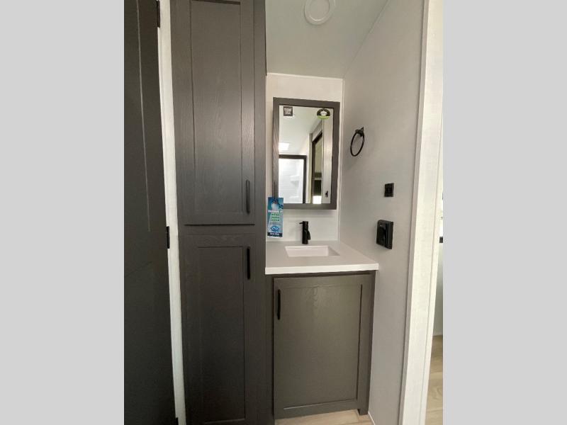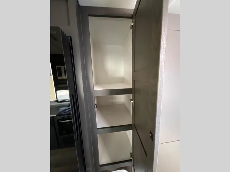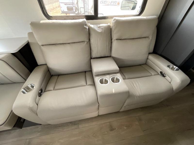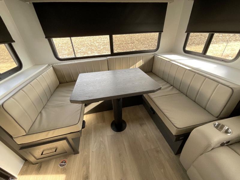 This is built for people who actually want to hang out in their camper, not just sleep in it. The rear U-shaped dinette becomes the heart of the trailer, giving you a legit spot for big family meals, card games, or spreading out laptops and snacks on a rainy day. Right across, the theater seating lines you up perfectly with the entertainment center and fireplace, so you get that cozy “evening at home” vibe instead of just staring at a tiny TV from a weird angle. When it is finally time to crash, the front bedroom steps it up with a king bed so you are not sacrificing real sleep to go camping. On either side you will find two wardrobes, giving both people proper hanging space instead of fighting over one tiny closet. Altogether, this floorplan feels like a comfy little apartment on wheels, with real lounge space, real dining space, and a real bedroom that does not feel like an afterthought.