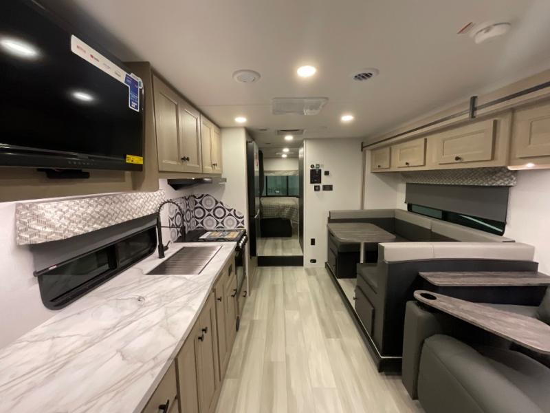With any Sunseeker Classic Class C gas motorhome by Forest River, you will enjoy more features and quality construction at a great value! Each model comes standard with a fiberglass roof and 2" aluminum framed laminated sidewalls for maximum durability. The Winegard Air 360+ digital antenna is your all-in-one solution for your internet, TV, and FM signal needs, and you have Gateway 4G Wi-Fi capability too. The exterior has an outside shower, heated/enclosed tanks, Rotocast storage compartments, and a power awning with an LED light strip to name a few conveniences. Each drive will be made easy thanks to a 10" touchscreen CarPlay/Android radio with USB and Bluetooth, backup camera/side view cameras with a 3-way monitor, and Ultraleather seating for added comfort. You'll also love the black out roller shades, soft touch self-closing drawer guides, oxygen-infused shower head with a flexible extension, and many more interior comforts!