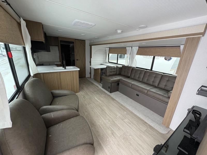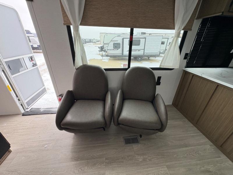 This Wildwood travel trailer is perfect for your family looking for a new adventure. You will enjoy the rear kitchen that includes a refrigerator and cooktop. The Versa-Lounge will provide comfortable seating and sleeping space, and the Versa Flex table gives you a space to dine and work if needed. This unit also includes two lounge chairs, so you'll feel right at home! You'll love the full bath in this unit, and the custom king bed with Versa-Tilt in the private bedroom is perfect for a good night's rest.