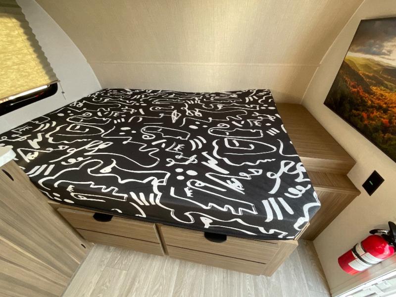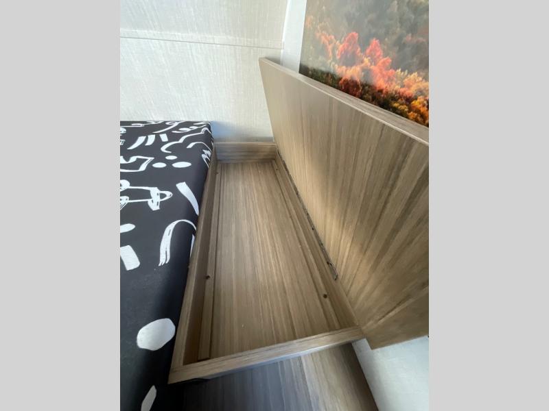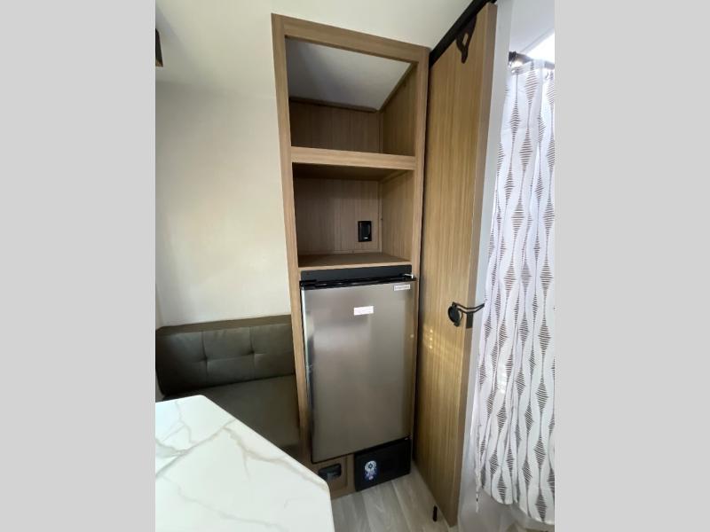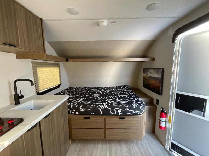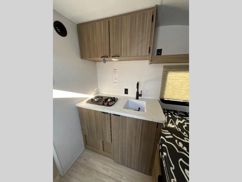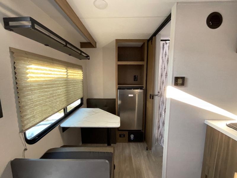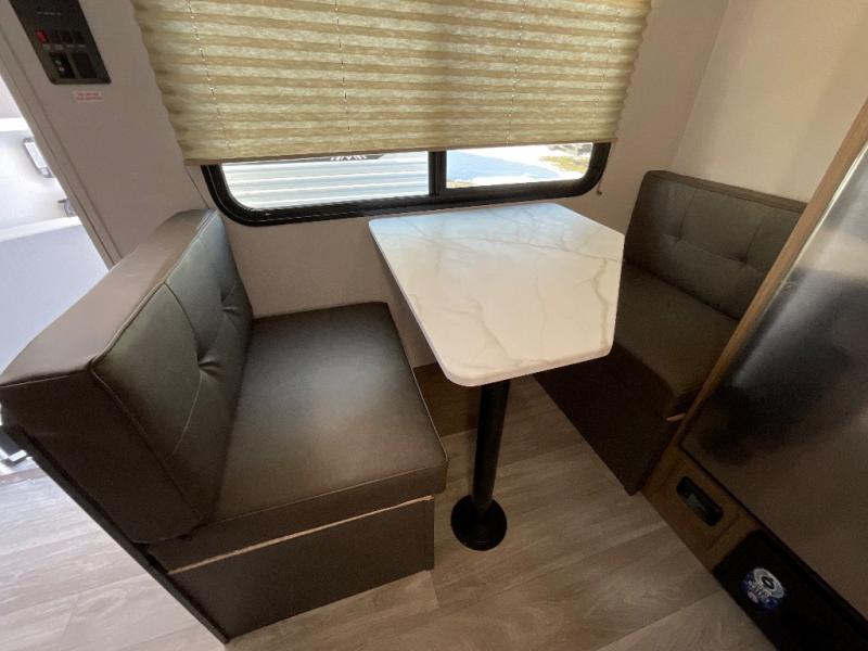 This lightweight travel trailer has everything you need to enjoy camping trips! There is a front east to west custom king bed with storage at the foot of the bed and overhead for your valuables. A private bath includes a toilet and walk-in shower so you can easily get ready each day, and you can prepare your meals on the two-burner cooktop when you get hungry. The booth dinette will provide dining space, along with sleeping space for one to two little ones. Don't let this trailer get away!