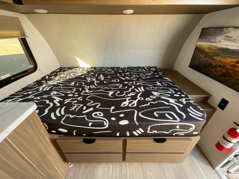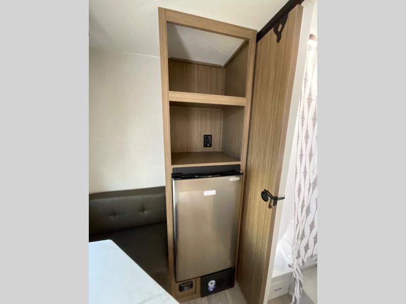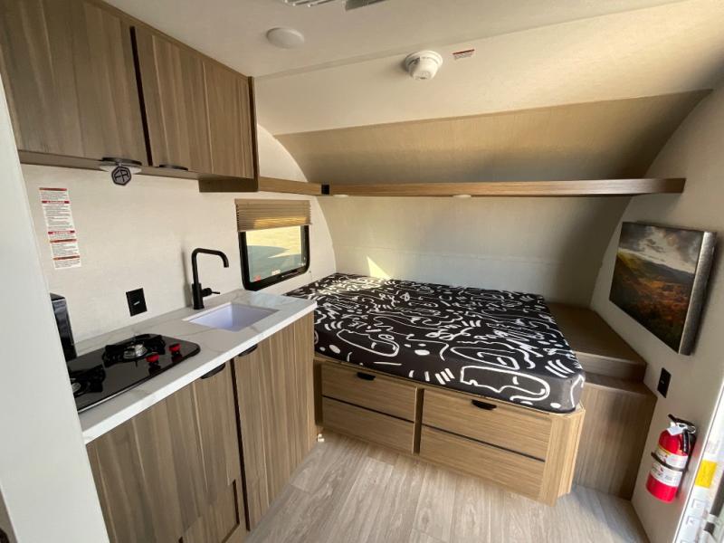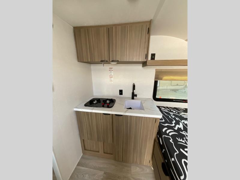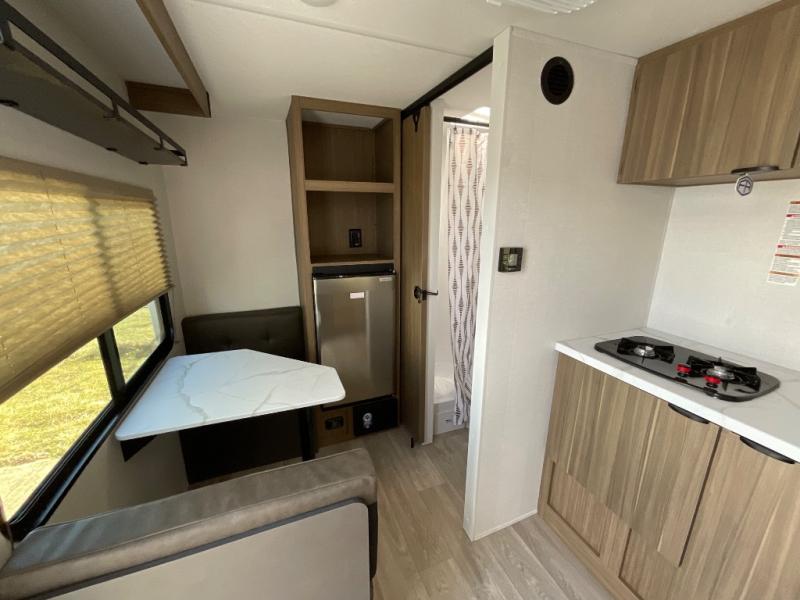 This lightweight travel trailer has everything you need to enjoy camping trips! There is a front east to west custom king bed with storage at the foot of the bed and overhead for your valuables. A private bath includes a toilet and walk-in shower so you can easily get ready each day, and you can prepare your meals on the two-burner cooktop when you get hungry. The booth dinette will provide dining space, along with sleeping space for one to two little ones. Don't let this trailer get away!
