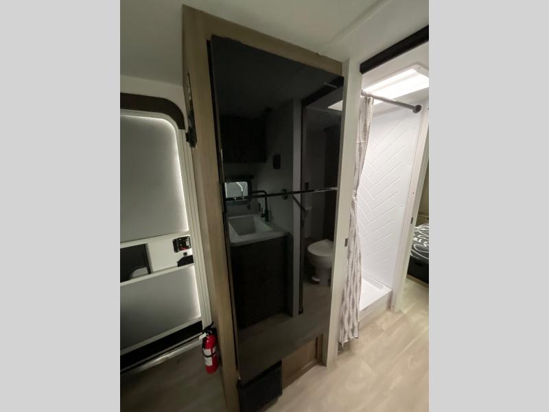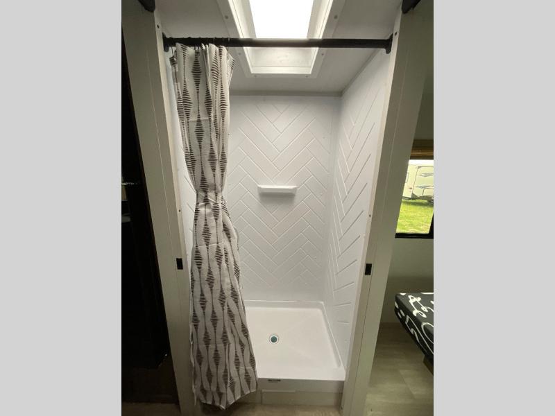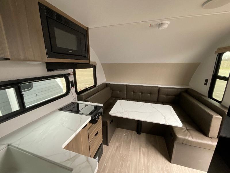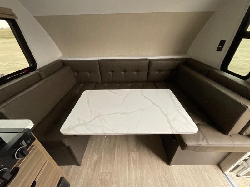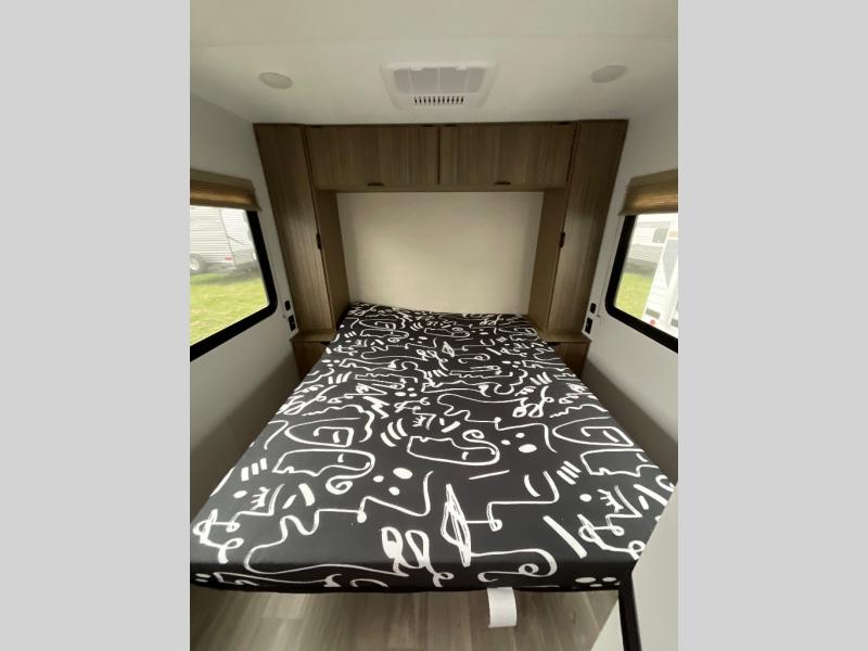 Pack your bags and head to the campground in this cozy travel trailer. Once you arrive you can unload the exterior storage, and there is a 15' power awning with LED lights to enjoy an outdoor living space. The U-shaped dinette inside will be perfect for mealtimes and game night, plus this space can double as additional sleeping space if you have guests. There is a separated bath, with the toilet and sink in one room, and the shower across the hall so two people can freshen up at the same. And don't overlook the rear bedroom with a queen bed, dual wardrobes, plus an overhead cabinet for your things.