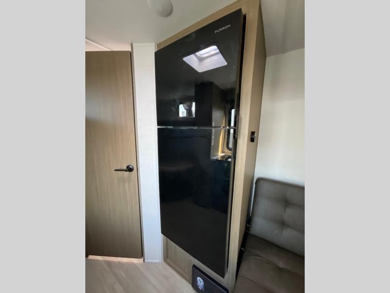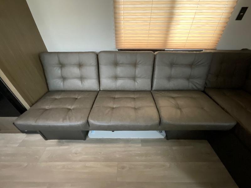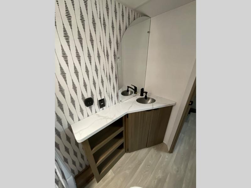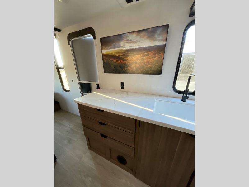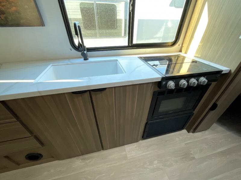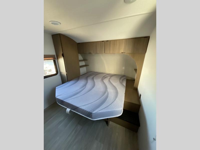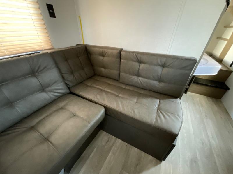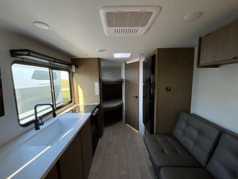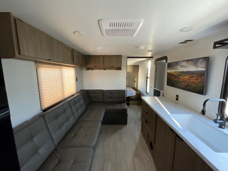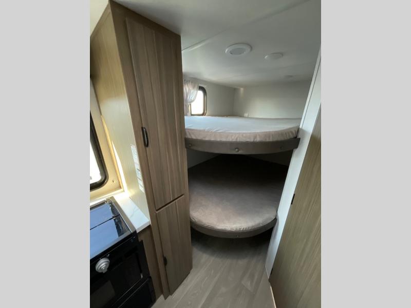 Camping is made easy in this travel trailer with more sleeping space and lots of comforts! The kids or your guests will enjoy the double-size bunks in the back, along with the full bath close by for easy nighttime use. You'll have the front private bedroom with a king bed all to yourselves, and there are dual bedroom wardrobes to keep your space neat and clean. Everyone can meet in the combined kitchen and living room to relax on the super U-lounge with a removable table while the chef of your group makes breakfast on the two burner cooktop. There is also a microwave oven for quick meals, plus a pantry and large under counter refrigerator for food storage!