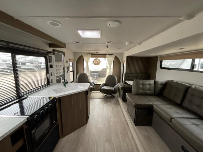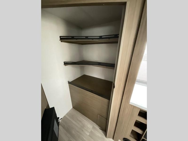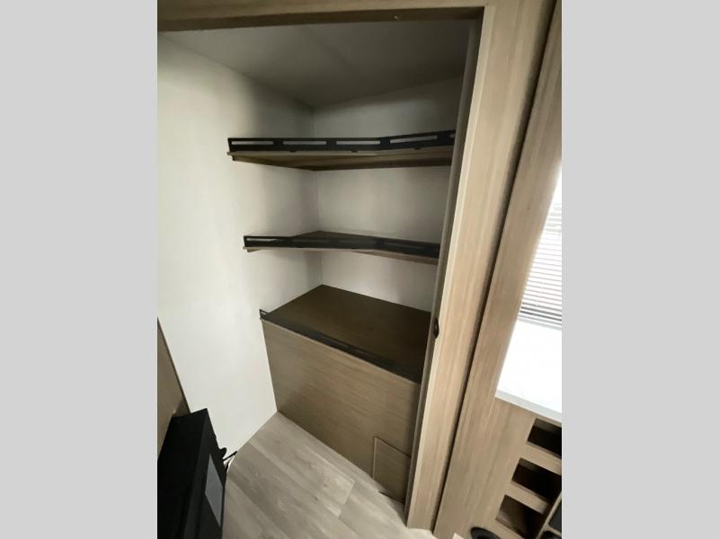 Comfort comes easy in this spacious travel trailer for three to four! The rear living area includes dual lounge chairs and a picture window so you can sit with your coffee and book in the morning. Once the chef of your crew has made breakfast in the fully equipped kitchen, you can dine at the booth dinette or take your plate outdoors under the awning. There is also a Versa-Lounge beside the dinette for more seating spaces. An entertainment center with a fireplace will make your space cozier, and you'll appreciate the hidden pantry behind for dry goods, movies, games and more! The walk-thru bath leads to the master bedroom where you'll find a walk-around Versa-Tilt custom king bed, a bedroom closet, and overhead storage so everything has a place!