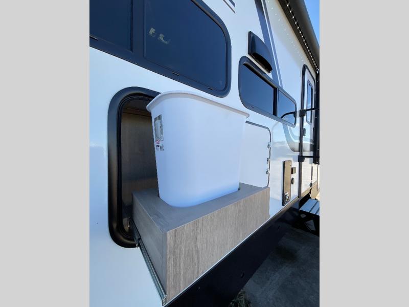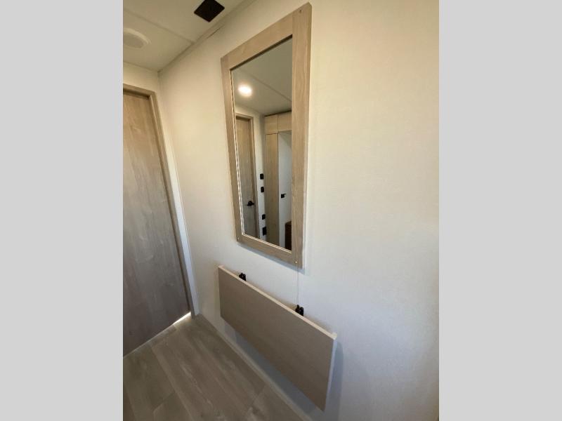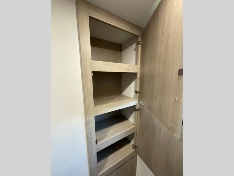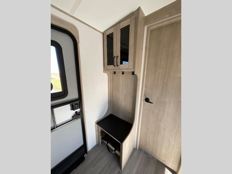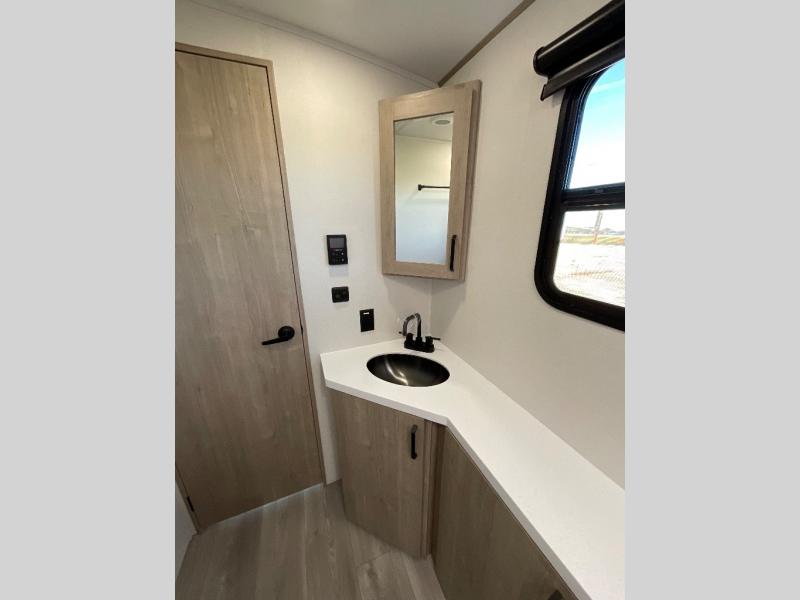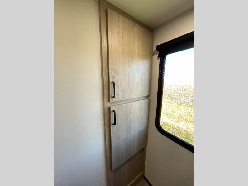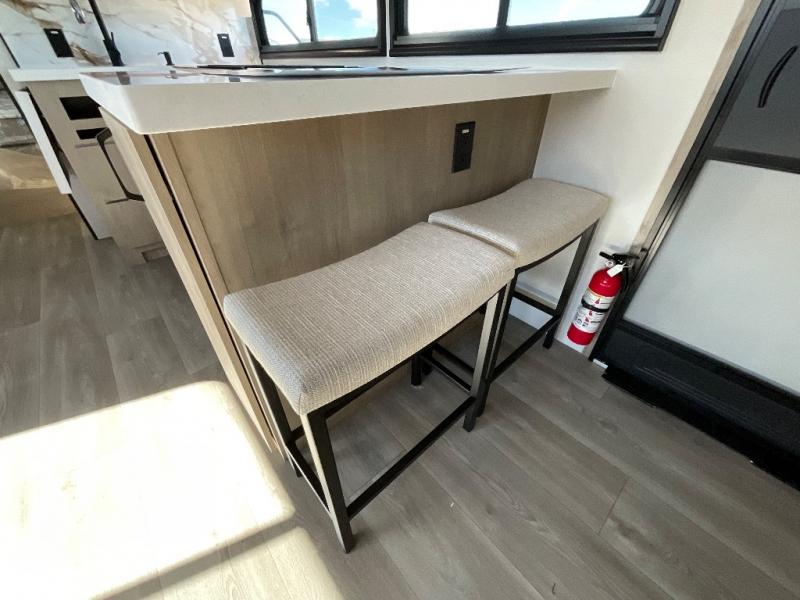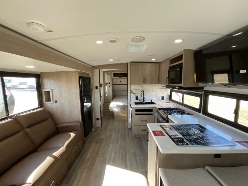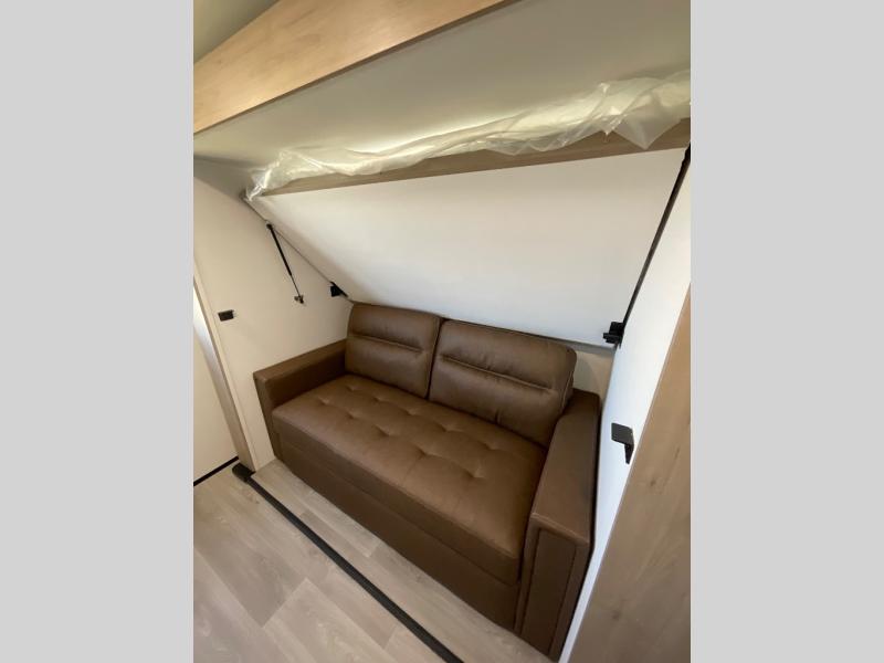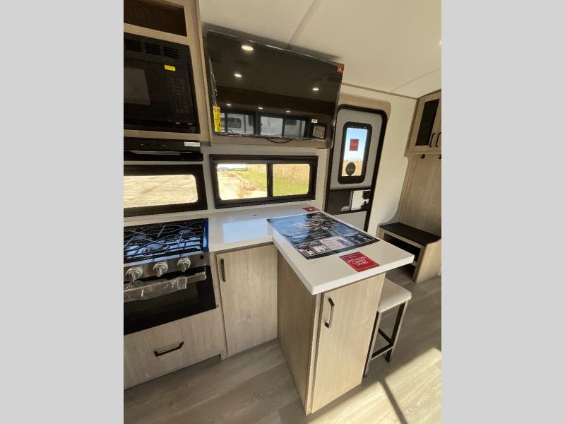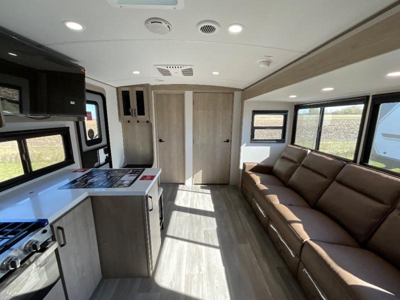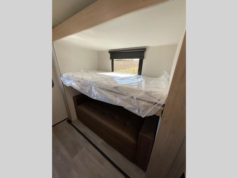 At the front of this 2810BH travel trailer, you’ll find a spacious full bedroom featuring a 60" x 80" queen bed, perfect for resting in comfort after a long day, along with dual wardrobes on each side to store your clothes and essentials. For added convenience, one of the two entry doors is located directly in the bedroom. Moving toward the center, the living area and kitchen create a welcoming space to relax and dine. The slide-out houses a quad theater seat, offering plenty of room to lounge, as well as a 10-cu. ft. refrigerator to keep your groceries fresh. Across from it, the U-shaped kitchen comes fully equipped with everything you need to cook comfortably, including a stainless-steel sink, three-burner range with oven, microwave, and solid surface countertops for meal prep. A bar top with stools provides a cozy dining spot, while a pull-out pantry keeps snacks organized. At the rear, the corner bathroom includes a 30" x 36" residential walk-in shower with skylight and a mirrored medicine cabinet, so you can skip the campsite facilities. Adjacent to it, the bunkhouse accommodates guests with a 36" flip-top bunk, tri-fold sofa, and even a flip-up desk, perfect for studying or remote work while on the road.