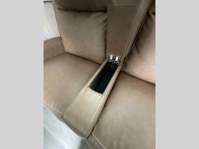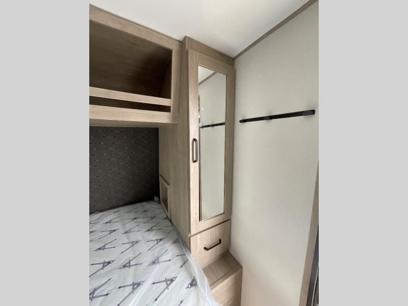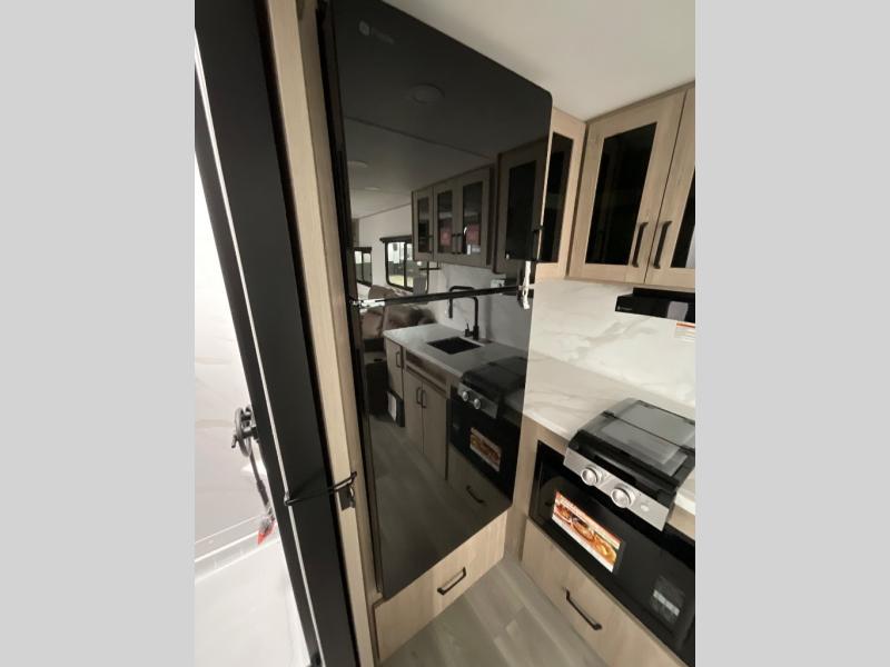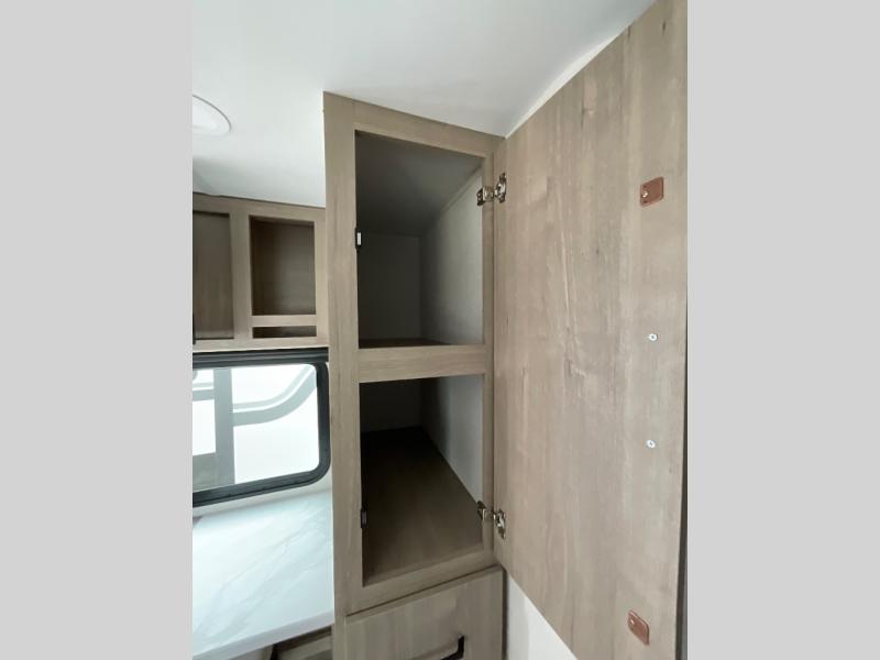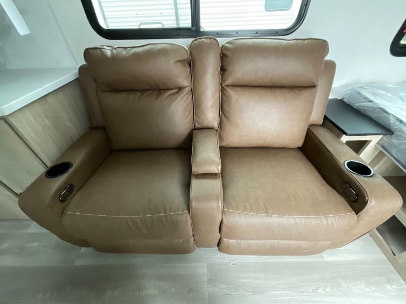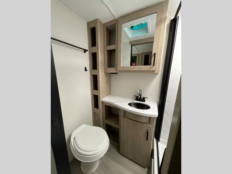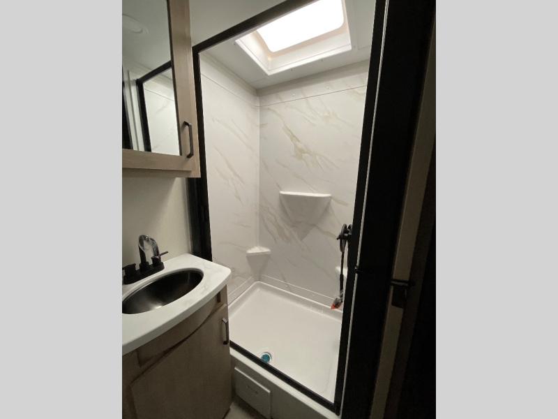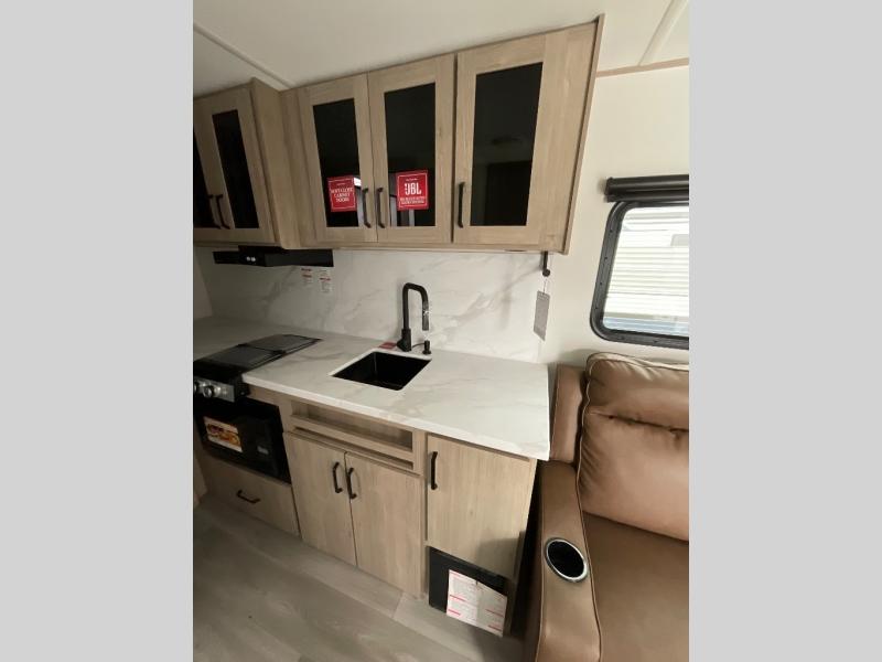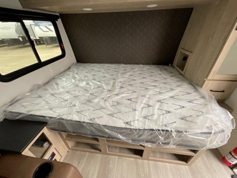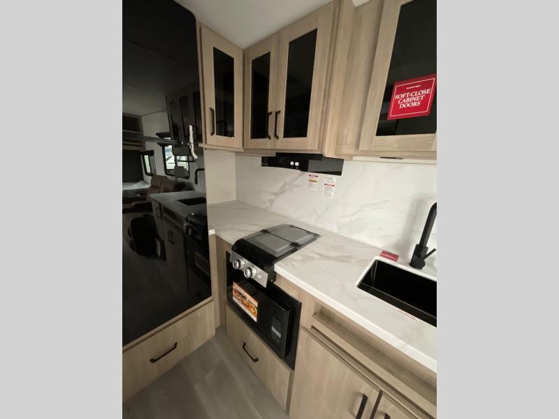 Pack your bags and head out on a fun camping trip in this travel trailer! The front queen bed offers a comfortable place to sleep at after taking off your footwear and place them in the shoe storage. You can make meals on the cooktop or in the convection microwave. The full rear corner bathroom has a walk-in shower with an oversized vanity to easily get ready each day. Outside, you'll find a spray port, an unobstructed pass-thru storage, and an interior/exterior table to use at your convenience.
