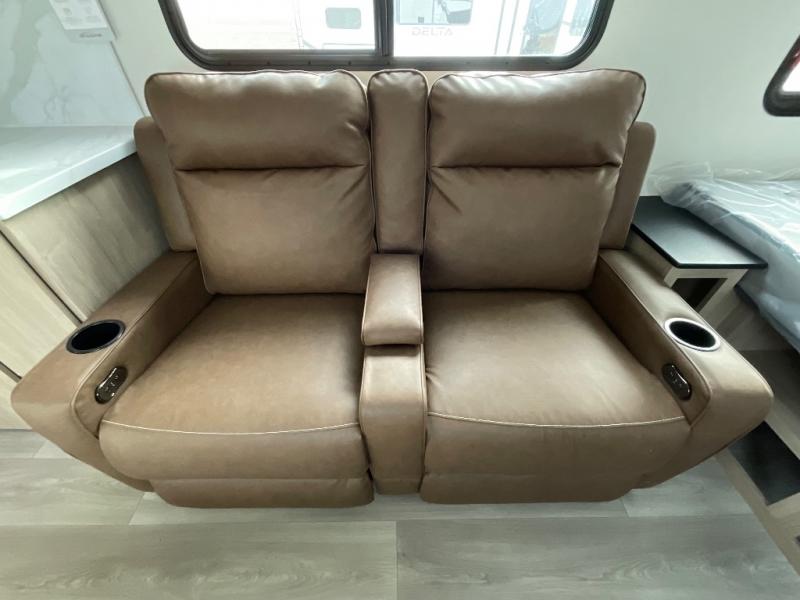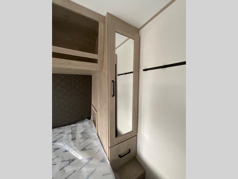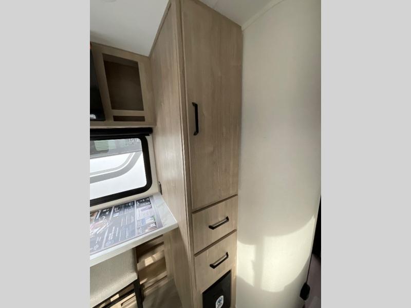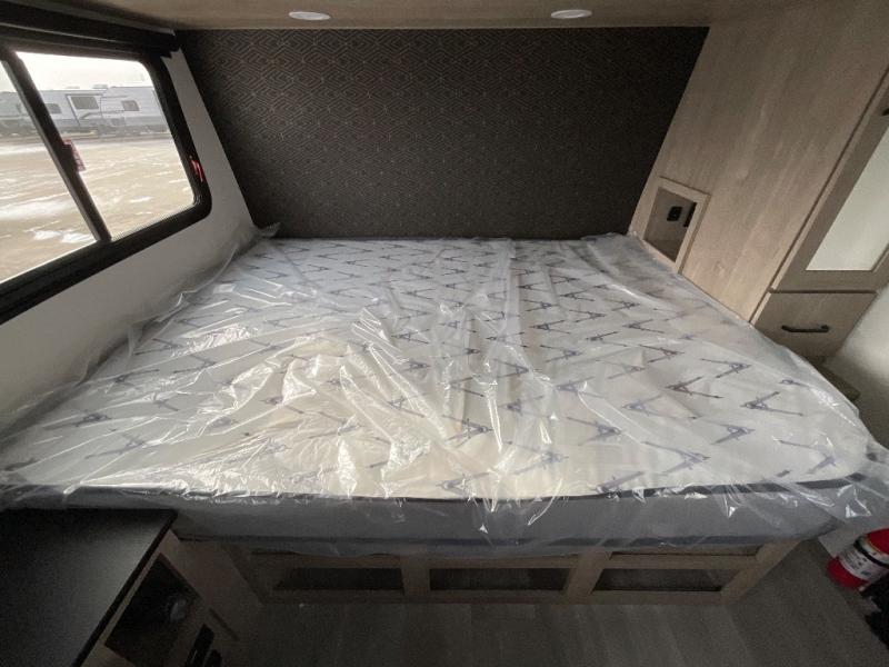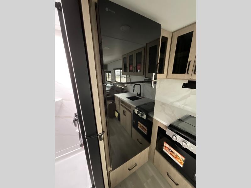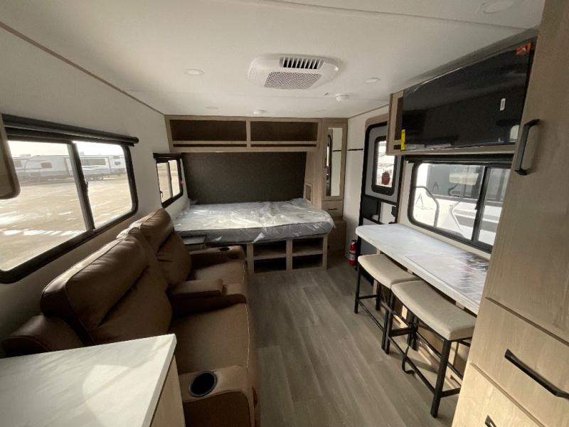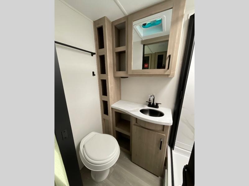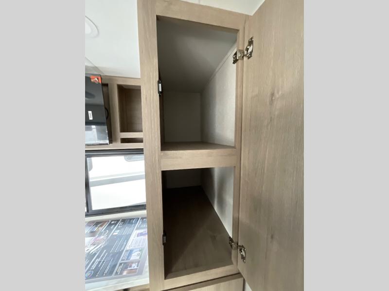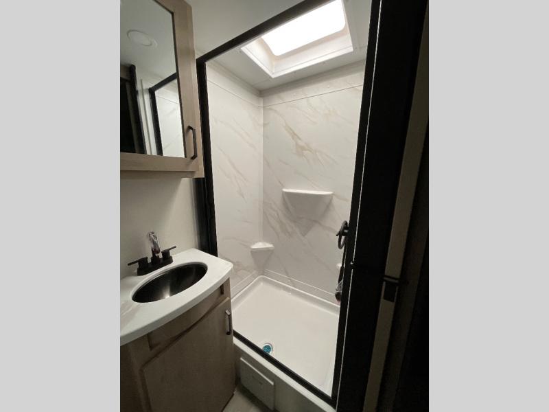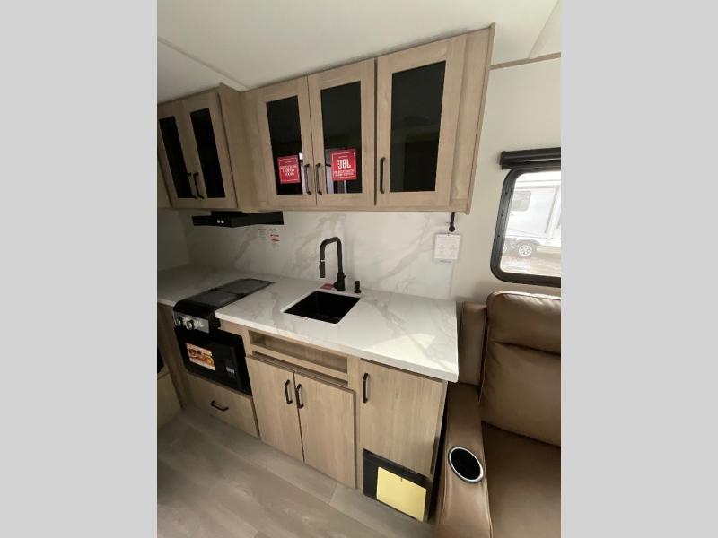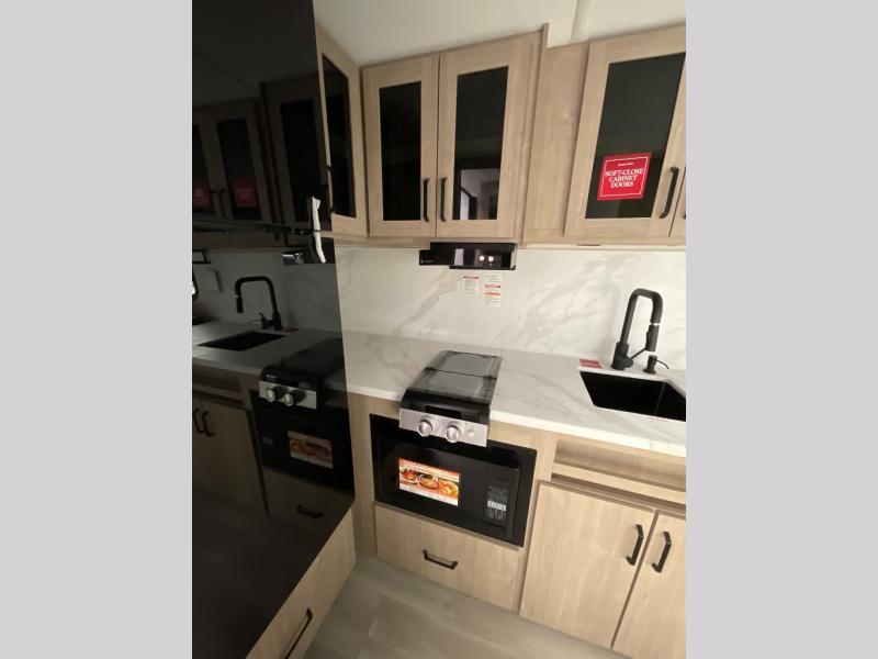 Pack your bags and head out on a fun camping trip in this travel trailer! The front queen bed offers a comfortable place to sleep at after taking off your footwear and place them in the shoe storage. You can make meals on the cooktop or in the convection microwave. The full rear corner bathroom has a walk-in shower with an oversized vanity to easily get ready each day. Outside, you'll find a spray port, an unobstructed pass-thru storage, and an interior/exterior table to use at your convenience.