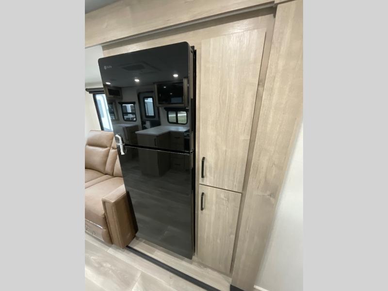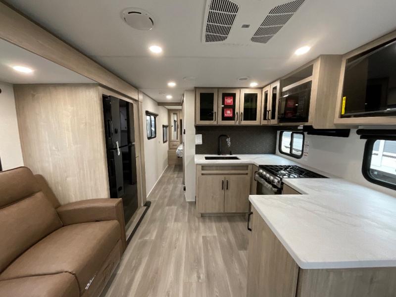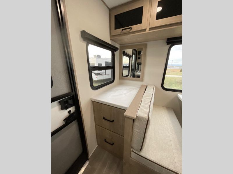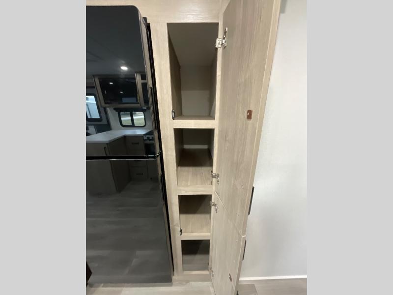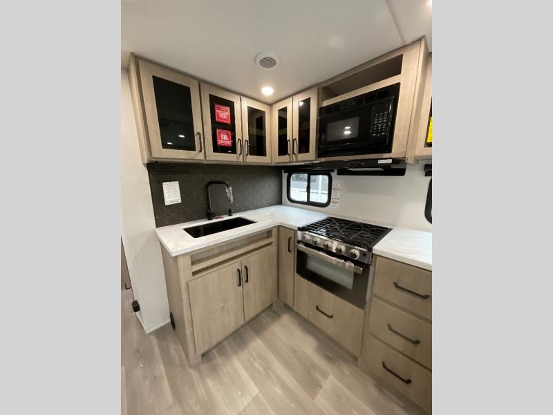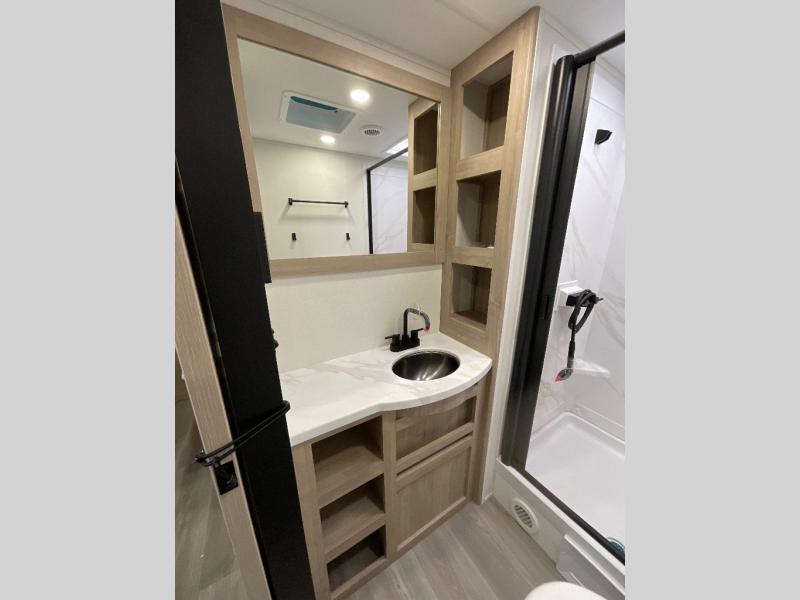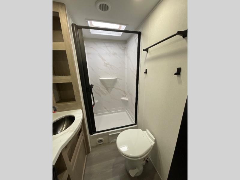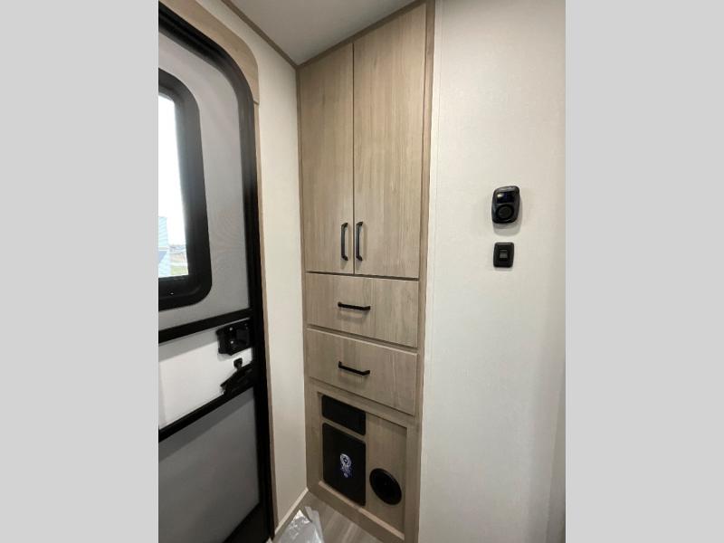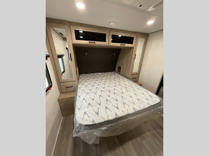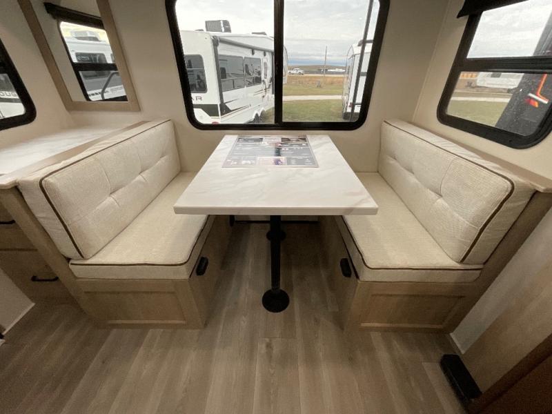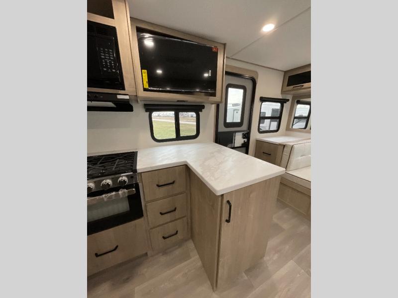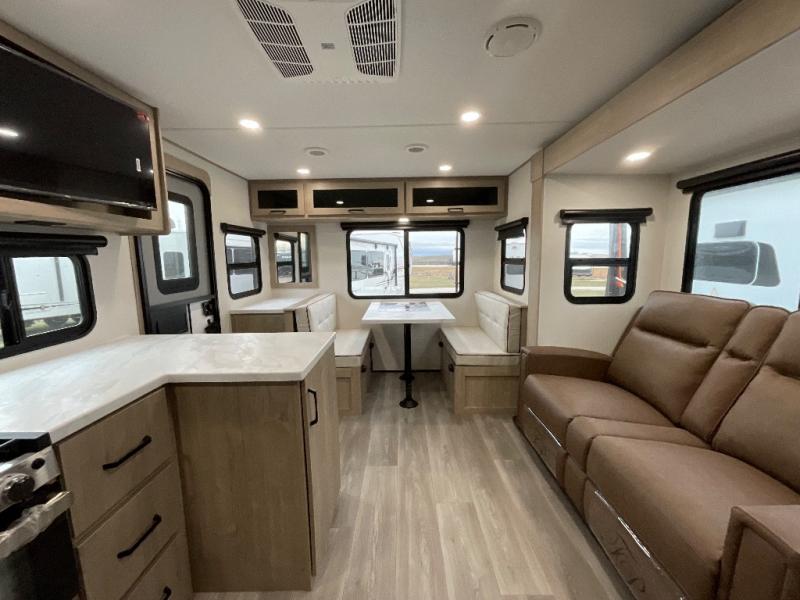 This 25RLE model travel trailer is designed for both comfort and convenience from front to back. At the front, the private bedroom features a spacious 60" x 80" queen bed with built-in wardrobe cubby storage and one of two entry doors for easy access. Moving down the hall, the full bathroom offers a residential-style walk-in shower with a skylight that adds both light and headroom, along with a mirrored medicine cabinet and linen shelves for towels and toiletries. The main living area opens up with a large slide out that houses 60" theater seating and a 10-cu. ft. refrigerator for all your fresh groceries, while a nearby pantry keeps your dry goods organized. Across from the slide, the U-shaped kitchen provides ample counter space, a three-burner range with oven, stainless steel sink, and microwave, everything you need to cook in comfort. At the rear, the booth dinette creates the perfect spot for meals or games and easily converts into an extra-sleeping area when needed.