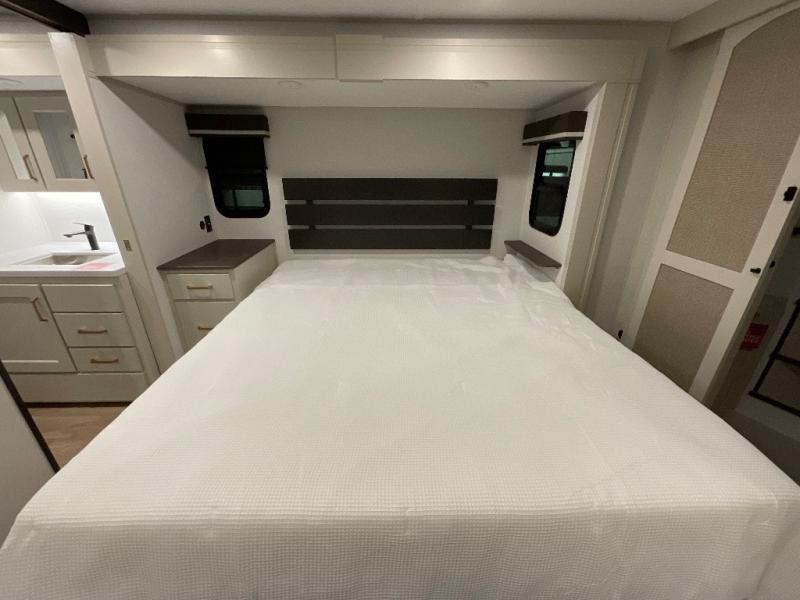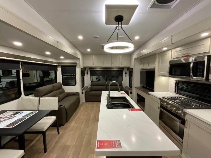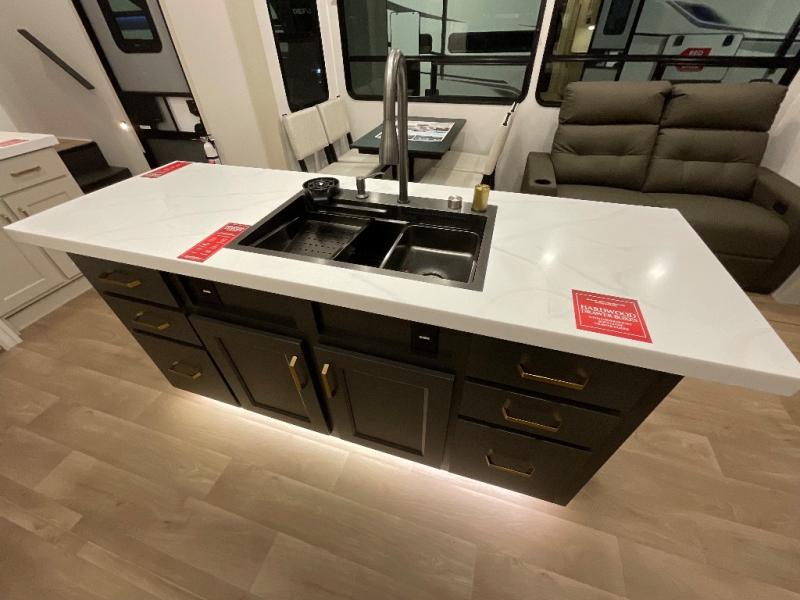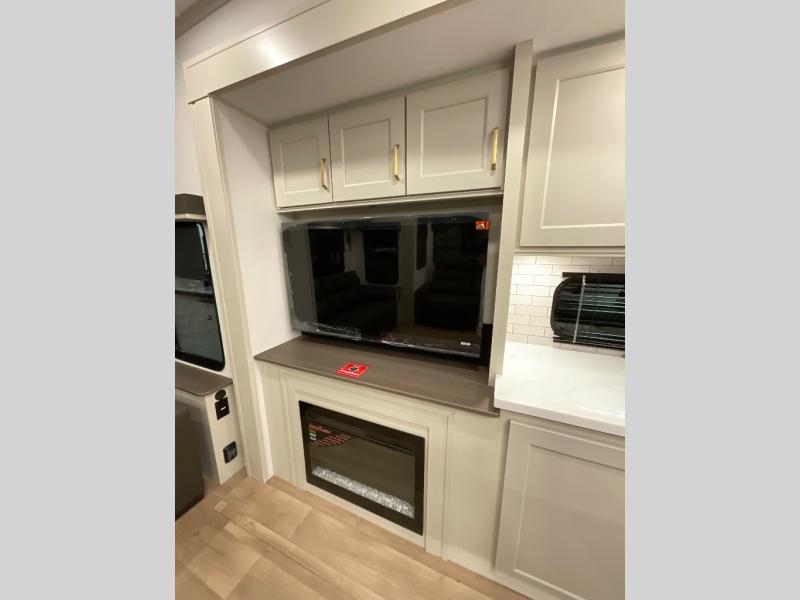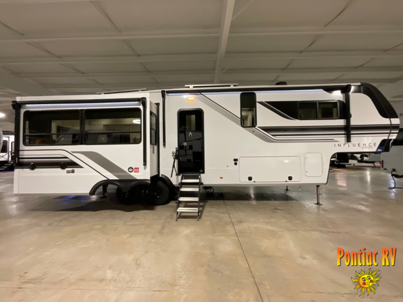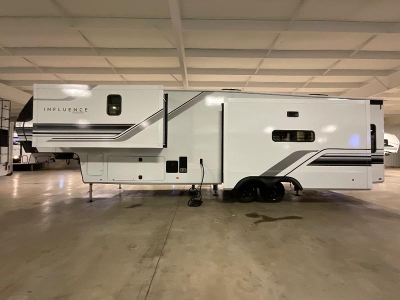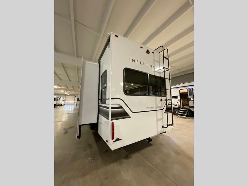 Any Grand Design Influence fifth wheel features five-sided aluminum cage construction with a walk-on roof and a fully enclosed underbelly with heated tanks and storage for all weather camping. For peace of mind, the MORryde CRE3000 Suspension system will provide safe and smooth towing, and the 101" widebody construction offers all the room you need and that is before multiple slides are fully engaged. You will appreciate the Keyed-Alike locks, slam-latch baggage doors with magnetic door catches, exterior security light, and SolidStep entry steps. On the inside, Congoleum flooring, premium roller shades for privacy, a hallway handrail for safety, and nightstands with USB ports to keep all of your electronics fully charged. You will also love the On Demand tankless water heater when showering, plus the added heat and ambiance from an electric fireplace, and so much more!