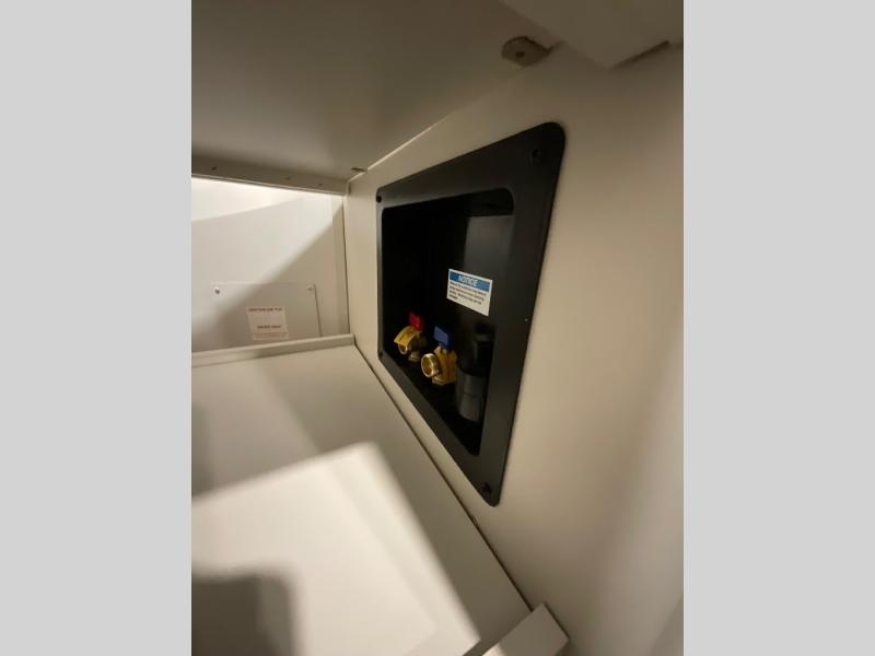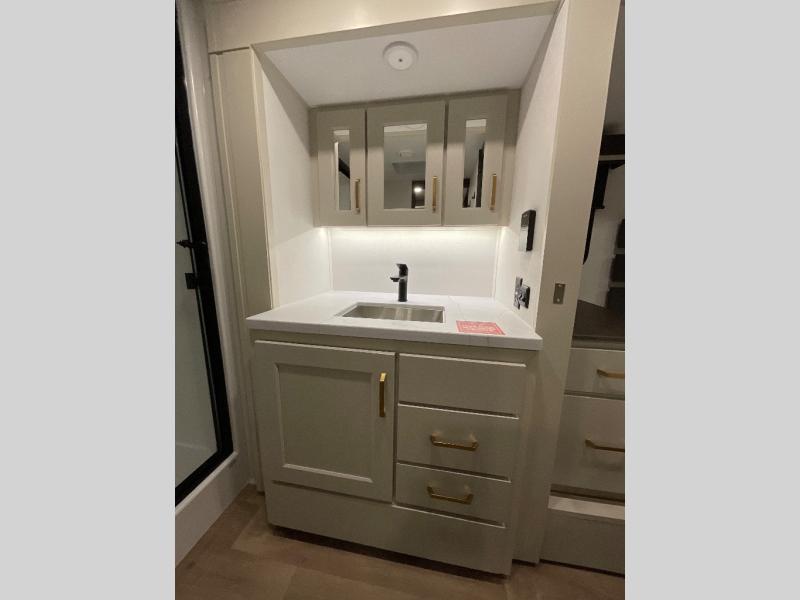 A perfect couples coach featuring triple slides and a tri-fold sofa just in case you want to have overnight guests! You will love the spacious interior thanks to the dual opposing slides in the main living and kitchen area. Here you will find a kitchen island in the center and plenty of seating with a free standing dinette, theater seating for movie night opposite the fireplace and entertainment center, as well as a tri-fold sofa. The kitchen offers all of the amenities just like home, a 16 cu. ft. 12-volt refrigerator for your perishables, and a pantry and hutch nearby for dry goods and dishes. There is even a pet dish under the refrigerator for your furry friends. The center island offers added counter space and a sink for dishes and prep work. Head up the steps to your private front bedroom with queen bed slide, and bathroom with dual entry. You even have washer/dryer prep in case you wish to add the units and enjoy even more at-home conveniences!