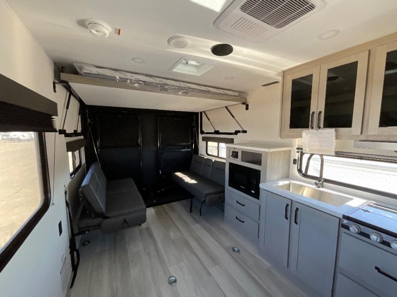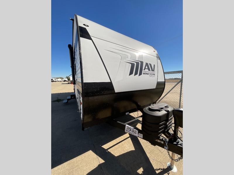 The Momentum MAV toy hauler travel trailers by Grand Design are designed to provide exactly what you need. The spacious garage provides tons of cargo space, with no wheel wells to get in the way. Additional storage includes magnetic storage door catches, and overhead consoles throughout. Conveniences like motion sensor lights and USB outlets will make your life easier, and you will be comfortable in all seasons with the 30K BTU furnace plus 15K BTU ducted air conditioning. The standard Solar Package comes with a 180W solar panel, a 40 Amp charge controller with Bluetooth, and a 12V refrigerator so you can go off-grid when the adventure calls for it.