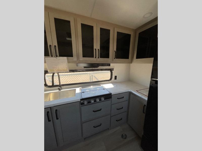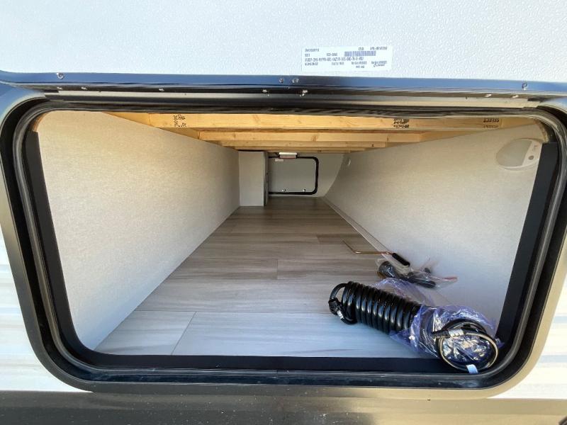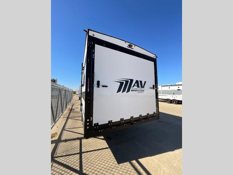 You will love this Momentum MAV toy hauler travel trailer! The front bedroom features a queen bed, and there is plenty of room to walk around. The sliding solid bedroom door helps with space. Overhead storage and a pair of nightstands are convenient storage, plus there is a wardrobe with both drawers and space to hang items. The kitchen offers a microwave, stainless steel sink, and an 8 cu. ft. 12V refrigerator. In the garage, you'll find rollover sofas with a table and a top bed for guests to sleep on. The ramp door/patio will provide additional living space once your toys are unloaded, and the pull down screen will keep bugs out!