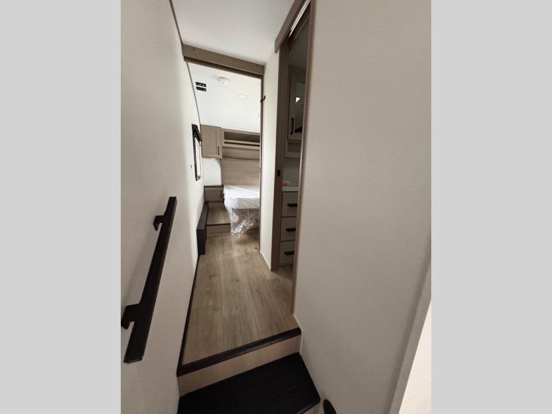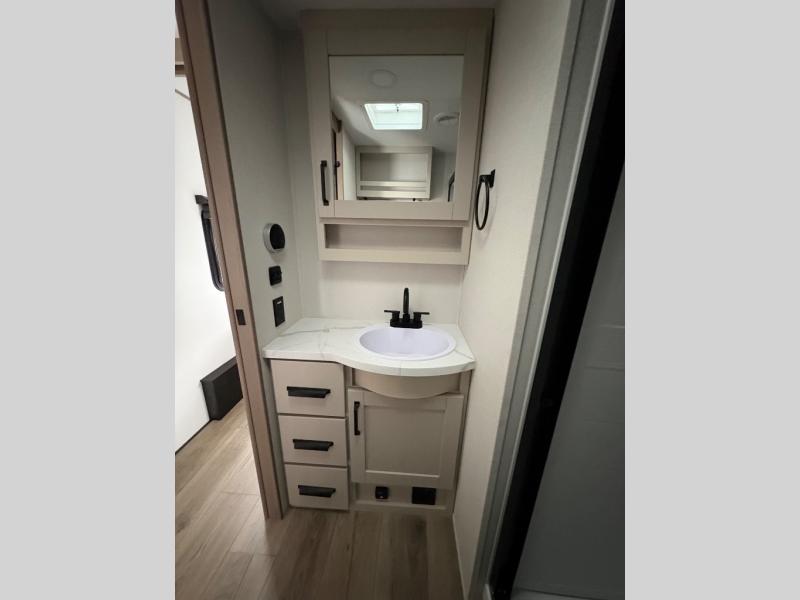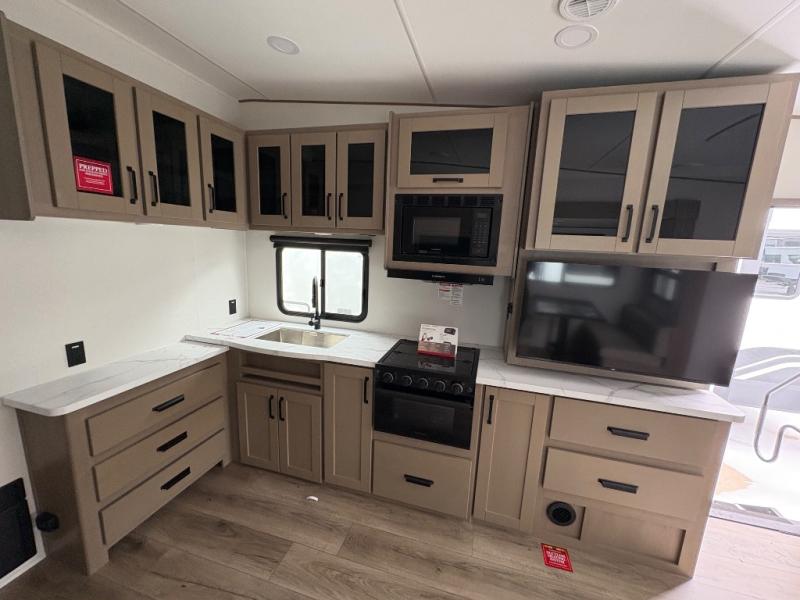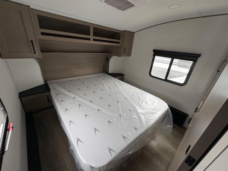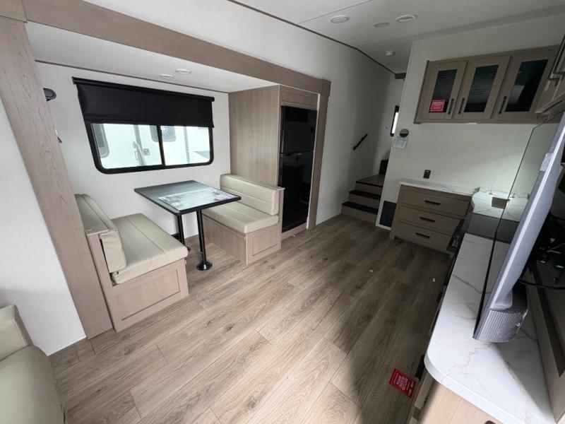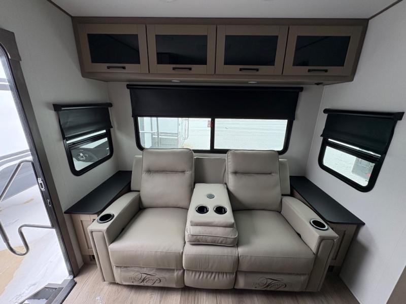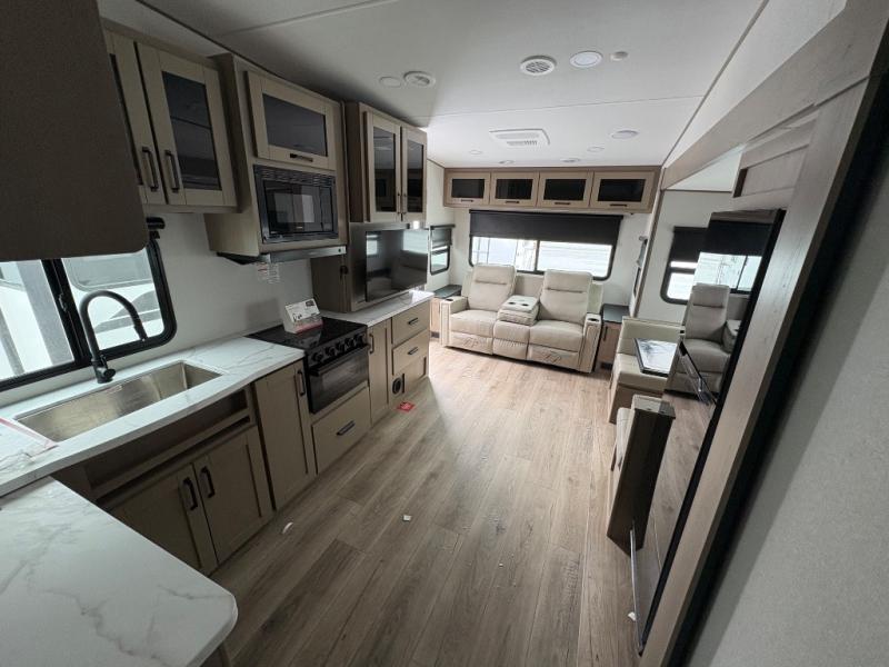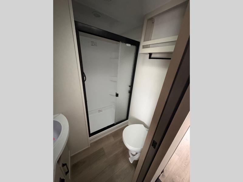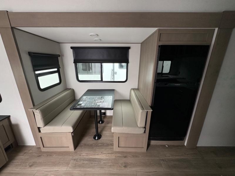 This is the perfect couple's trailer with a space for an overnight guest or two little ones on the booth dinette. You can switch out this dinette for an optional swivel dinette as well, and the standard theater seating can be replaced by an optional trundle bed if you need more sleeping space. A 40" HDTV will keep you entertained when the weather isn't cooperating, and you can whip up your best meals in the full kitchen. And a 19' power awning will provide shade if you choose to take your plate outdoors! The spacious full bath will let you clean up each day, and you'll feel right at home in the front private bedroom with a queen bed!