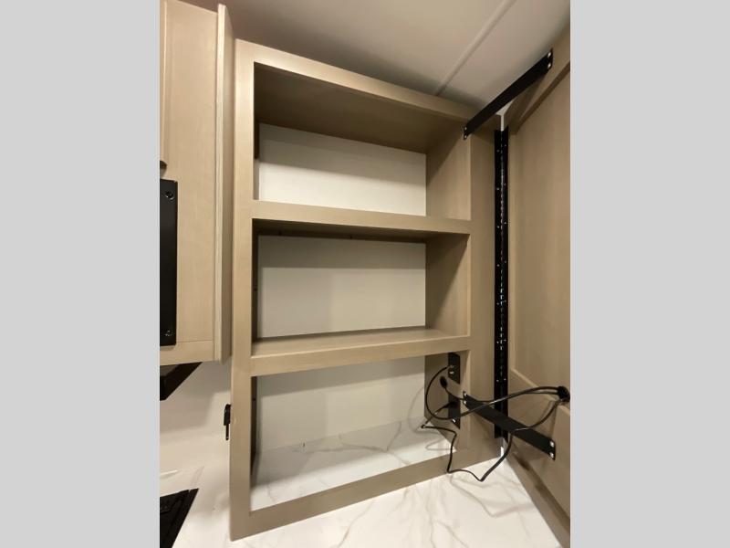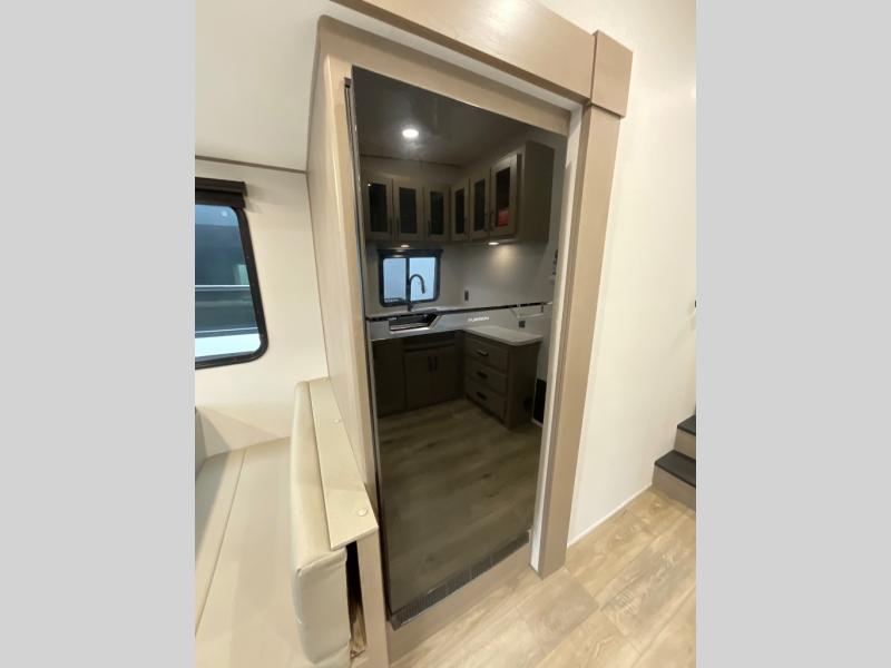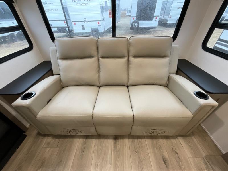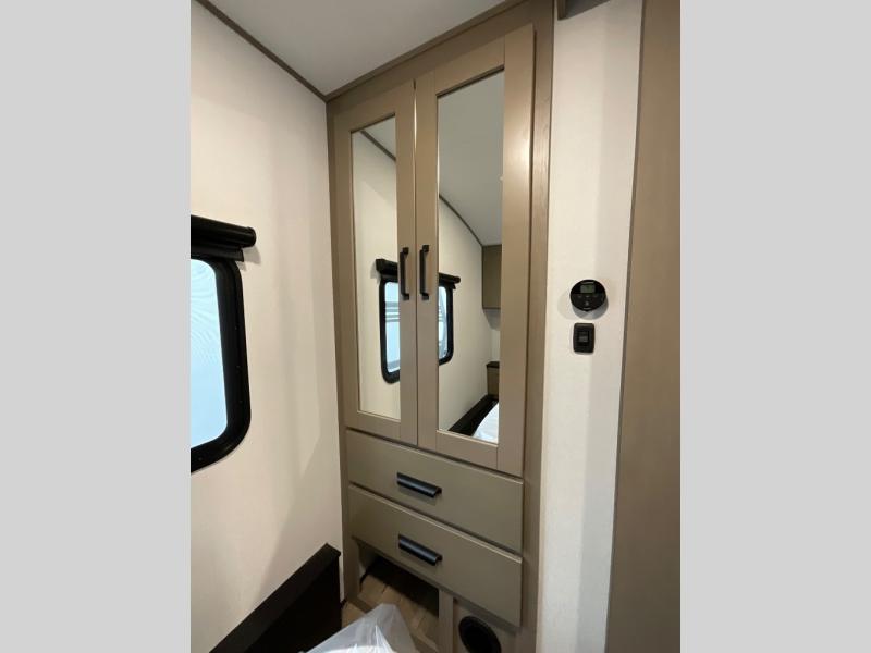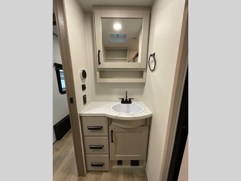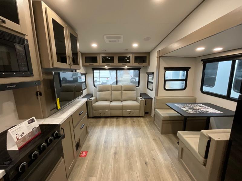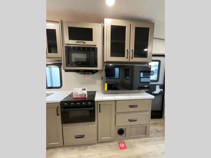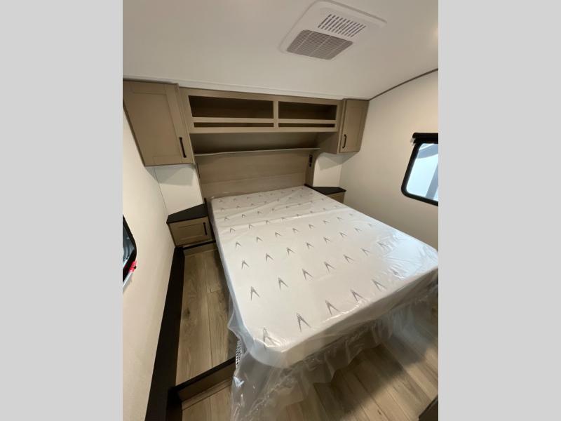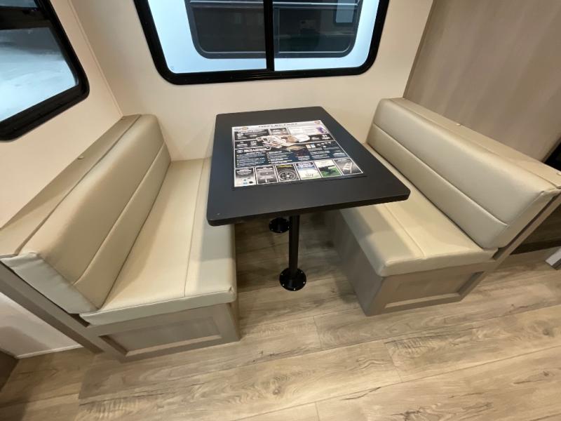 This is the perfect couple's trailer with a space for an overnight guest or two little ones on the booth dinette. You can switch out this dinette for an optional swivel dinette as well, and the standard theater seating can be replaced by an optional trundle bed if you need more sleeping space. A 40" HDTV will keep you entertained when the weather isn't cooperating, and you can whip up your best meals in the full kitchen. And a 19' power awning will provide shade if you choose to take your plate outdoors! The spacious full bath will let you clean up each day, and you'll feel right at home in the front private bedroom with a queen bed!