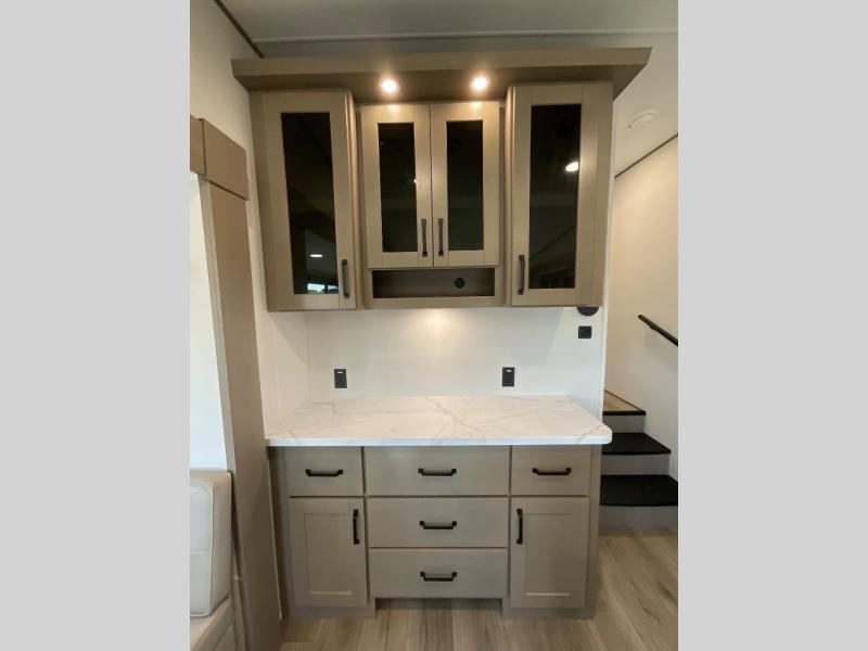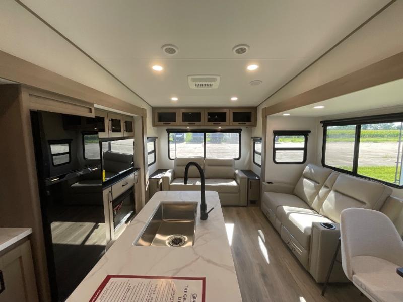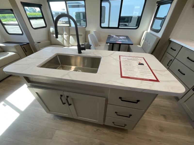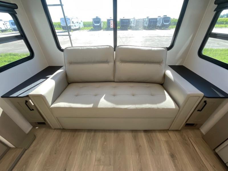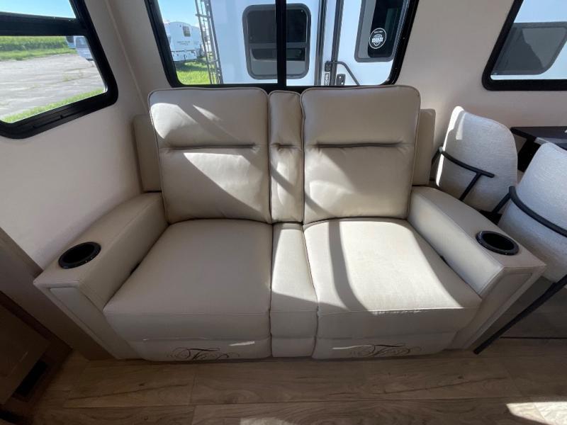 You'll love the amount of space you have in this fifth wheel thanks to the dual opposing slides in the rear living area/kitchen. Your friends and family can relax on the tri-fold sofa or theater seating across from the high-definition 40" LED TV. There is also a booth dinette or you can choose the optional swivel dinette if you prefer that seating. The chef of your group will appreciate having a kitchen island that will provide more counter space, plus there is a hutch with overhead cabinets for nice dishes. A full bath onboard lets you clean up each day and the front private bedroom includes a queen bed just like at home. You'll also love spending time outdoors under the electric awning, and there is an unobstructed pass-thru storage for fishing poles, hiking gear, and camp chairs!