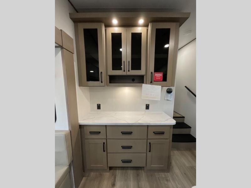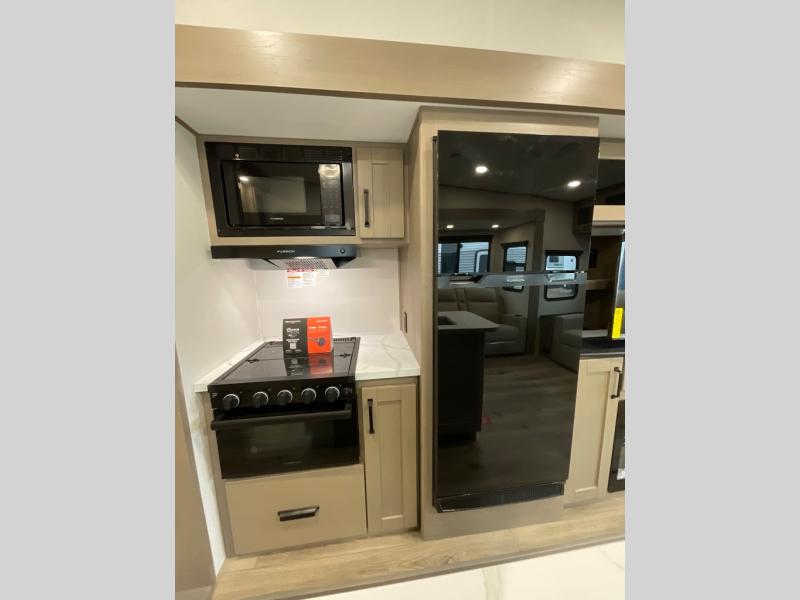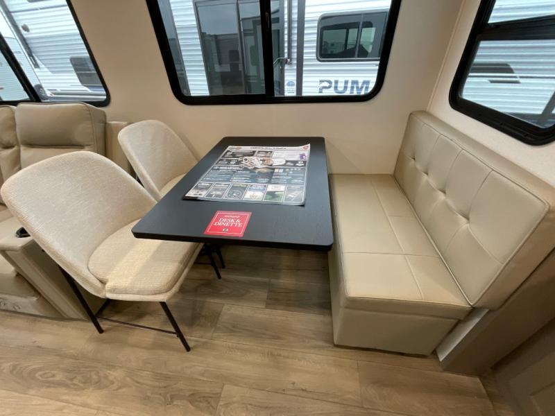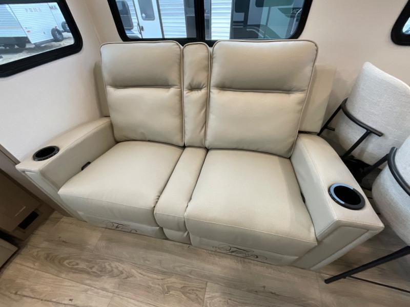 You'll love the amount of space you have in this fifth wheel thanks to the dual opposing slides in the rear living area/kitchen. Your friends and family can relax on the tri-fold sofa or theater seating across from the high-definition 40" LED TV. There is also a booth dinette or you can choose the optional swivel dinette if you prefer that seating. The chef of your group will appreciate having a kitchen island that will provide more counter space, plus there is a hutch with overhead cabinets for nice dishes. A full bath onboard lets you clean up each day and the front private bedroom includes a queen bed just like at home. You'll also love spending time outdoors under the electric awning, and there is an unobstructed pass-thru storage for fishing poles, hiking gear, and camp chairs!