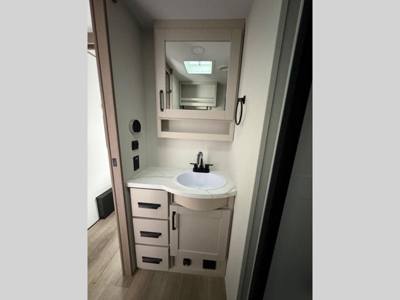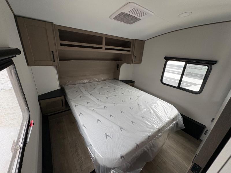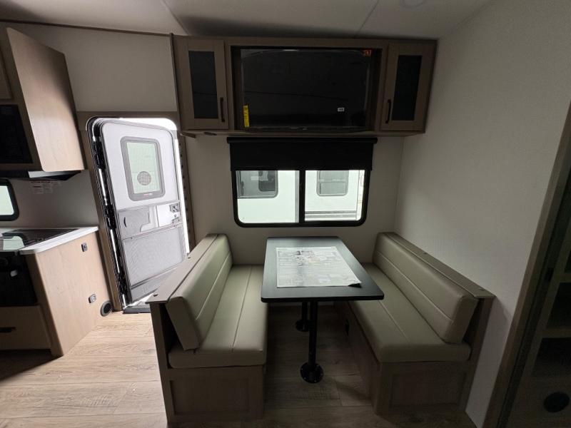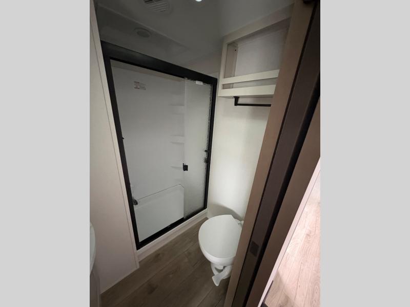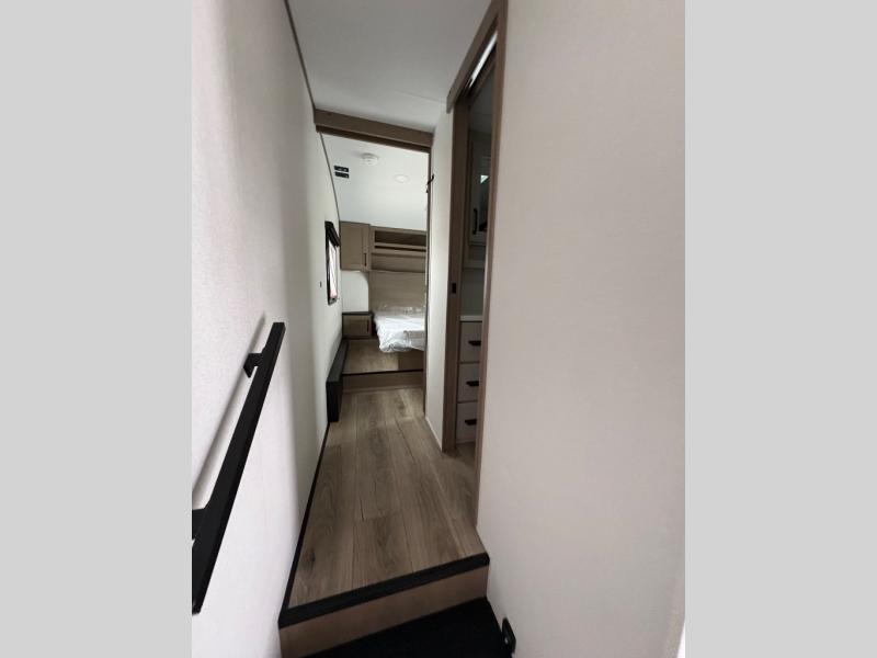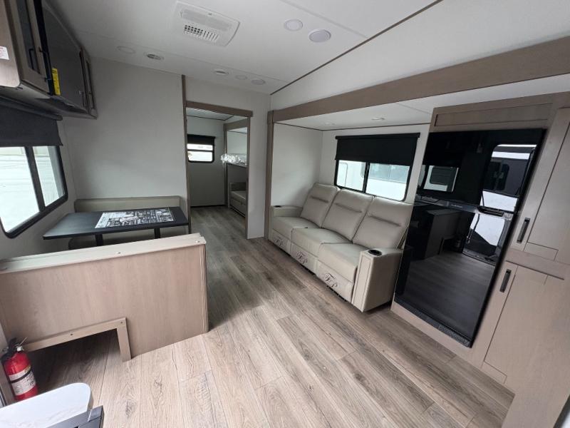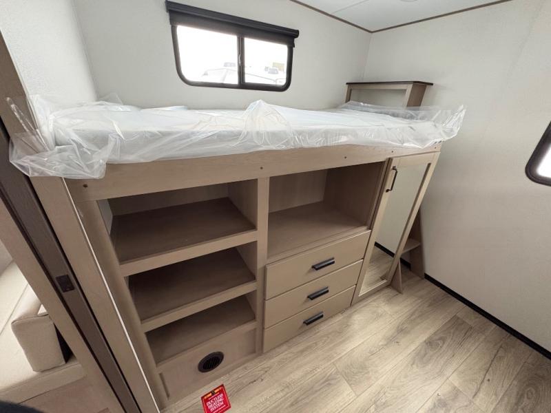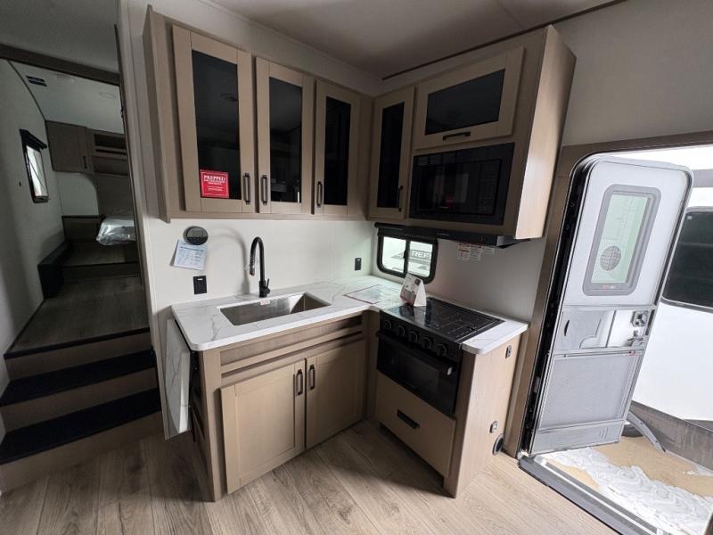 You will love this fifth wheel’s multiple sleeping spaces, such as the 36” flip top bunk offers flexible sleeping options for added capacity and comfort. A trundle bed provides an additional cozy sleeping space, ideal for guests or family members, and the 44” bunk bed with window features a comfortable sleeping area with natural light, ideal for kids or relaxation. Plus, the front bedroom boasts a queen bed, creating a peaceful retreat for rest and rejuvenation. In the living area, you will find a space that creates a warm and intimate spot for meals and conversation. The 40” TV delivers entertainment for relaxation and enjoyment, a theater seating provides immersive comfort for an exceptional viewing experience, and the well-appointed kitchen features a 10 cu ft refrigerator that ensures ample storage for fresh ingredients and beverages, a pantry, microwave, and a three-burner cooktop allows for versatile meal preparation. Finally, the full bathroom will complete the at-home experience, adding convenience to this model.