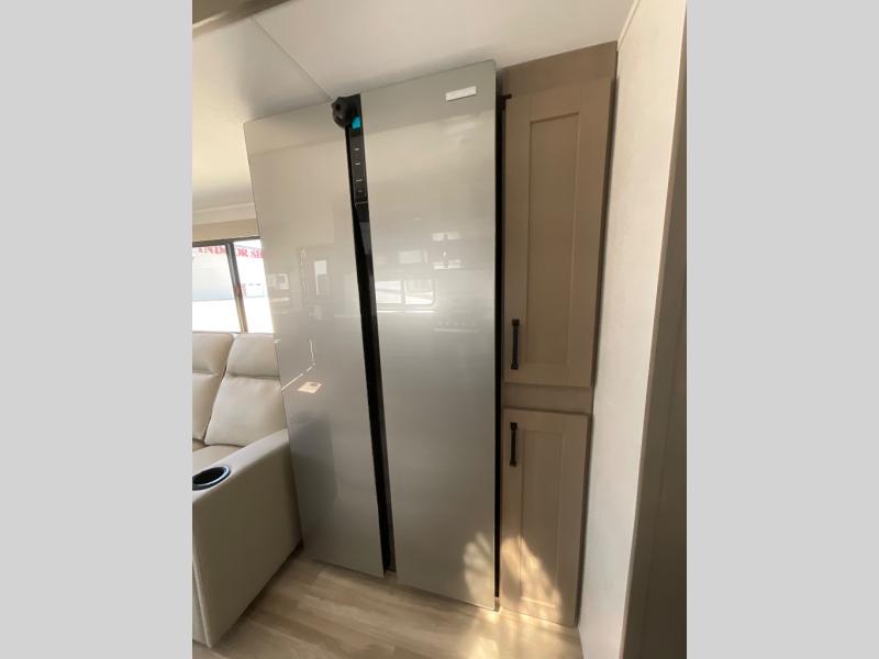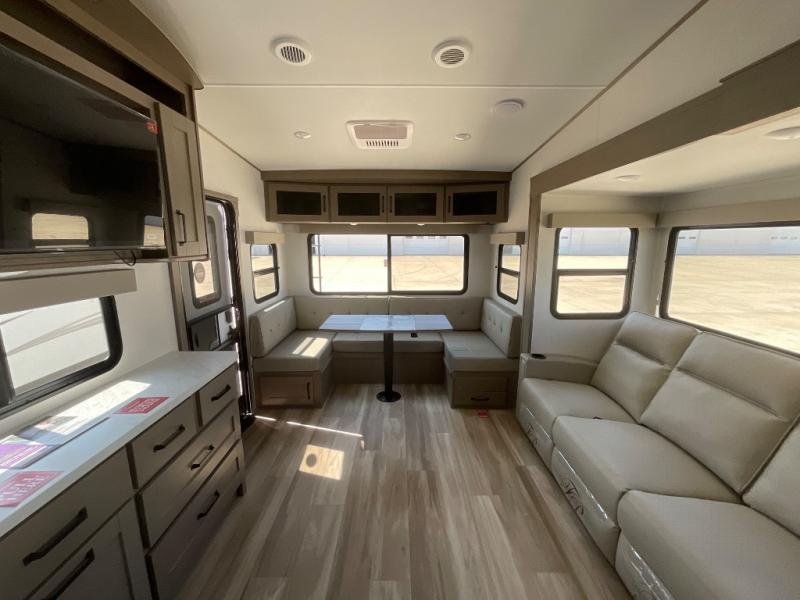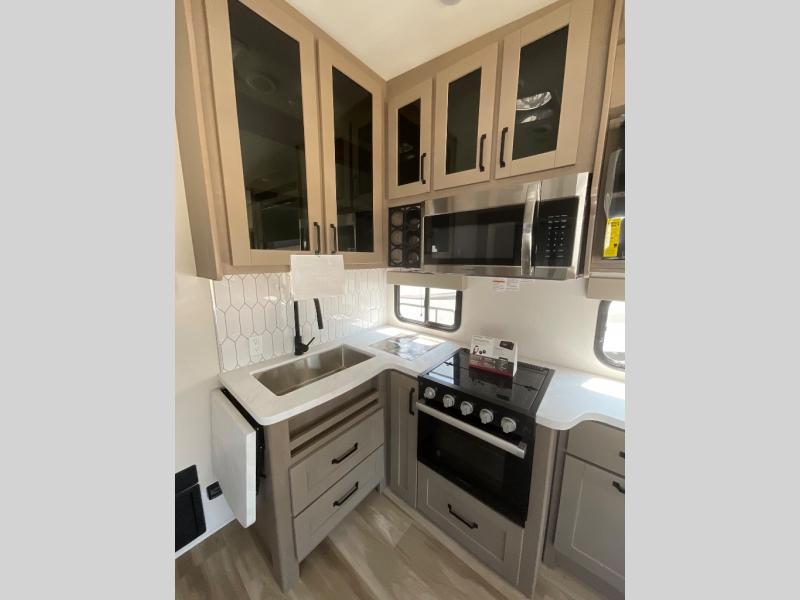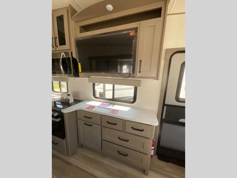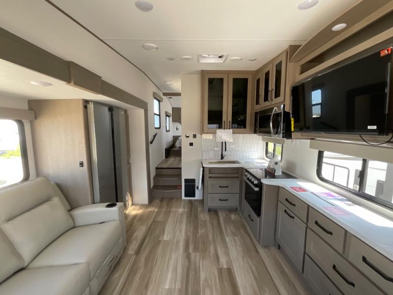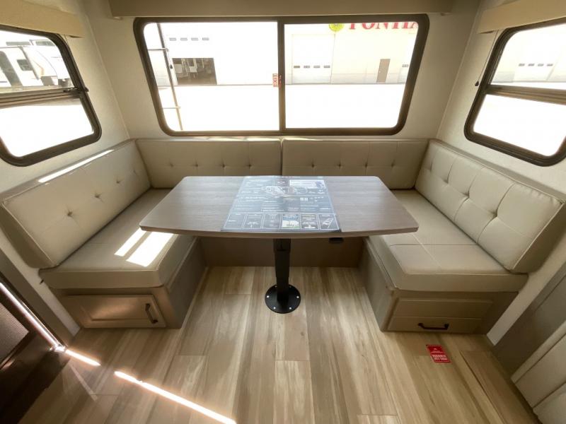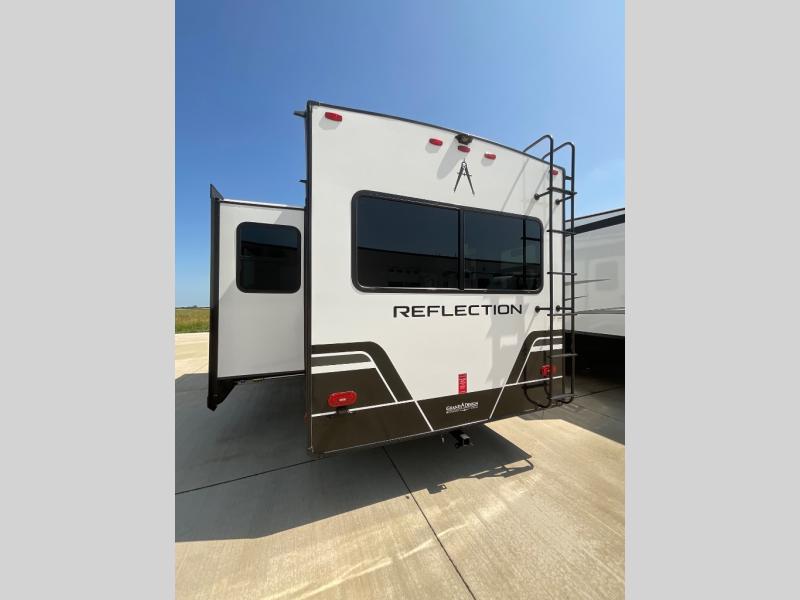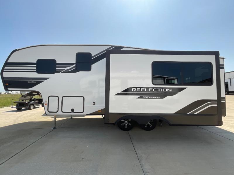 With any Reflection 150 Series fifth wheel by Grand Design, there is more available payload capacity and a broader range of half-ton trucks capable of towing this fifth wheel, and no slider hitch is needed thanks to the 90-degree turning radius which makes them short bed friendly and easier to tow. The mandatory Ultimate Power package provides a "One-Touch" automatic leveling system and a detachable power cord with LED light for easy setup, plus motion sensor pass-through lighting and entry lighting, and the Tire Linc TPMS will help you stay safe on the road. The interior offers residential luxury from the cabinetry and premium Congoleum flooring, to the booth dinette and residential-style window treatment. Make your refined decision today!