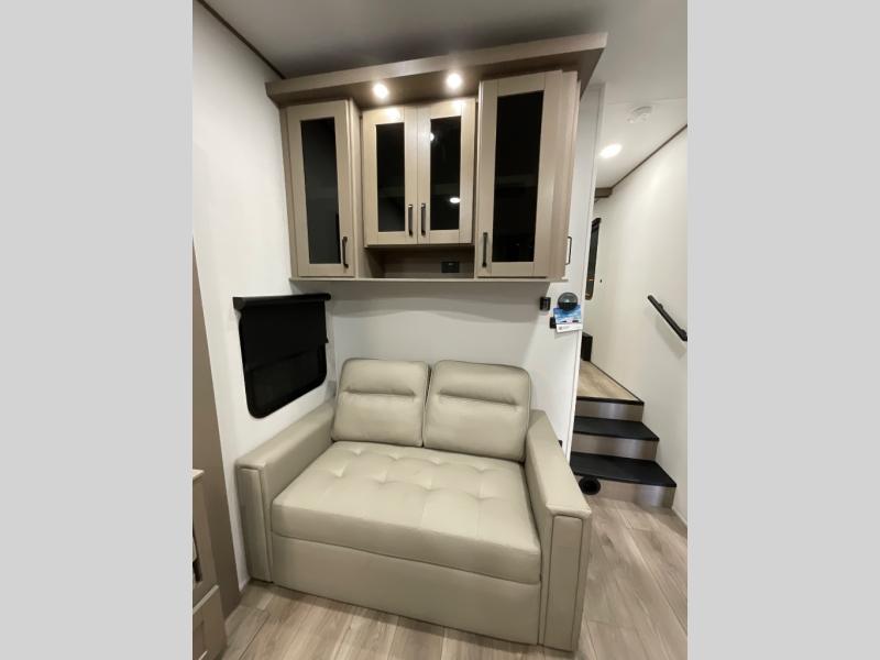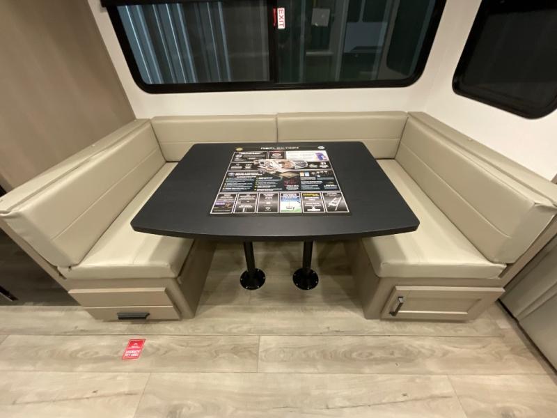 With any Reflection 150 Series fifth wheel by Grand Design, there is more available payload capacity and a broader range of half-ton trucks capable of towing this fifth wheel, and no slider hitch is needed thanks to the 90-degree turning radius which makes them short bed friendly and easier to tow. The mandatory Ultimate Power package provides a "One-Touch" automatic leveling system and a detachable power cord with LED light for easy setup, plus motion sensor pass-through lighting and entry lighting, and the Tire Linc TPMS will help you stay safe on the road. The interior offers residential cabinetry and premium Congoleum flooring, to the booth dinette and residential-style window treatment. Make your refined decision today!