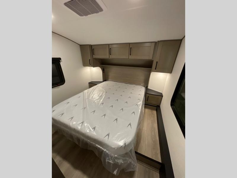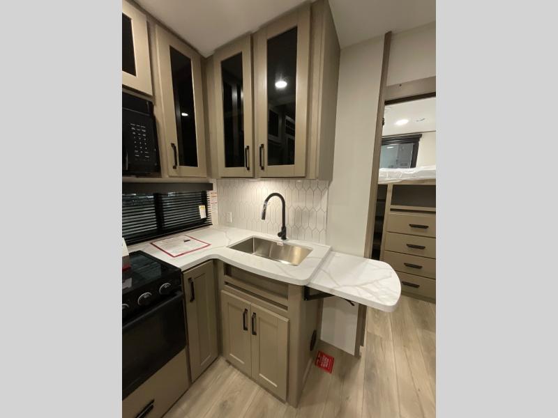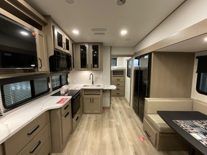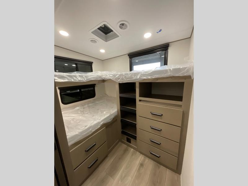The whole family will enjoy camping in this fifth wheel! The kiddos will love having their own privacy with the rear private bunkhouse that has a 30" top bunk above a set of drawers, a 34" top bunk above a 48" lower bunk, and a TV prep area. You will enjoy having your own private retreat too with a front private bedroom that has a queen bed for a good night's rest and a wardrobe for your hang up clothes. You could even transform the U-shaped dinette and tri-fold sofa into extra sleeping spaces, and the dinette could be switched out for the optional 78" theater seating. The chef will have an easy time preparing their best dishes with the three burner cooktop and flip-up countertop or they can breathe in some fresh air while they cook on the outside griddle and 1.6 cu. ft. refrigerator for a cold beverage!