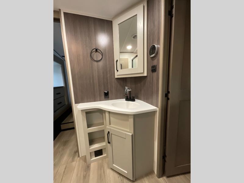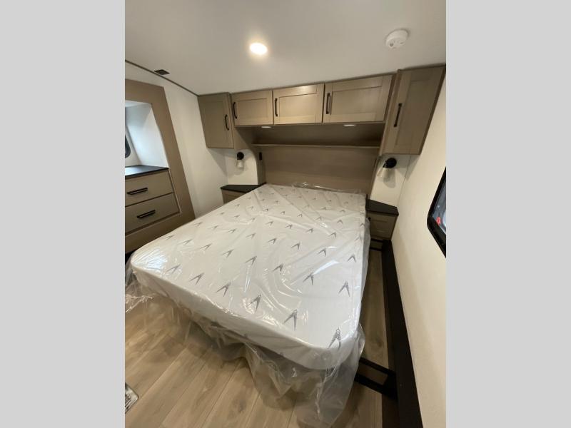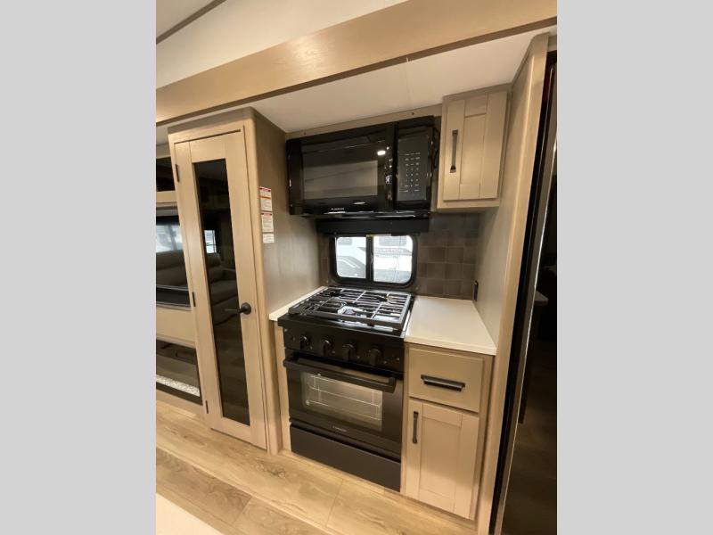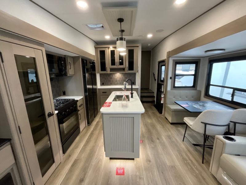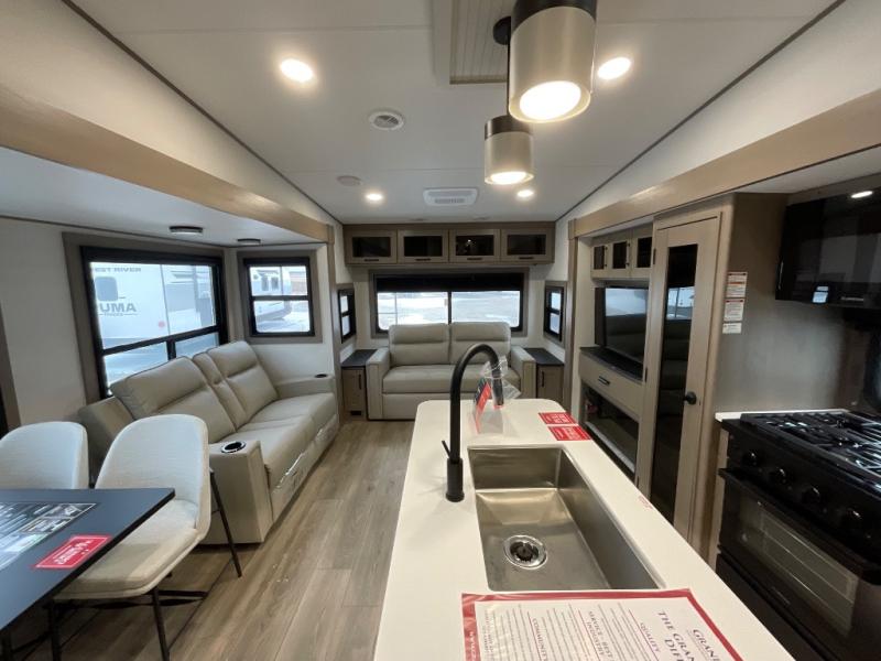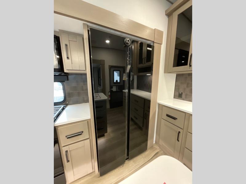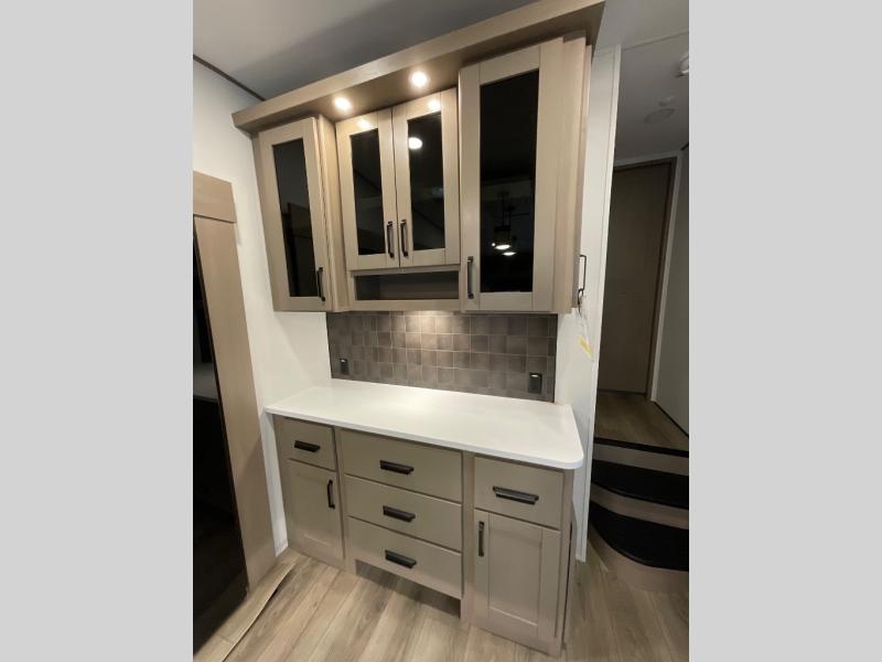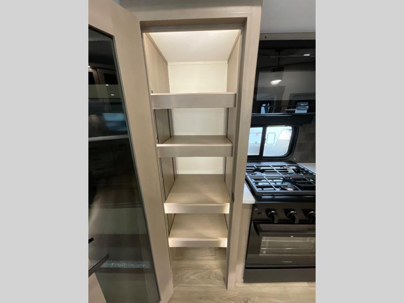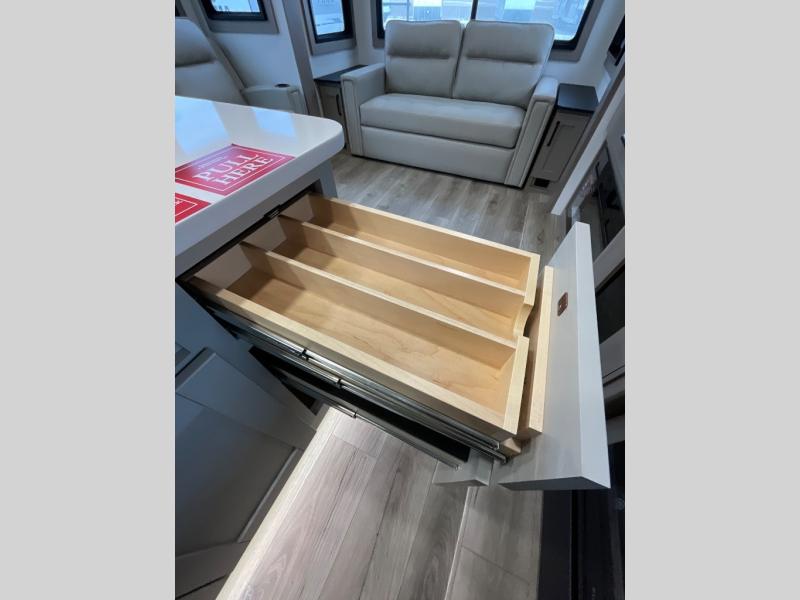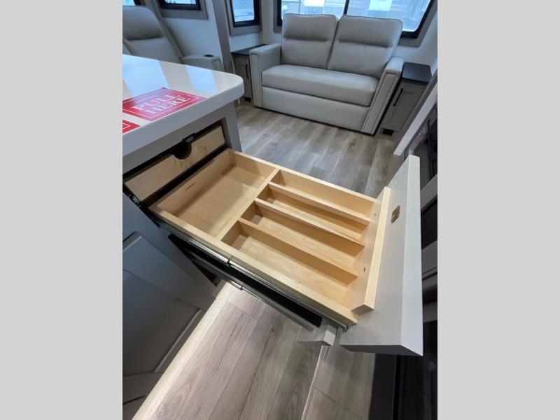 Whether you travel for pleasure or work, you will love the spacious main living and kitchen area with a rear tri-fold sofa that doubles as extra sleeping space, and the theater seating directly across from the entertainment center with a 40" LED HDTV and a fireplace below. The kitchen island will make meal prepping and drying the dishes easier and the hutch is the perfect place to place your picture frames, nice dishes, and extra cooking items. There is even a pantry that is big enough to store all of your favorite snacks, dry ingredients and such. Outside you can enjoy two electric awnings that provide protection from the elements as you relax and visit with other RVers, and your camping chairs can easily be stored in the pass-through compartment. The double entry bathroom is convenient especially at night when you can slide the door to enter from the front master bedroom. You will find plenty of storage for your clothing and gear, plus the bedroom slide out gives you drawers and linen storage that stretches into the full bathroom.