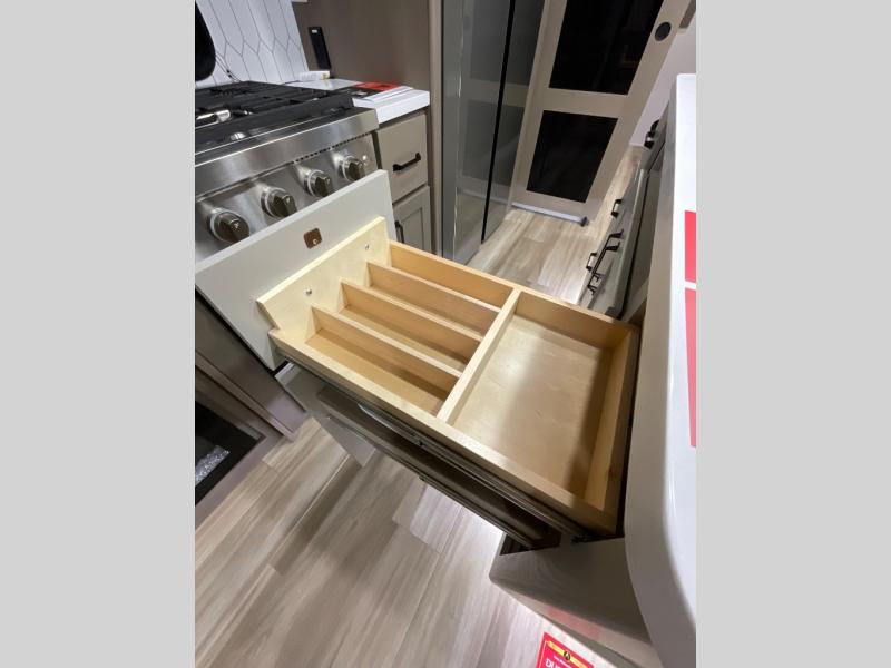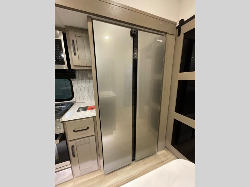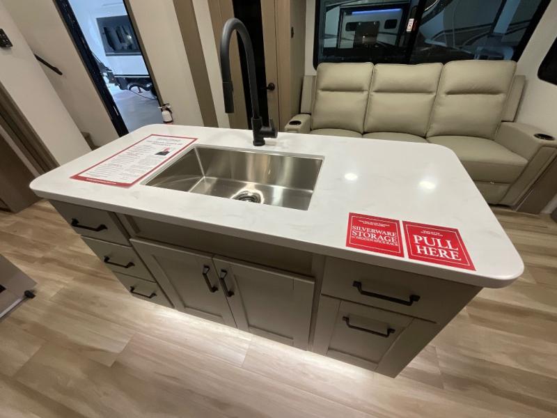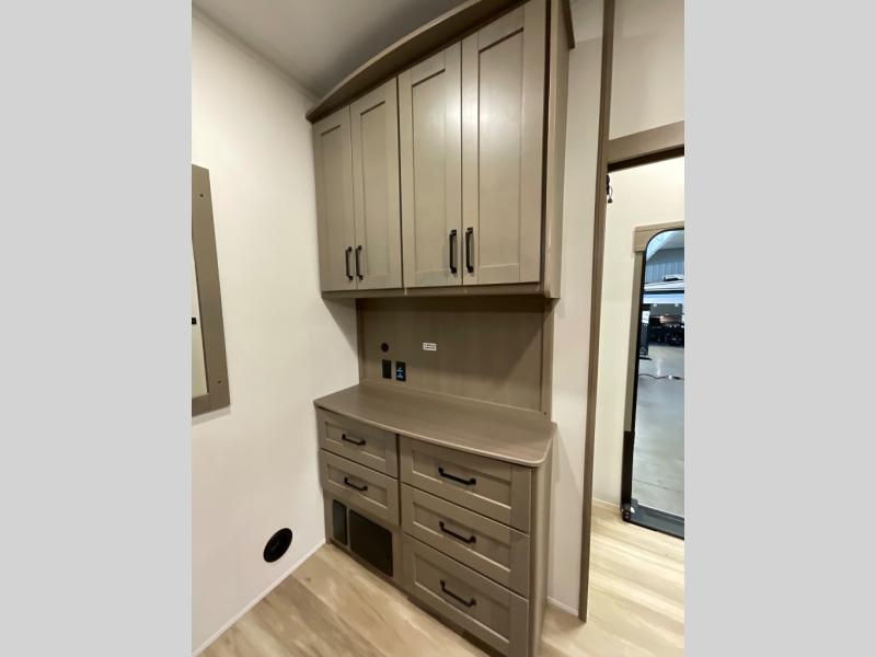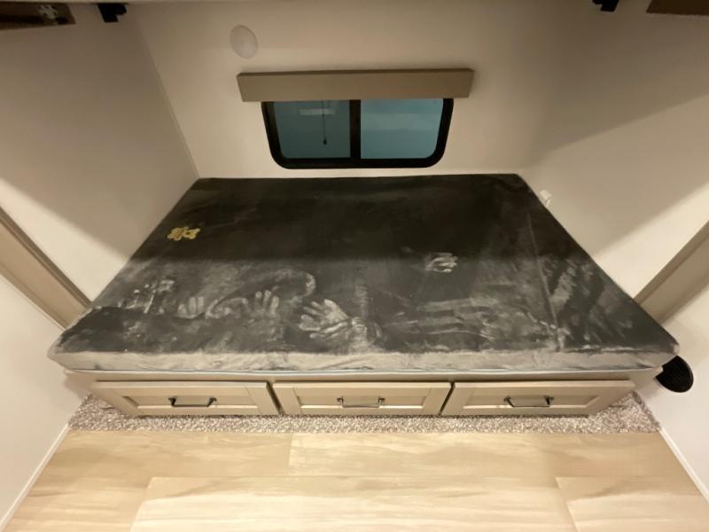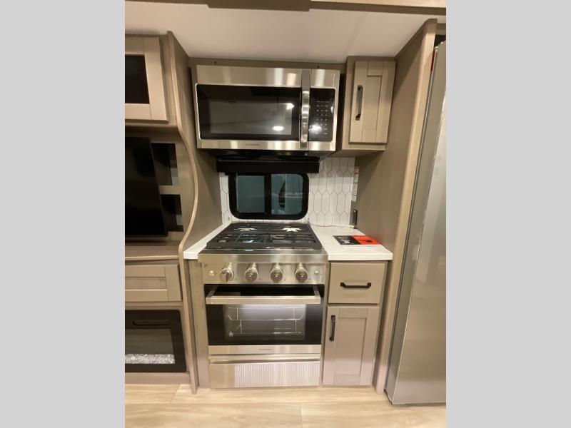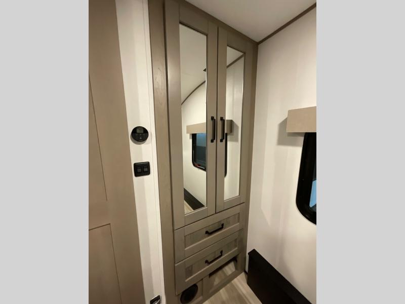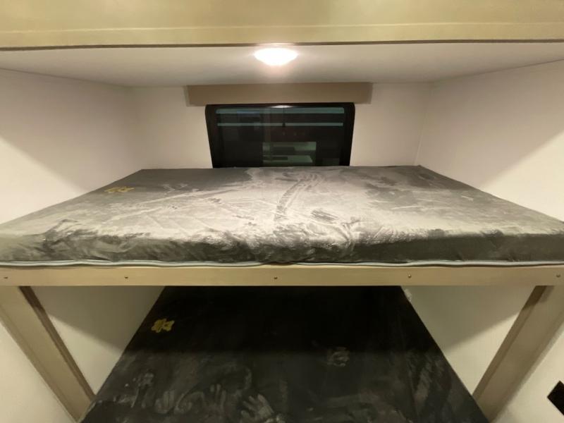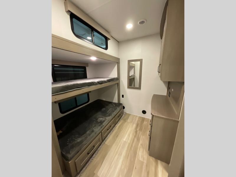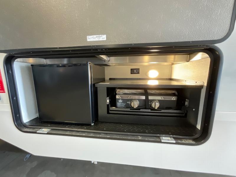 When you are looking for a versatile extra room for either a second bedroom or living area as well as an office, this middle bunkhouse might just work! There is a slide out with two bunks and drawers plus a dresser. You can sleep like a queen on the walk-around bed in the front private bedroom that offers more clothing storage and windows for views. The rear main living and kitchen area provides plenty of seating on the a 78" triple person theater seats, and on the 92" U-shaped lounge with table with windows within the slide for natural lighting and great views. The kitchen island gives the cook more space to make and serve meals, and the gourmet kitchen includes a 16 cu. ft. refrigerator, plus a pantry for dry goods. There is an exterior outside kitchen with a griddle and a 1.6 cu. ft. refrigerator for beverages and such, plus you will find an LP quick connect, Coax TV hookup, and a spray port to wash off your dirty shoes.