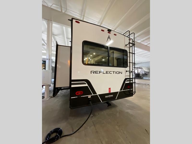 With any Reflection fifth wheel by Grand Design, you will have a solar panel for off-grid camping and a 60 amp charge controller and inverter prep, a Universal All-In-One docking station, unobstructed pass-through storage, and Goodyear Endurance tires. Each is constructed of gel coat exterior sidewalls, residential 5" truss rafters, walk-on roof decking, a fiberglass and radiant foil roof and front cap insulation plus laminated aluminum framed side walls, roof and end walls in slide rooms. Head inside to enjoy residential hardwood cabinet doors, premium Congoleum flooring, a spacious shower with a glass door, and many more comforts!