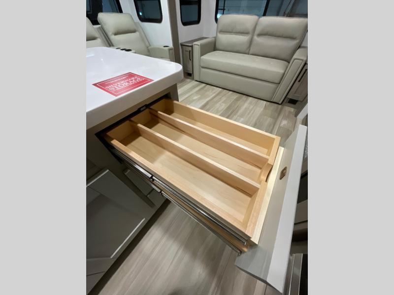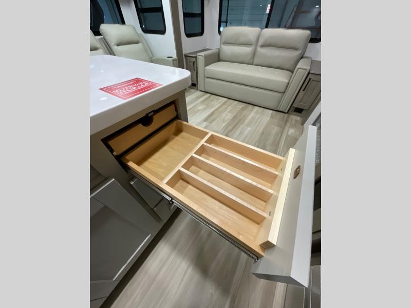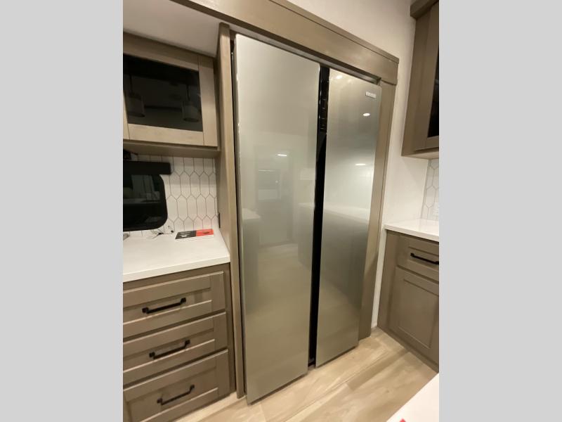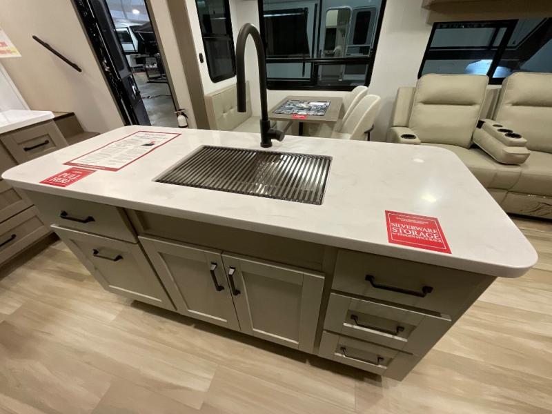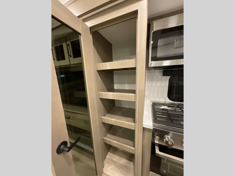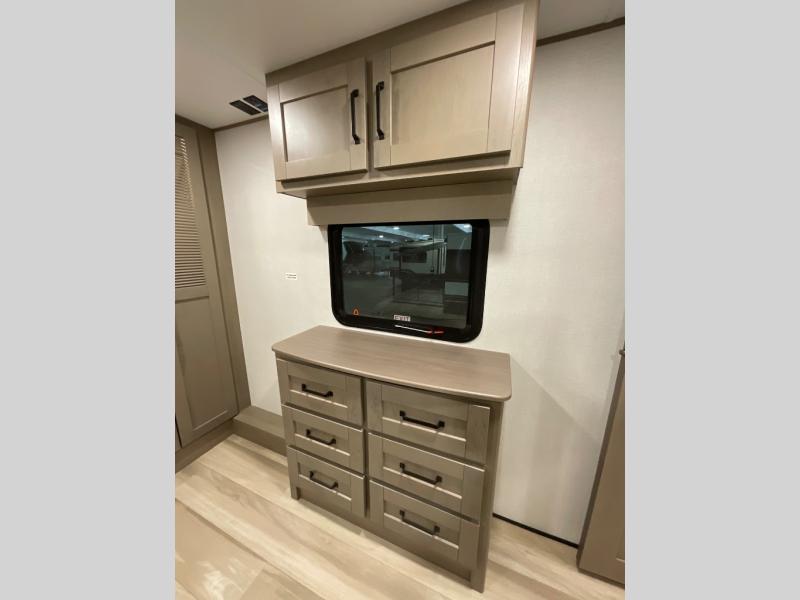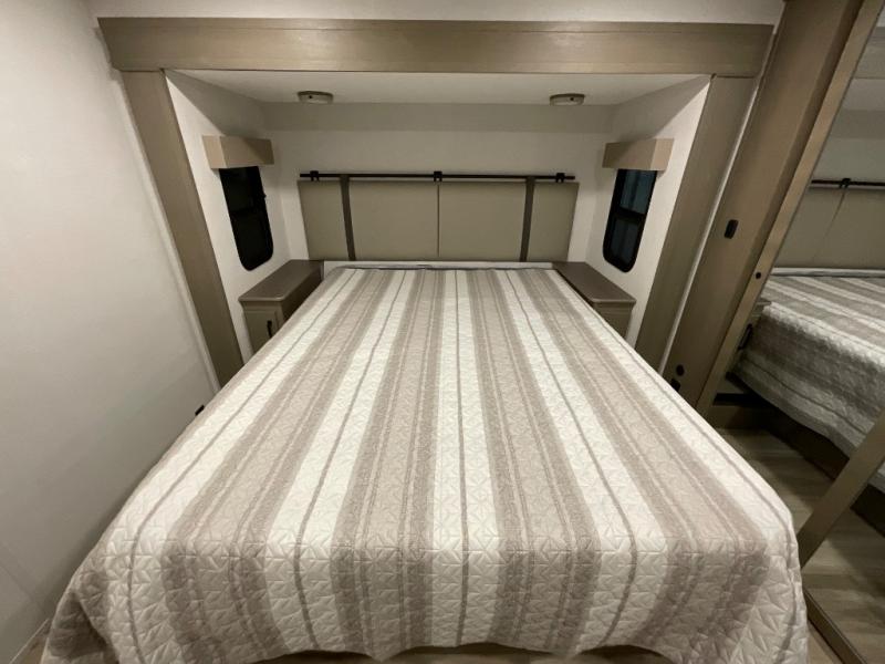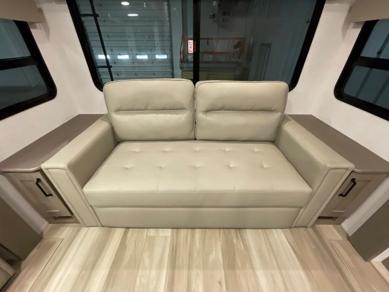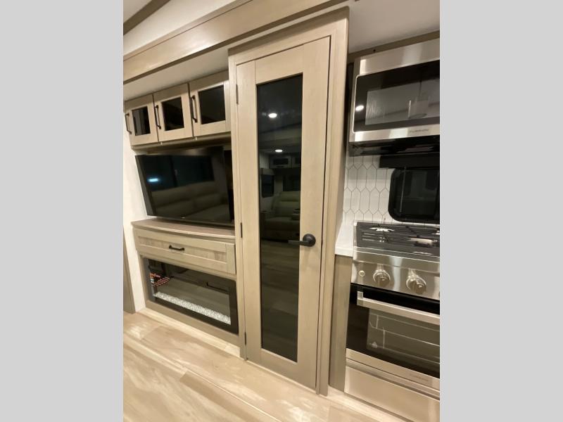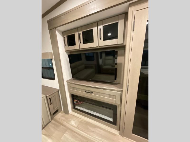 You can enjoy a spacious rear living area in this RV with dual opposing slides offering you entertainment, kitchen amenities, seating and windows for great views! The rear tri-fold sofa also converts into extra sleeping space for an extra guest or two, just like the booth dinette does. Yet you might like to add the swivel dinette option. There are theater seats to enjoy while you place your drinks in the cupholders and watch the entertainment center with a 40" LED HDTV and fireplace. The pantry is big enough to store your favorite snacks, and the kitchen island will make meal prepping easier, plus there is a 16 cu. ft. refrigerator to store any leftovers. The full bathroom has a 30" x 48" fiberglass shower and a linen closet to store your towels. The front private bedroom has a comfortable queen bed slide that can be switched out for the optional king bed, a dresser with overhead cabinets, and a full wall wardrobe that is prepped to add the optional washer and dryer so that you can extend your camping trip with clean clothes!
