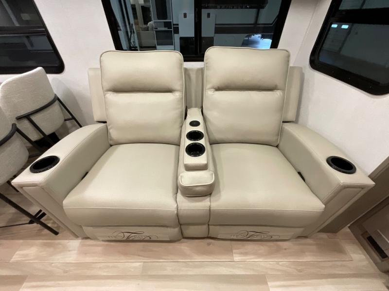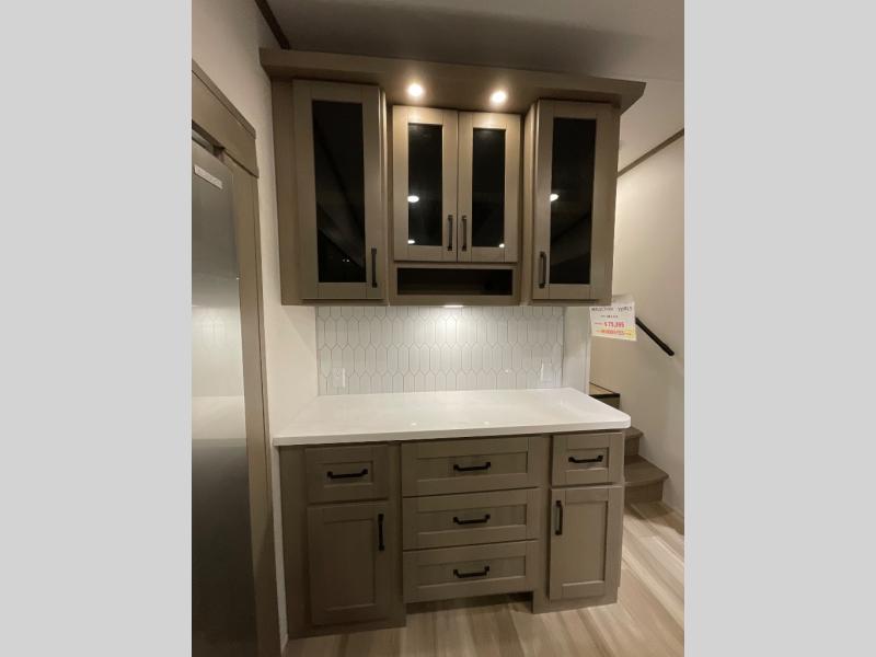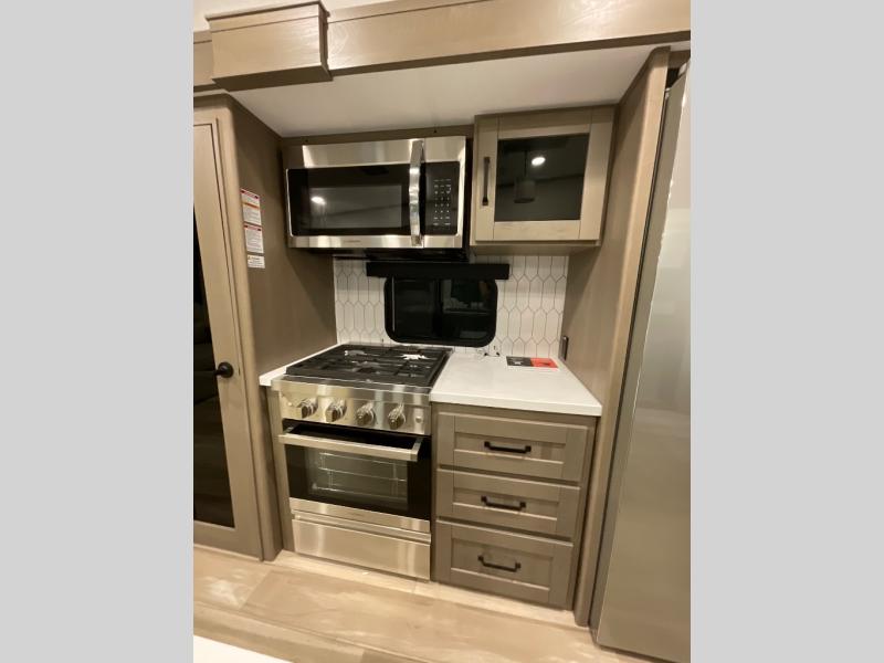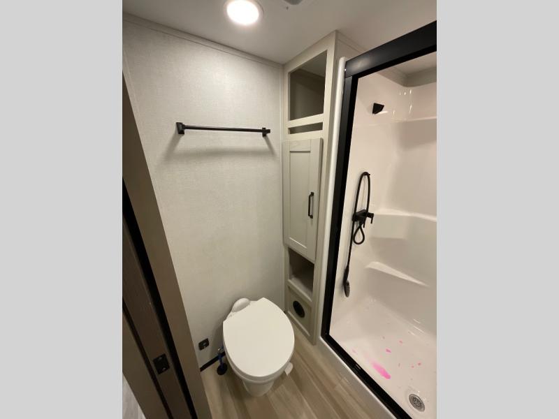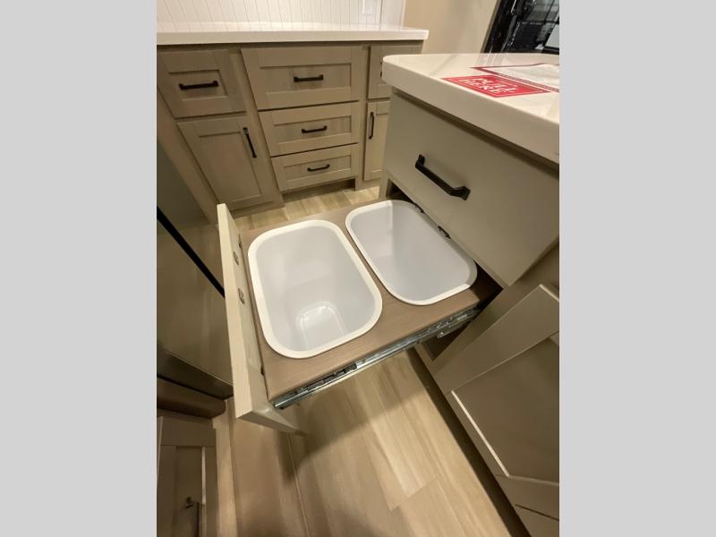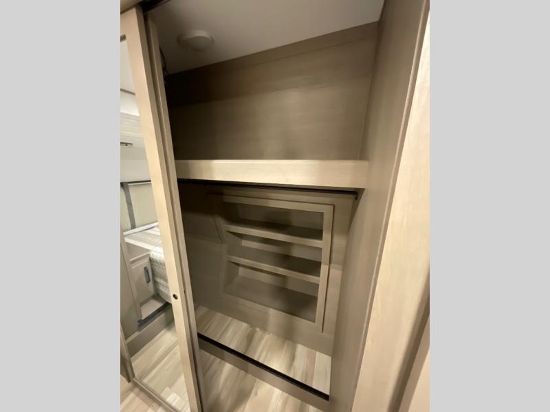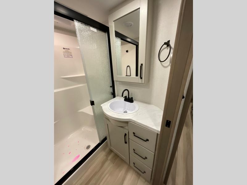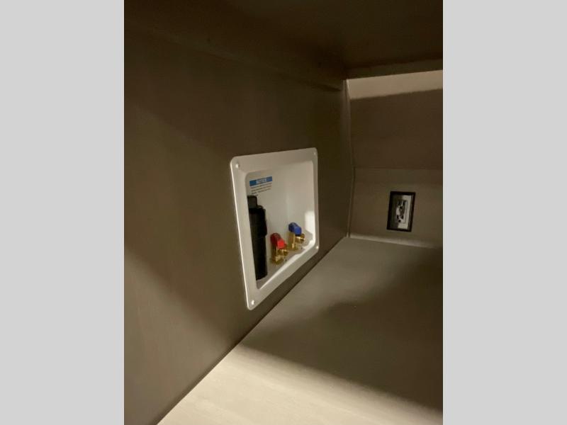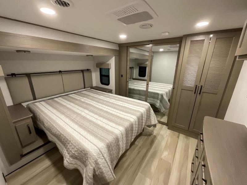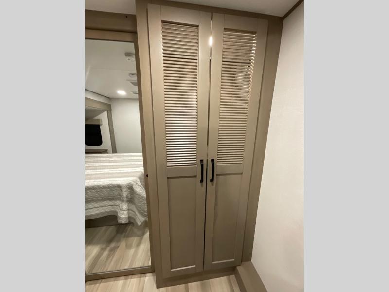 You can enjoy a spacious rear living area in this RV with dual opposing slides offering you entertainment, kitchen amenities, seating and windows for great views! The rear tri-fold sofa also converts into extra sleeping space for an extra guest or two, just like the booth dinette does. Yet you might like to add the swivel dinette option. There are theater seats to enjoy while you place your drinks in the cupholders and watch the entertainment center with a 40" LED HDTV and fireplace. The pantry is big enough to store your favorite snacks, and the kitchen island will make meal prepping easier, plus there is a 16 cu. ft. refrigerator to store any leftovers. The full bathroom has a 30" x 48" fiberglass shower and a linen closet to store your towels. The front private bedroom has a comfortable queen bed slide that can be switched out for the optional king bed, a dresser with overhead cabinets, and a full wall wardrobe that is prepped to add the optional washer and dryer so that you can extend your camping trip with clean clothes!