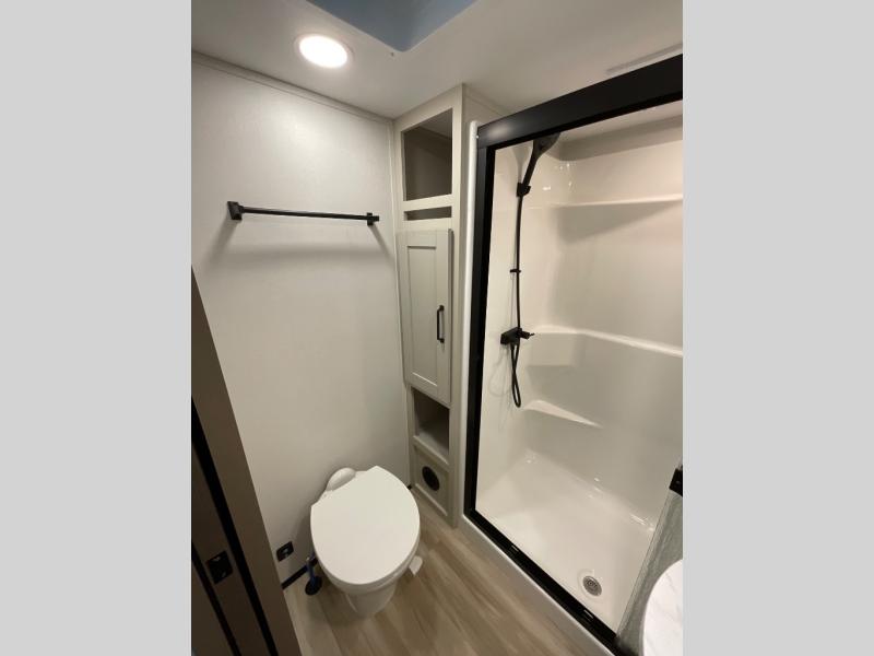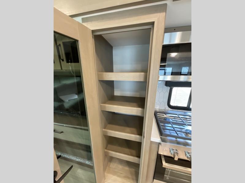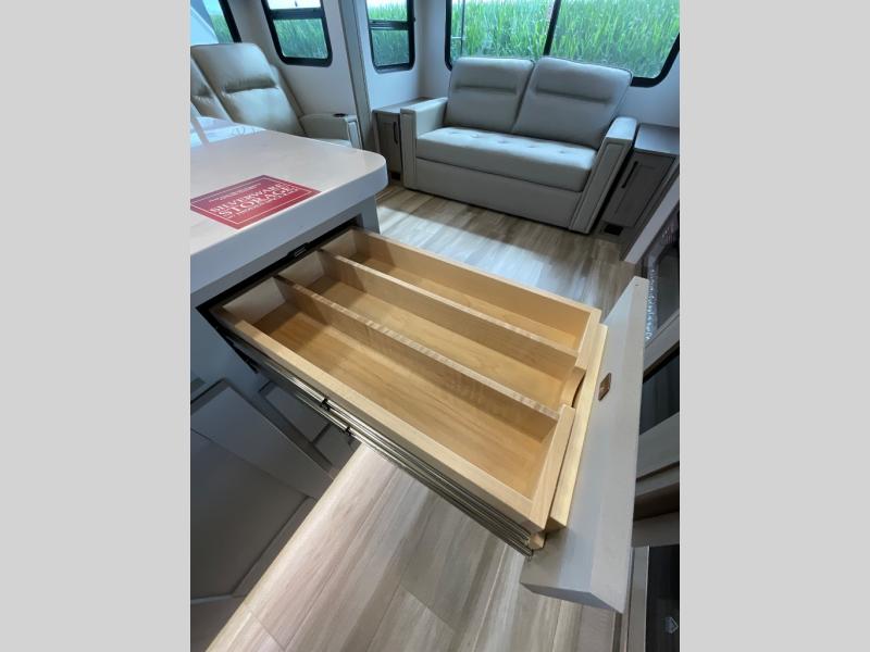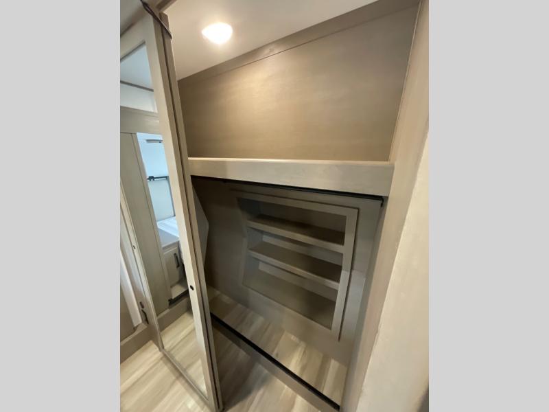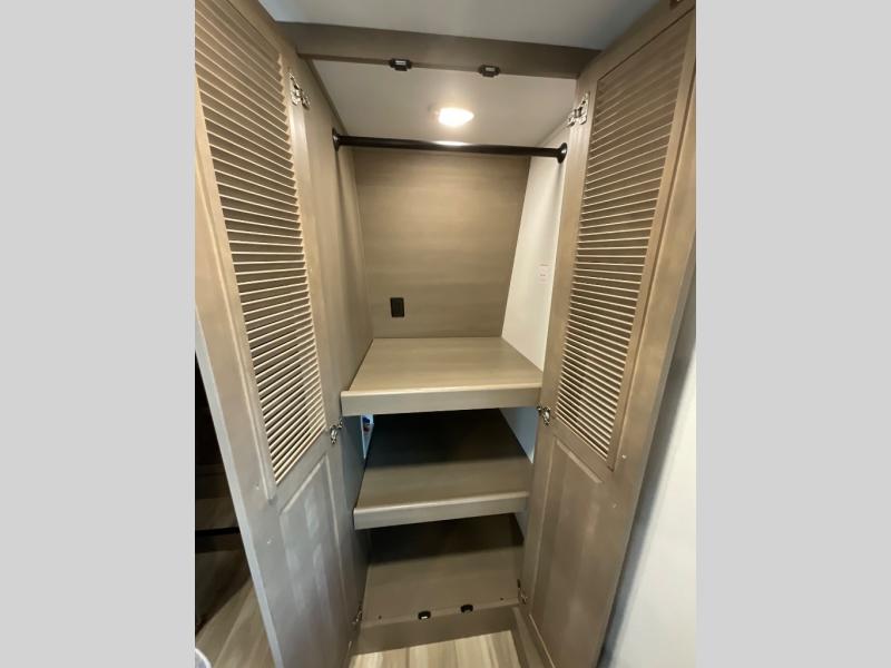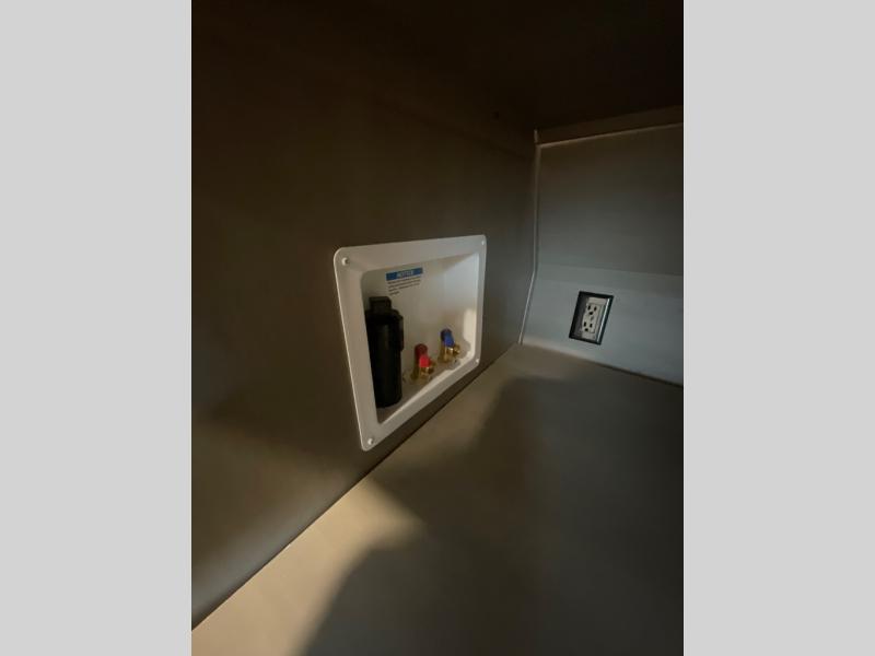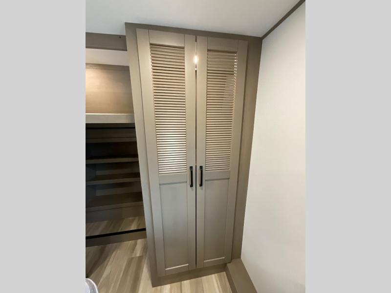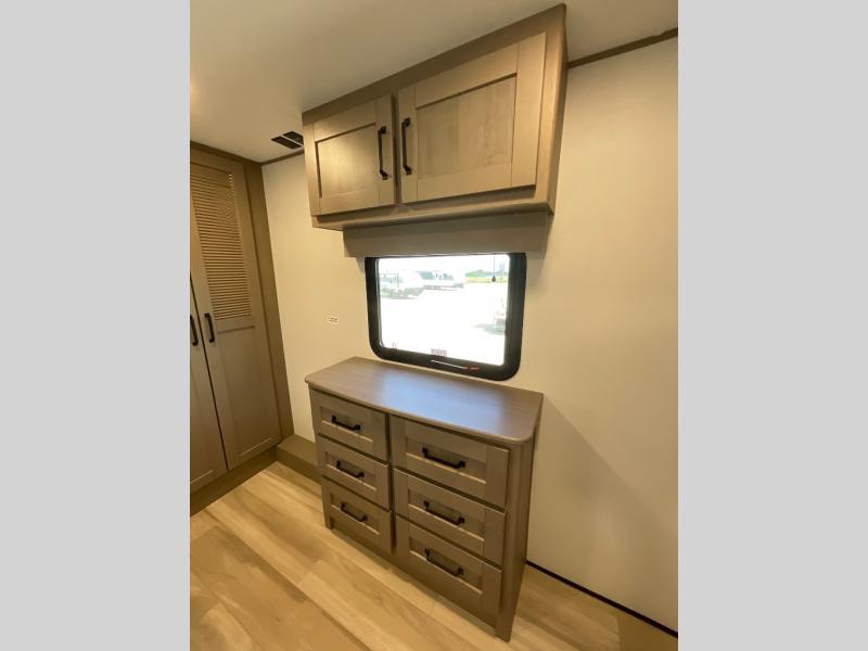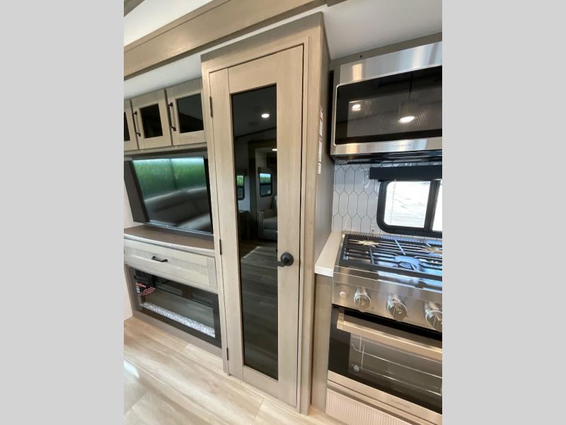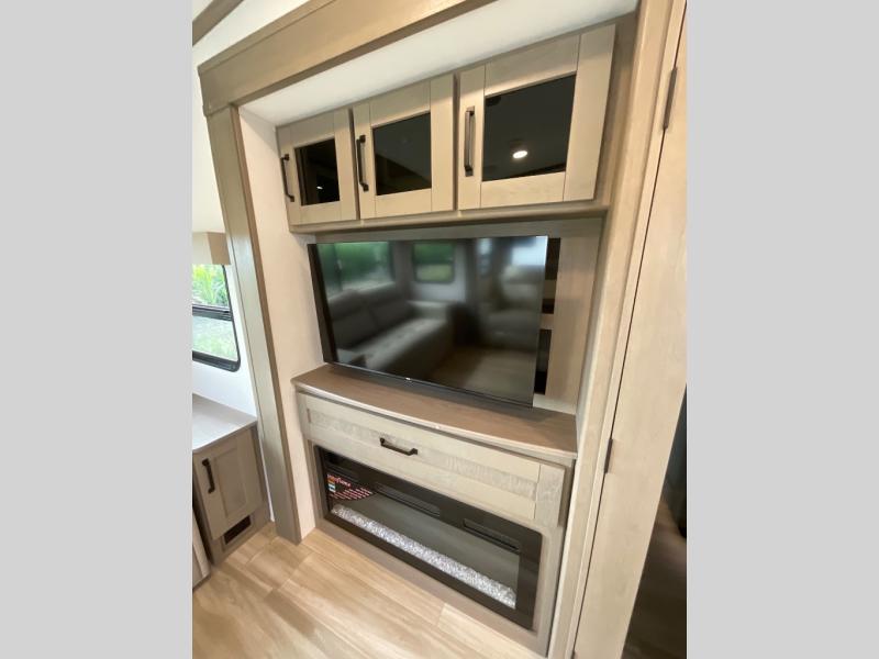 You can enjoy a spacious rear living area in this RV with dual opposing slides offering you entertainment, kitchen amenities, seating and windows for great views! The rear tri-fold sofa also converts into extra sleeping space for an extra guest or two, just like the booth dinette does. Yet you might like to add the swivel dinette option. There are theater seats to enjoy while you place your drinks in the cupholders and watch the entertainment center with a 40" LED HDTV and fireplace. The pantry is big enough to store your favorite snacks, and the kitchen island will make meal prepping easier, plus there is a 16 cu. ft. refrigerator to store any leftovers. The full bathroom has a 30" x 48" fiberglass shower and a linen closet to store your towels. The front private bedroom has a comfortable queen bed slide that can be switched out for the optional king bed, a dresser with overhead cabinets, and a full wall wardrobe that is prepped to add the optional washer and dryer so that you can extend your camping trip with clean clothes!