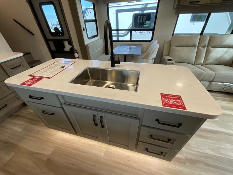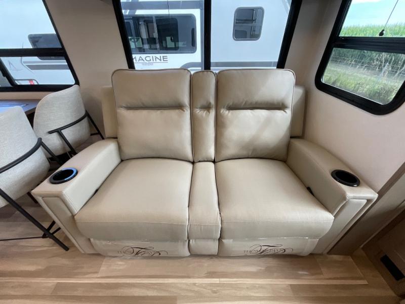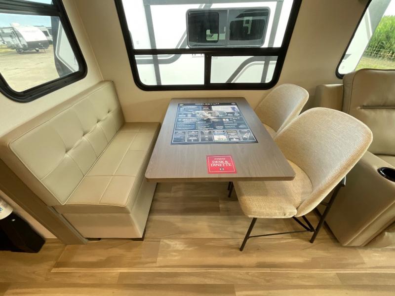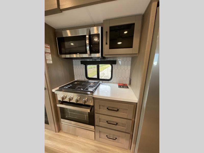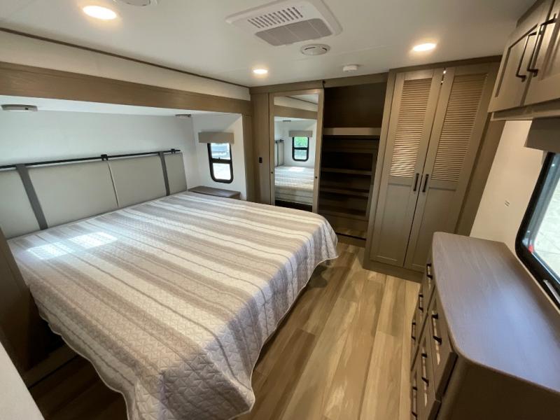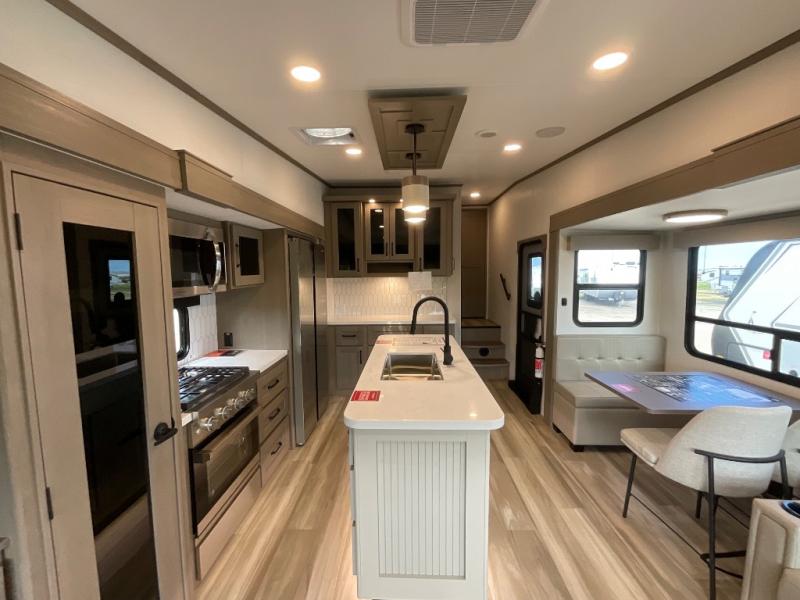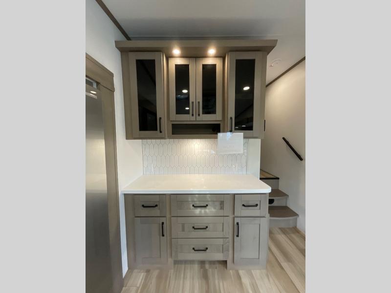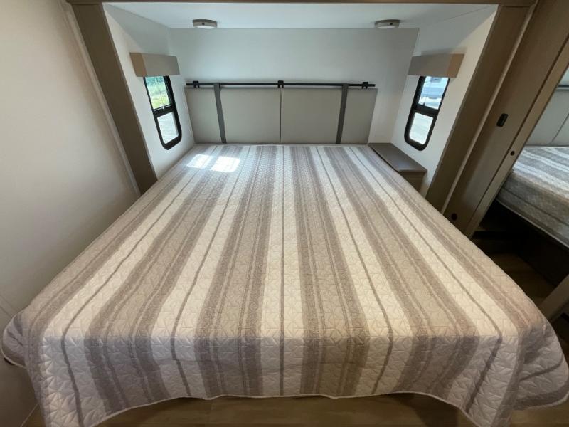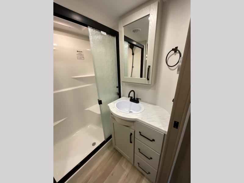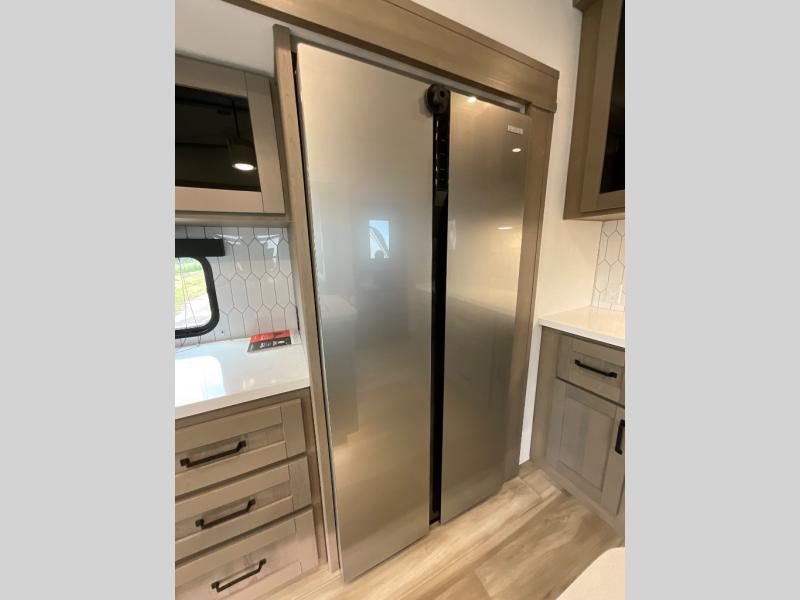 You can enjoy a spacious rear living area in this RV with dual opposing slides offering you entertainment, kitchen amenities, seating and windows for great views! The rear tri-fold sofa also converts into extra sleeping space for an extra guest or two, just like the booth dinette does. Yet you might like to add the swivel dinette option. There are theater seats to enjoy while you place your drinks in the cupholders and watch the entertainment center with a 40" LED HDTV and fireplace. The pantry is big enough to store your favorite snacks, and the kitchen island will make meal prepping easier, plus there is a 16 cu. ft. refrigerator to store any leftovers. The full bathroom has a 30" x 48" fiberglass shower and a linen closet to store your towels. The front private bedroom has a comfortable queen bed slide that can be switched out for the optional king bed, a dresser with overhead cabinets, and a full wall wardrobe that is prepped to add the optional washer and dryer so that you can extend your camping trip with clean clothes!