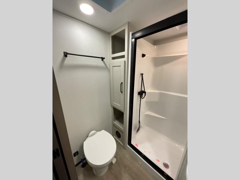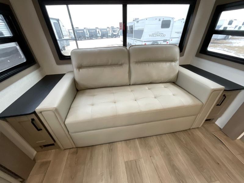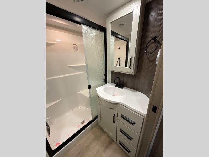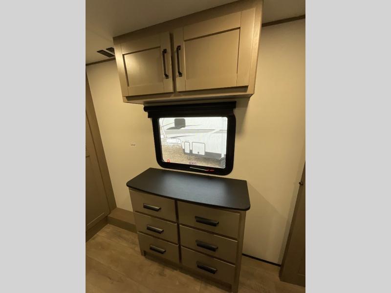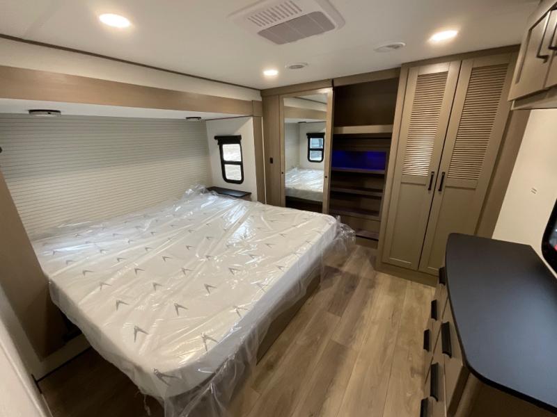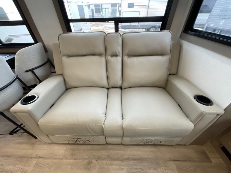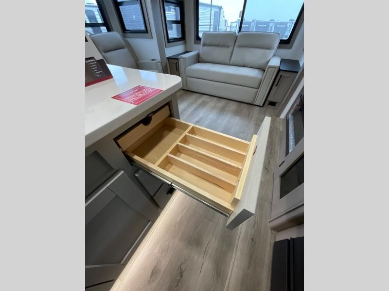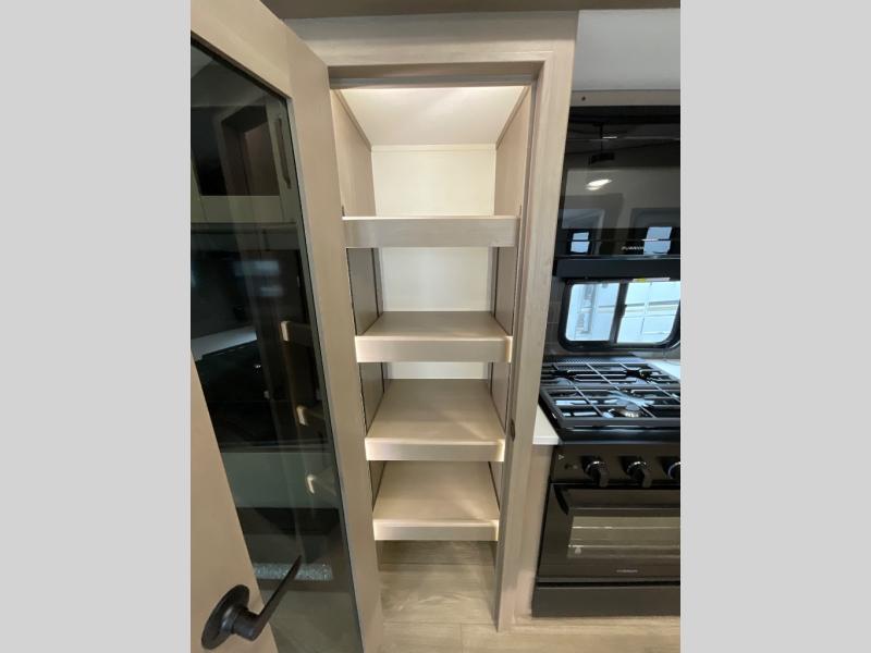You can enjoy a spacious rear living area in this RV with dual opposing slides offering you entertainment, kitchen amenities, seating and windows for great views! The rear tri-fold sofa also converts into extra sleeping space for an extra guest or two, just like the booth dinette does. Yet you might like to add the swivel dinette option. There are theater seats to enjoy while you place your drinks in the cupholders and watch the entertainment center with a 40" LED HDTV and fireplace. The pantry is big enough to store your favorite snacks, and the kitchen island will make meal prepping easier, plus there is a 16 cu. ft. refrigerator to store any leftovers. The full bathroom has a 30" x 48" fiberglass shower and a linen closet to store your towels. The front private bedroom has a comfortable queen bed slide that can be switched out for the optional king bed, a dresser with overhead cabinets, and a full wall wardrobe that is prepped to add the optional washer and dryer so that you can extend your camping trip with clean clothes!
